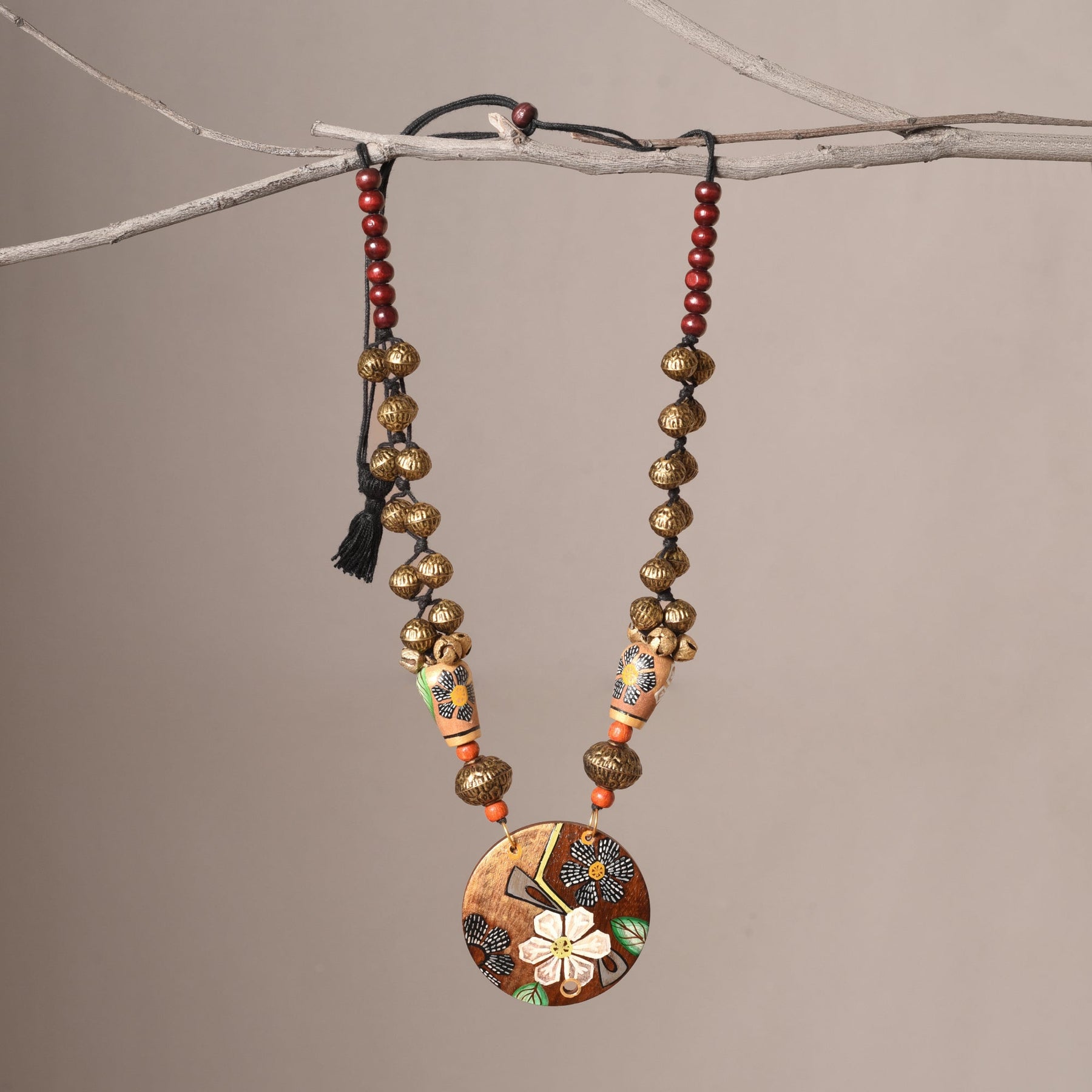 Embrace elegance with our Monochrome Blossom Ghungroo Necklace, featuring hand-painted white and black flowers beaded with hand-painted wooden and brass beads. Adorned with ghungroos, it exudes artisanal charm and sophistication.