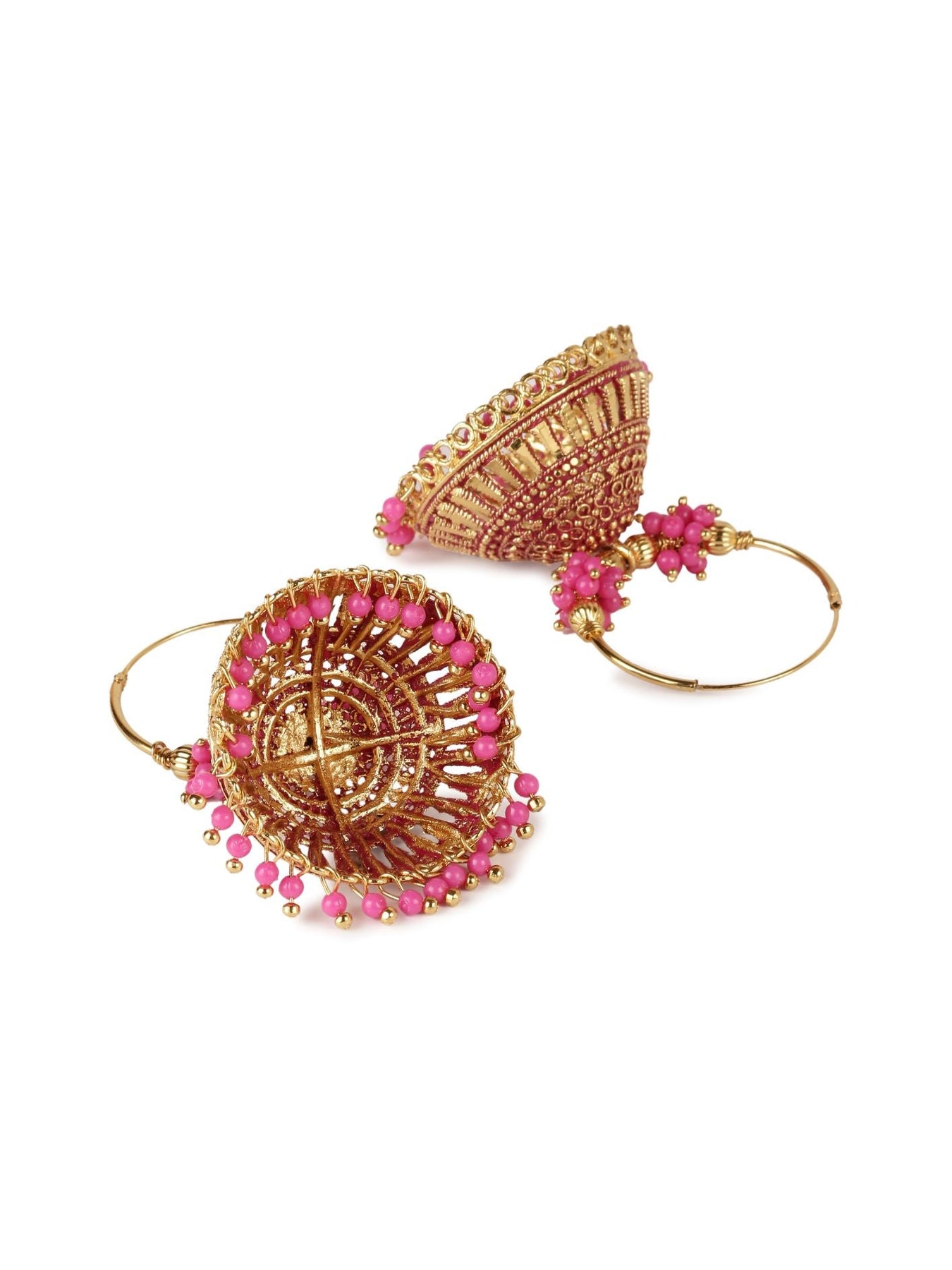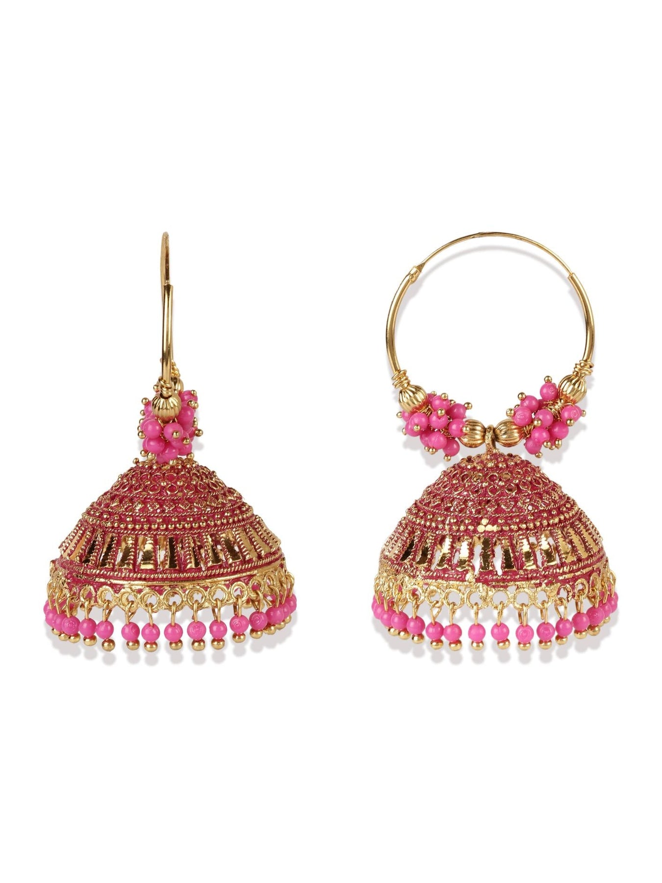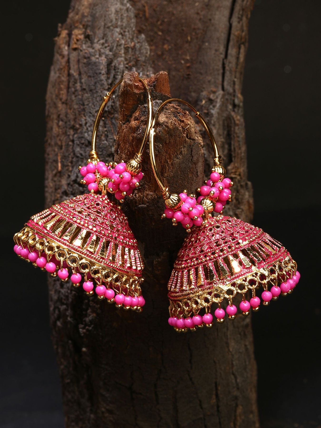 Pink & Gold-Plated Enamelled Dome Shaped Jhumkas Secured With Lever Back Closure, Details: Enamelled