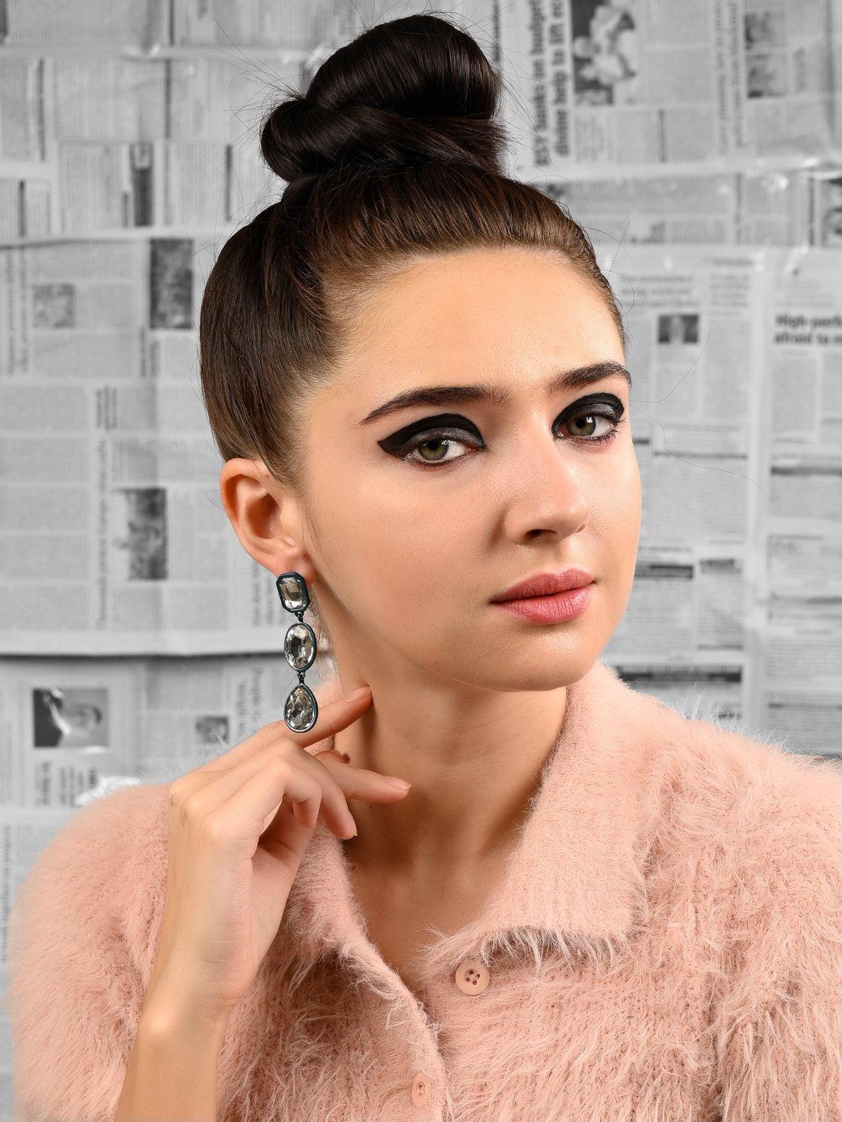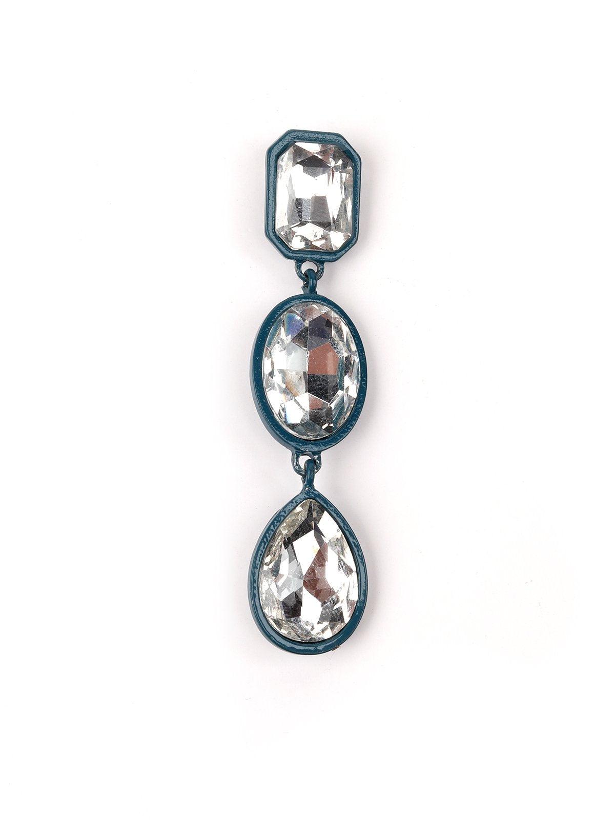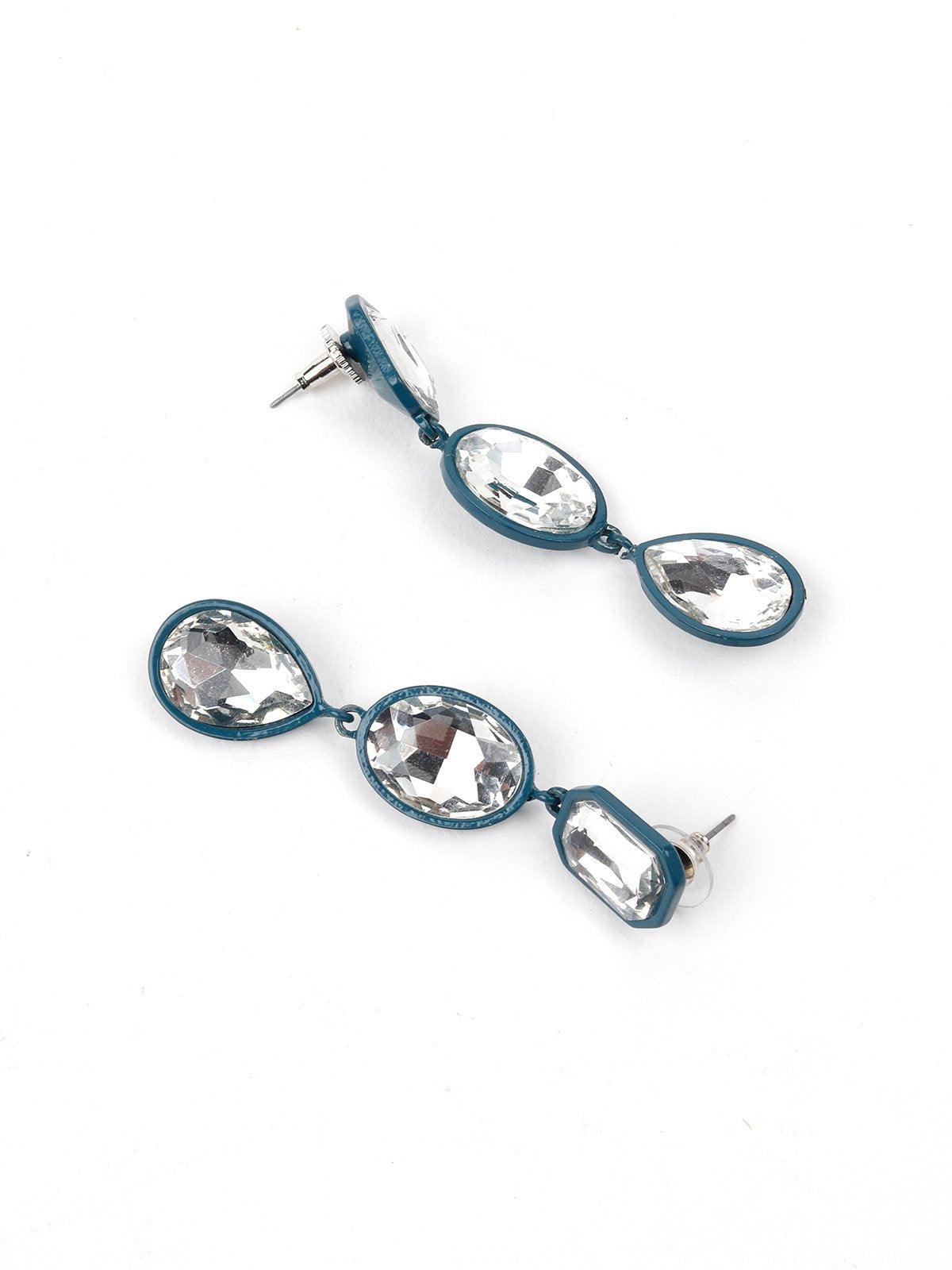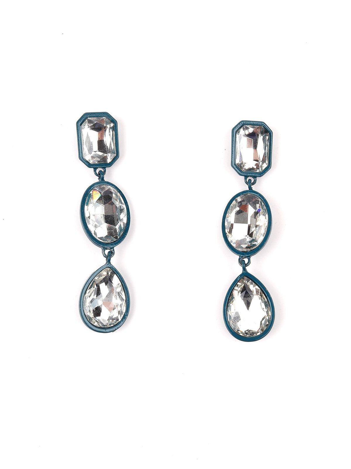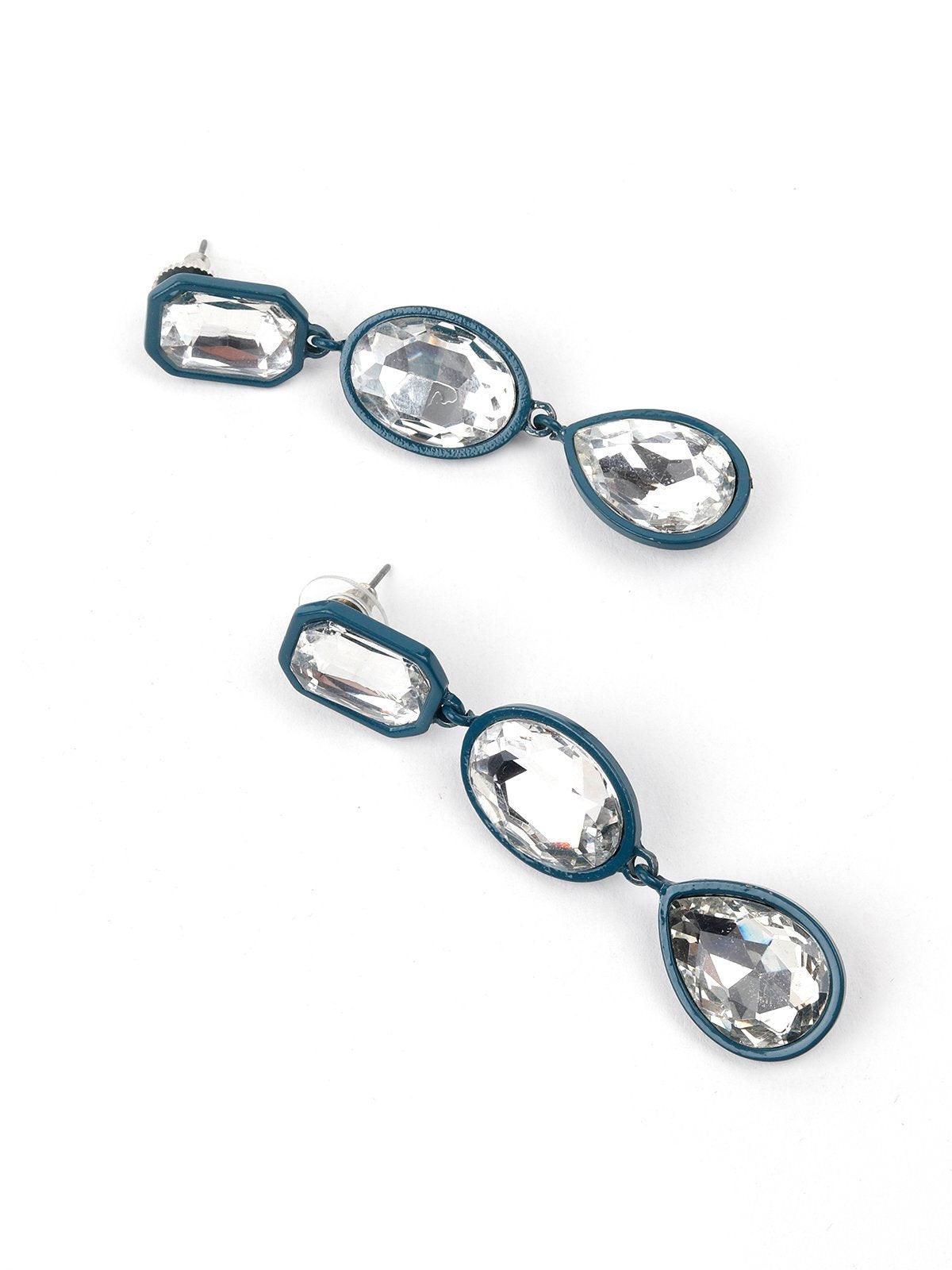 Elegant dangle earrings with high-quality square, oval and teardrop-shaped artificial crystals. The body of the earrings blue plated stainless steel.
