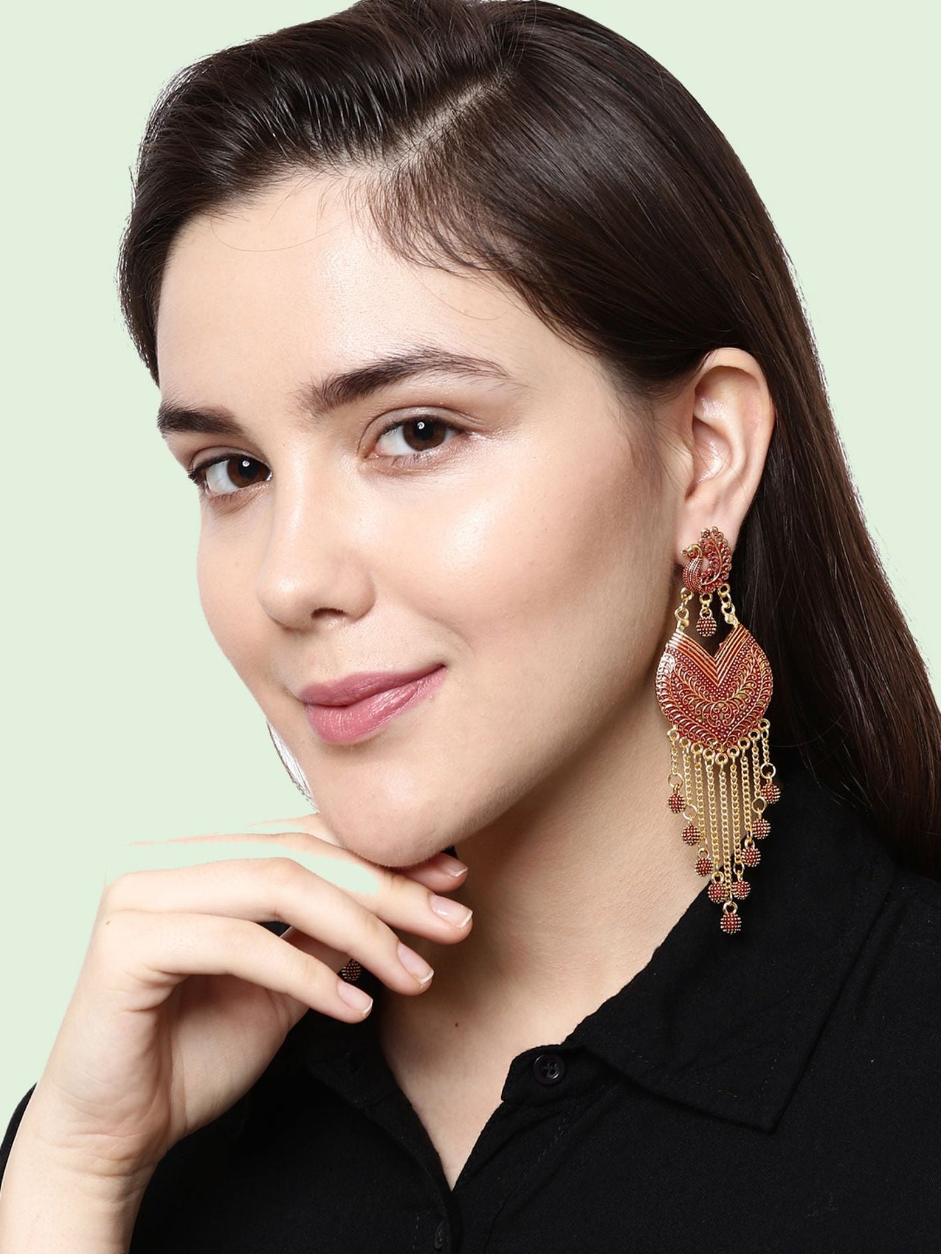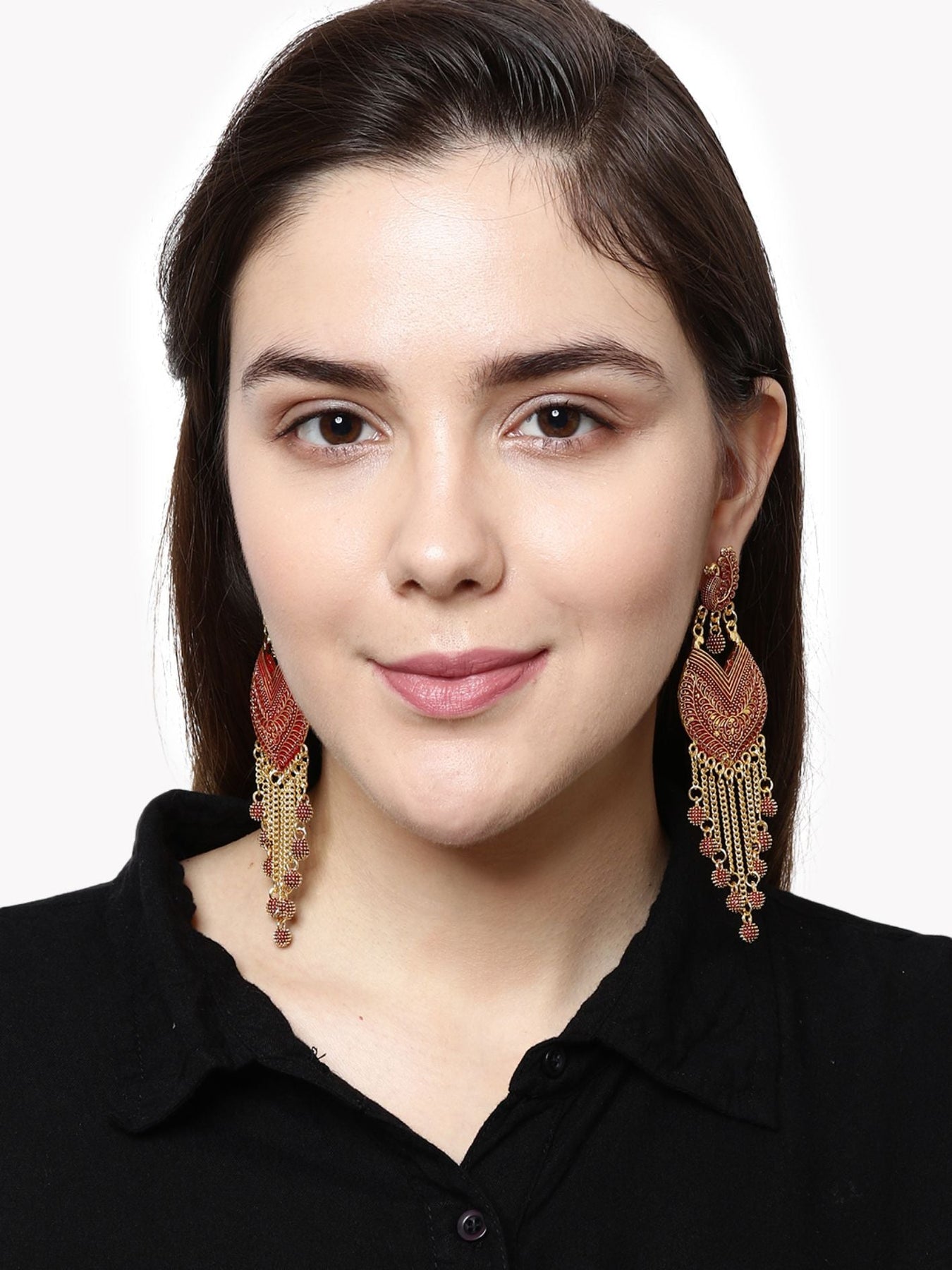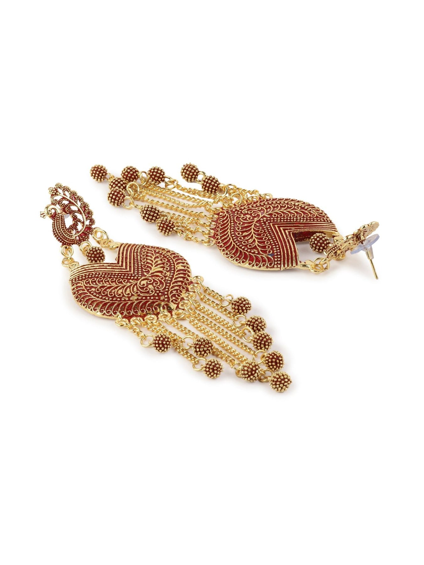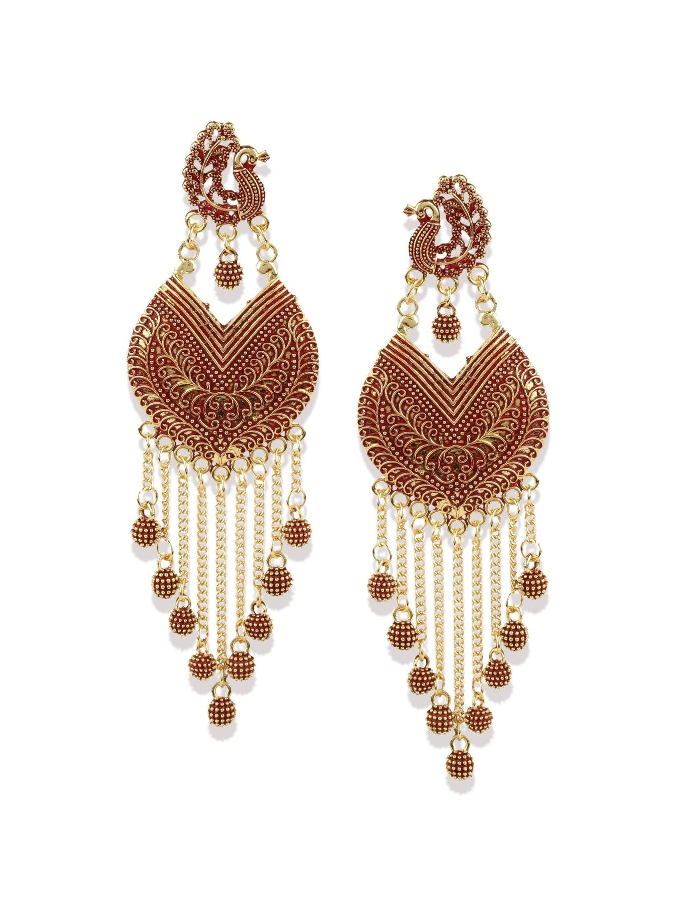Red & Gold-Plated Enamelled Peacock Shaped Drop Earrings Secured With Post And Back Closure, Details: Enamelled