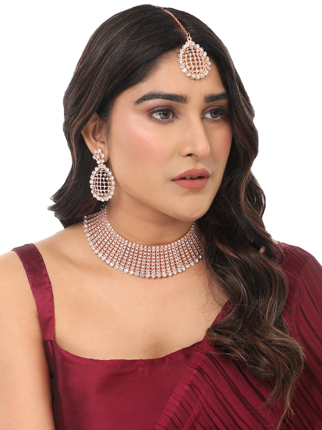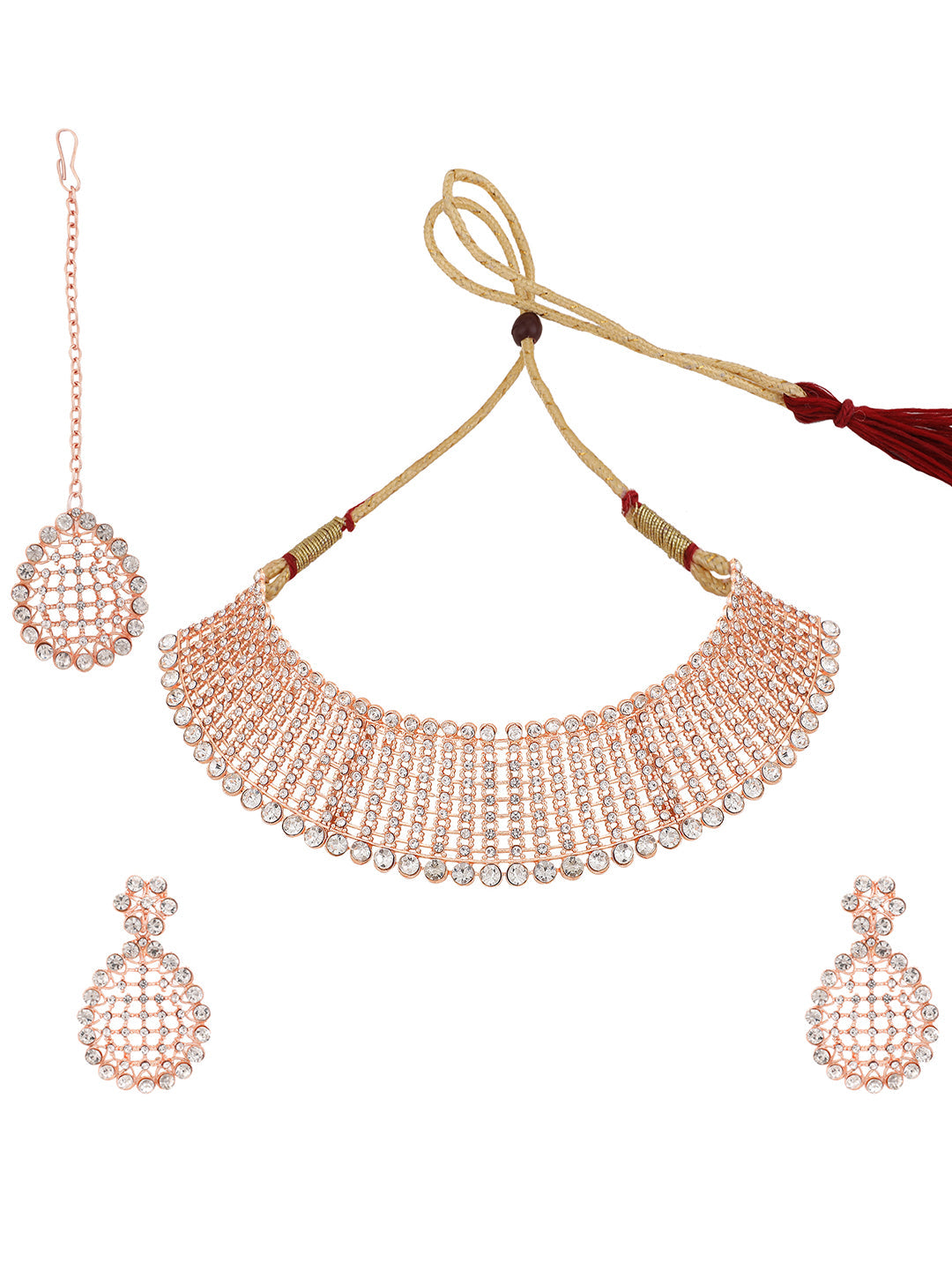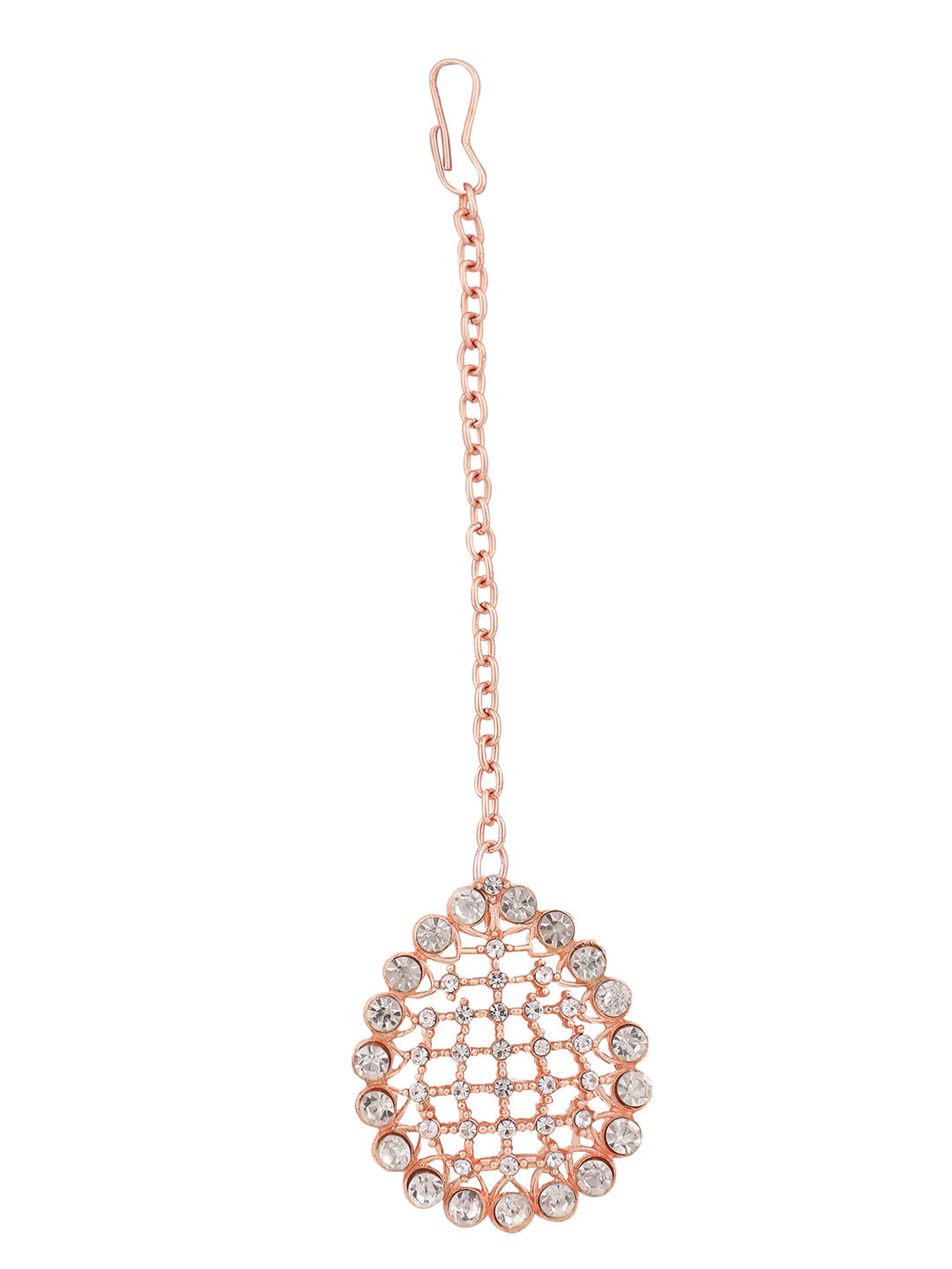 Rose Gold-Plated & White AD-Studded & Stylish Jewellery Set with Earring Maangtika, Secured with Drawstring Closure,Stone : American Diamond