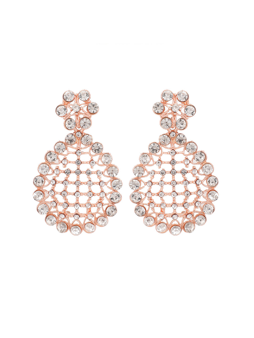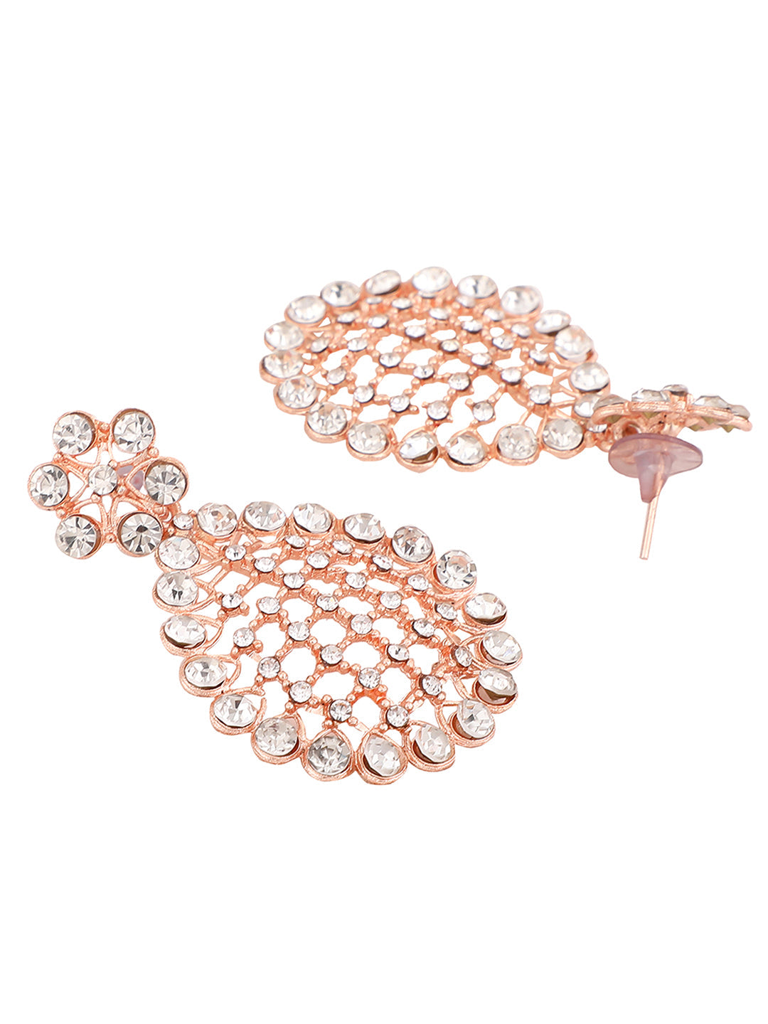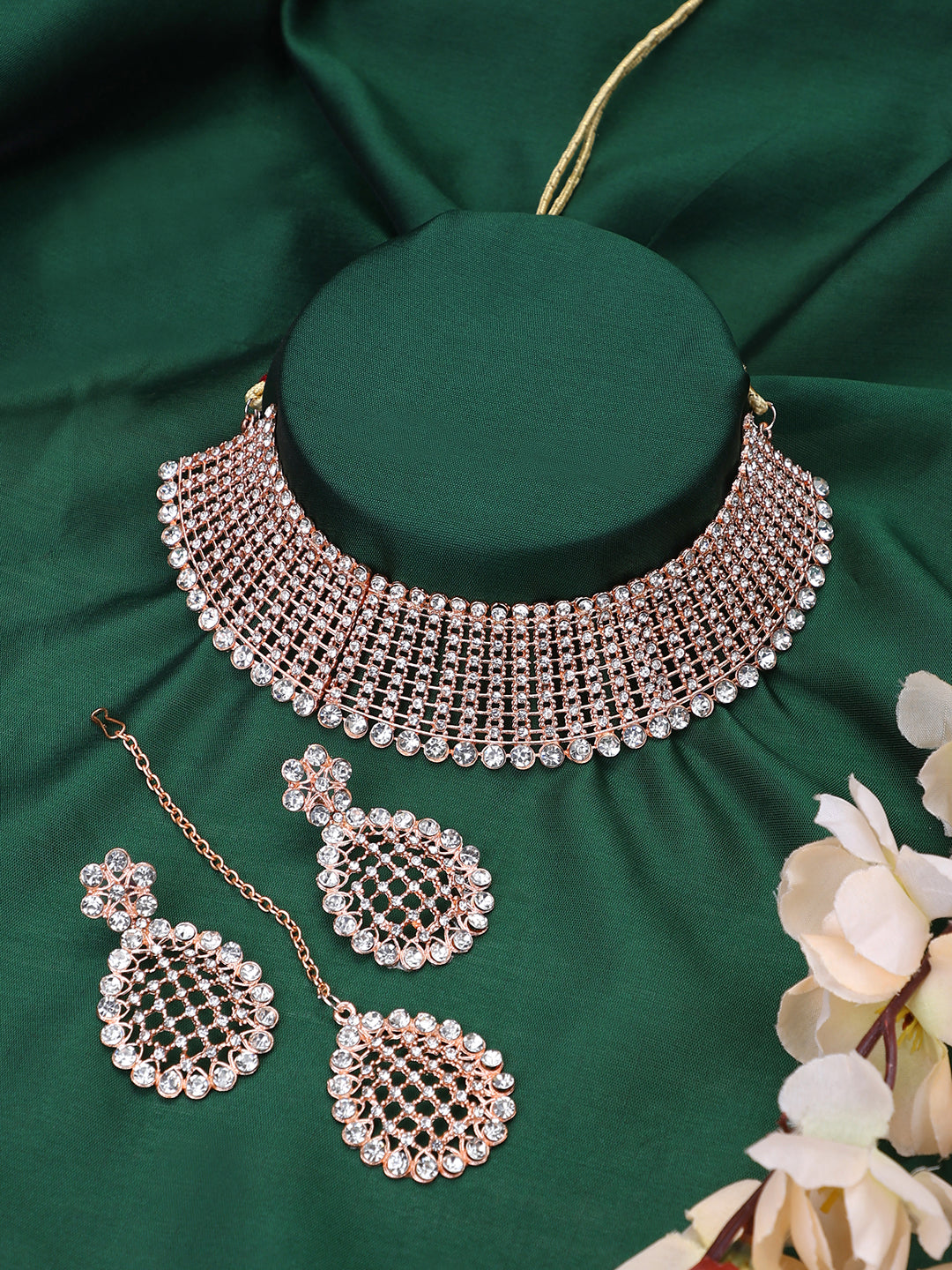 Rose Gold-Plated & White AD-Studded & Stylish Jewellery Set with Earring Maangtika, Secured with Drawstring Closure,Stone : American Diamond