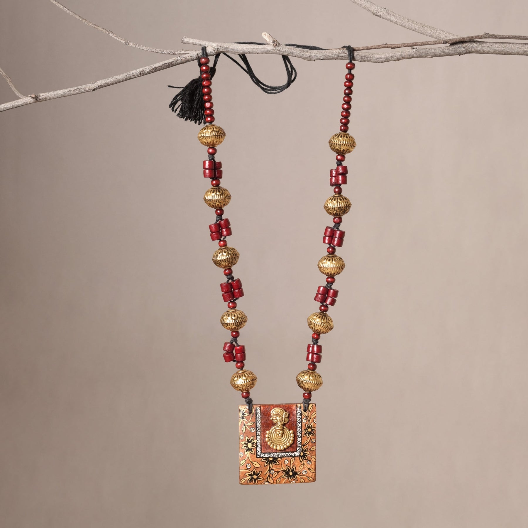 Embrace sophistication with our Royal Blossom Brass Necklace, showcasing a wooden pendant embellished with hand-painted floral motifs and a majestic brass queen charm.
