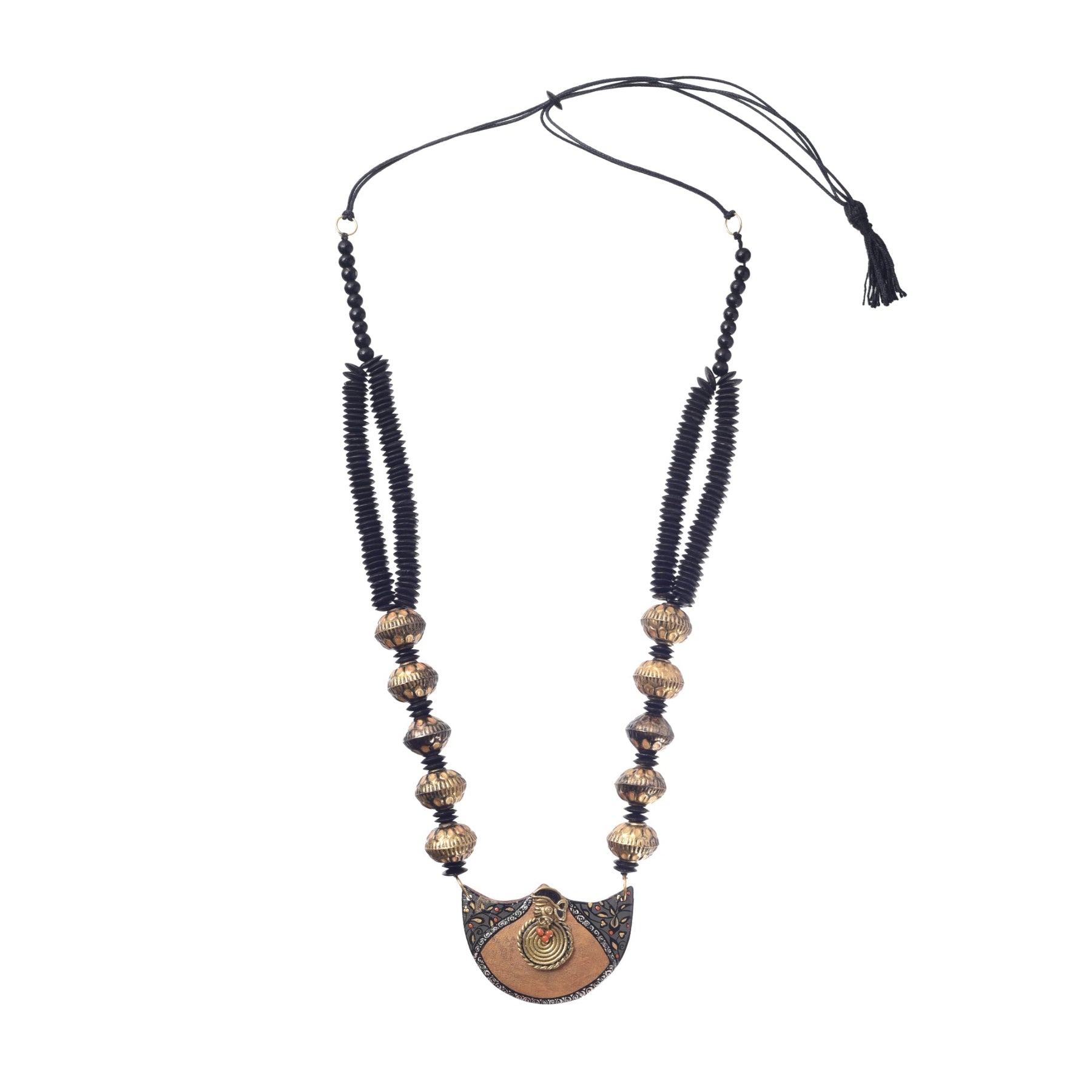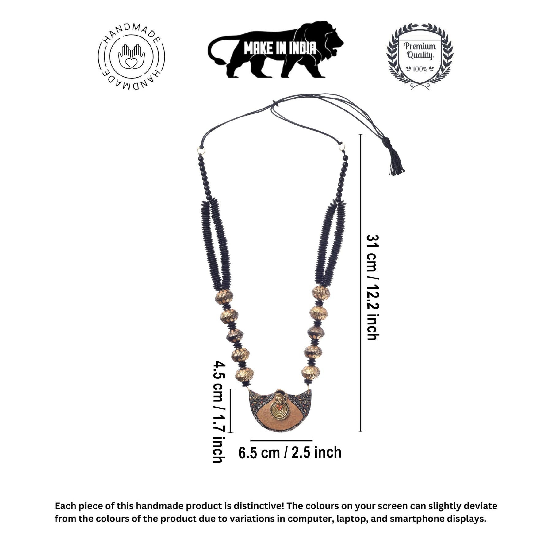 Experience royalty with our Royal Dhokra Pendant Necklace, where a hand-painted wooden pendant meets the elegance of Dhokra Brass Queen charm and round brass beads.