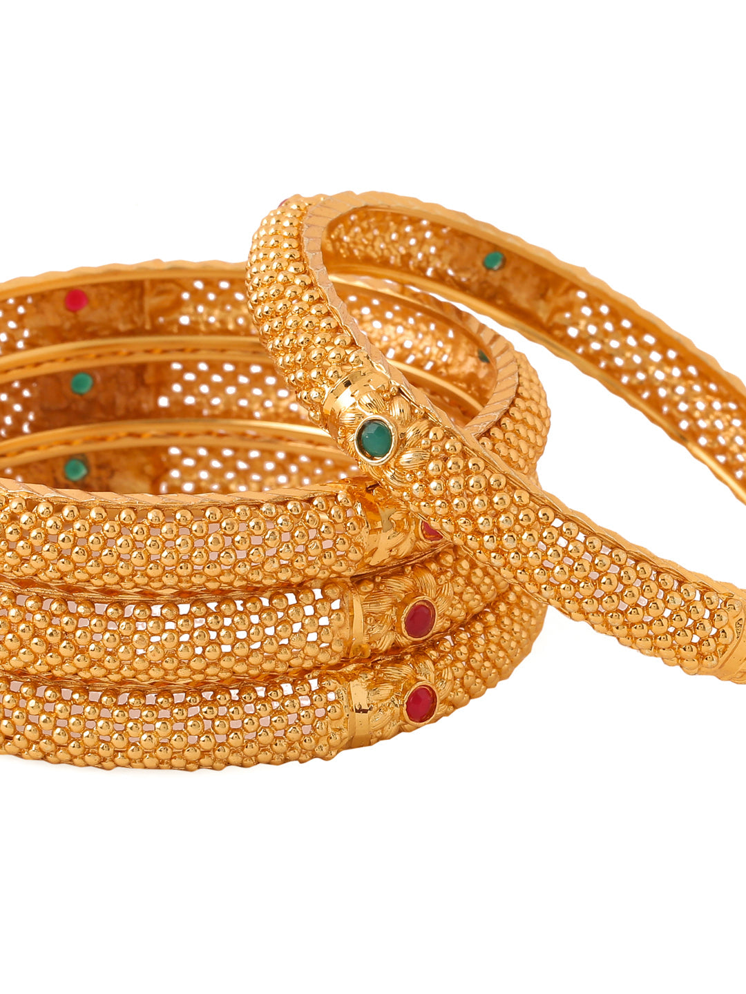 Style Note: Gold plated, Artificial Stones handcrafted broad bangles, has a intricate textured detail, Style these bangles with your favourite lehenga or sharara set and jezz up your look. Bringing elegence and style to your revishing look that will surely win hearts.