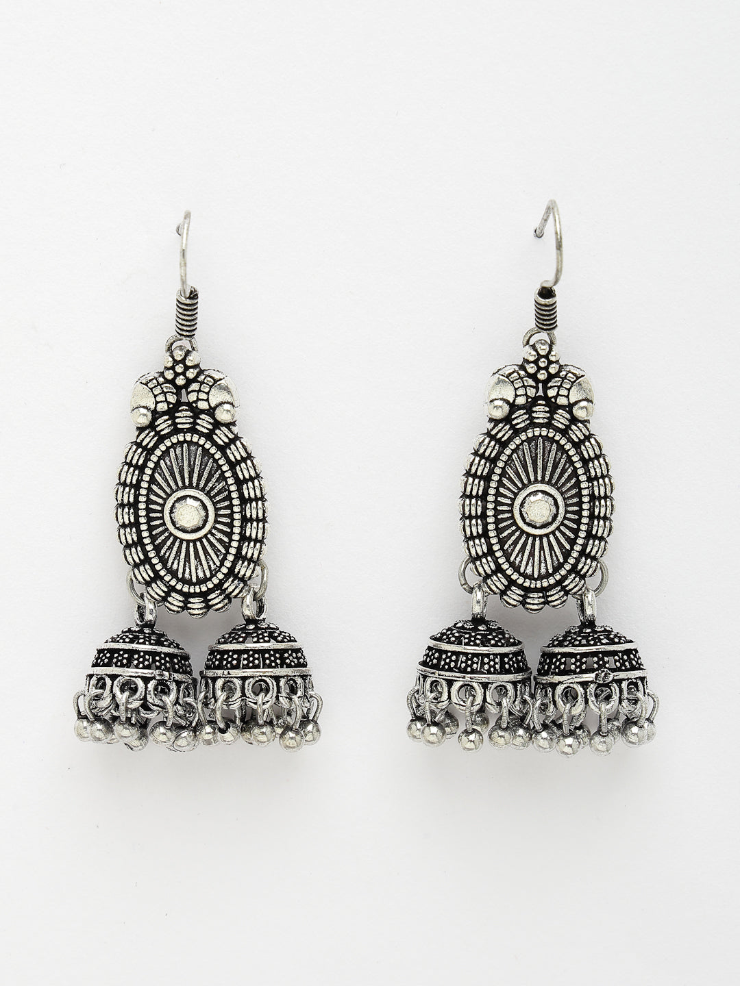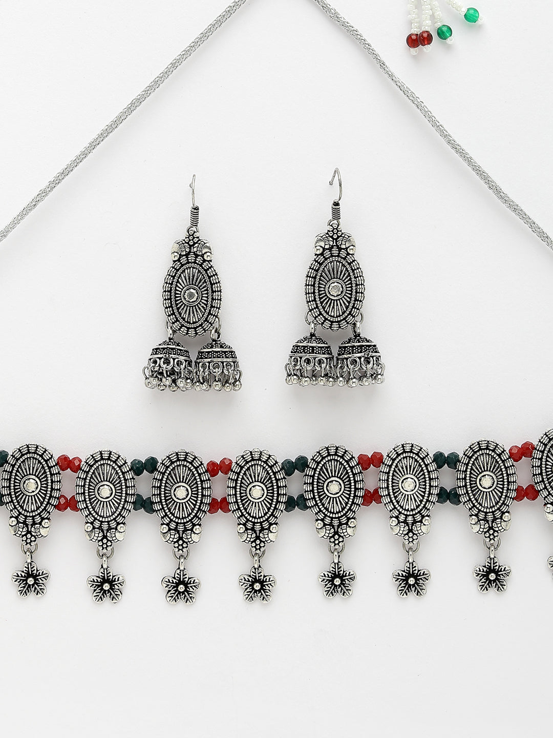 Women's Silver-Plated Choke Oxidized Necklace With Jhumka Earrings