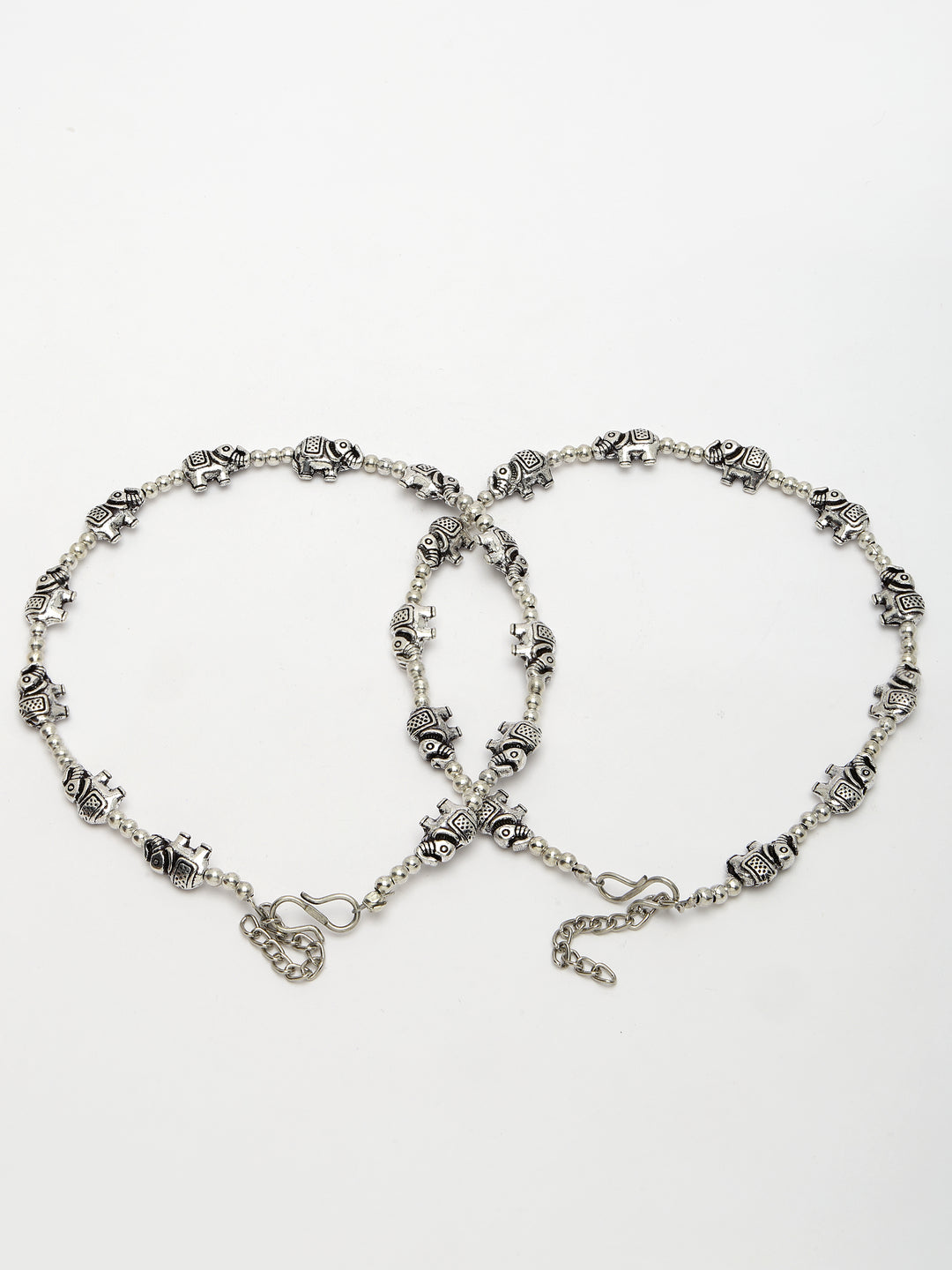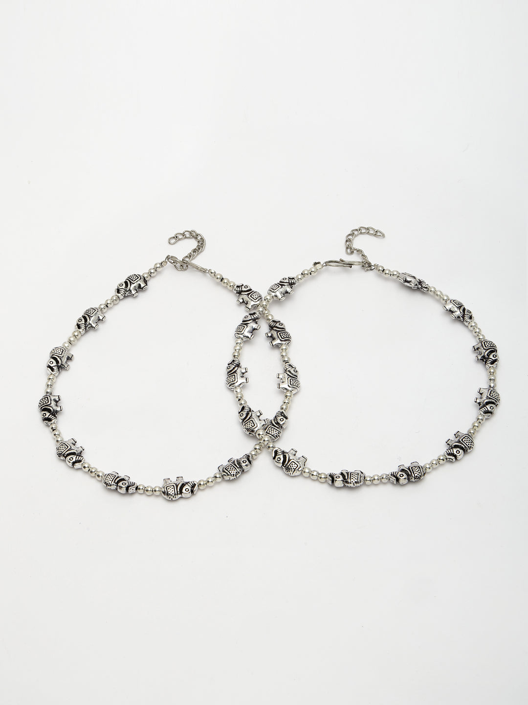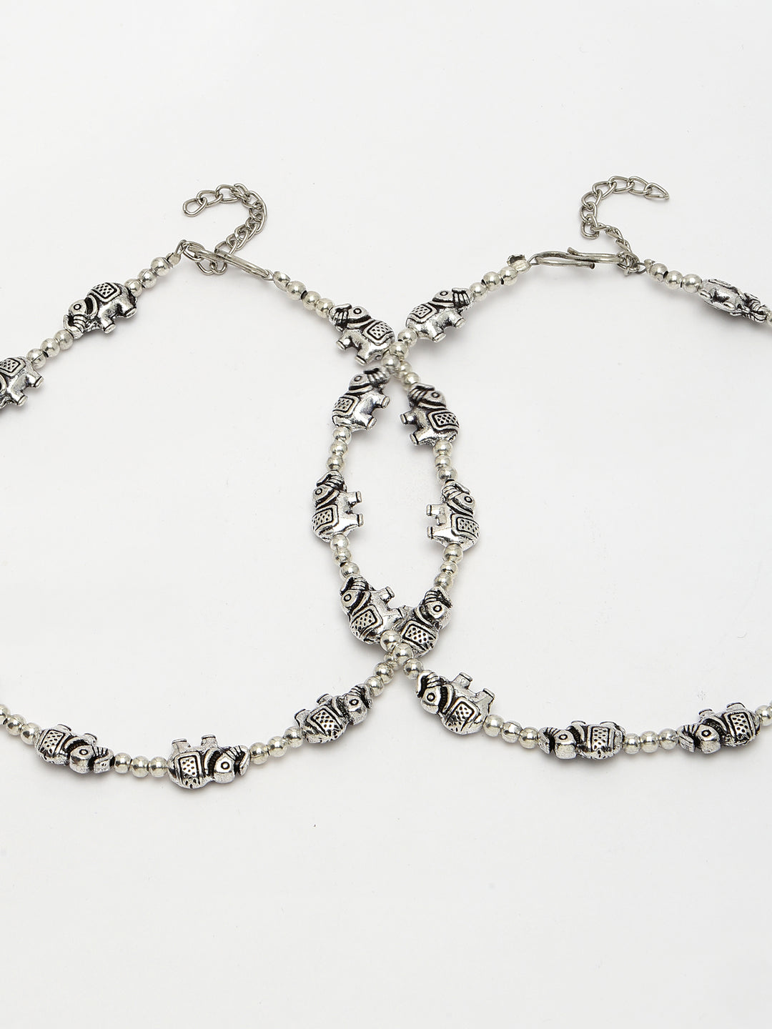 Style Note: The NVR Women Set of 2 Silver-Plated Elephant Design Anklets offers a blend of traditional charm and contemporary style. Each anklet features a silver-plated finish adorned with elephant designs, symbolizing strength, wisdom, and good luck. Perfect for enhancing both casual and festive attire, these anklets add a touch of elegance and cultural richness to any ensemble. With their adjustable length, they ensure a comfortable fit and make a delightful addition to your jewelry collection, showcasing a timeless appeal and unique craftsmanship.