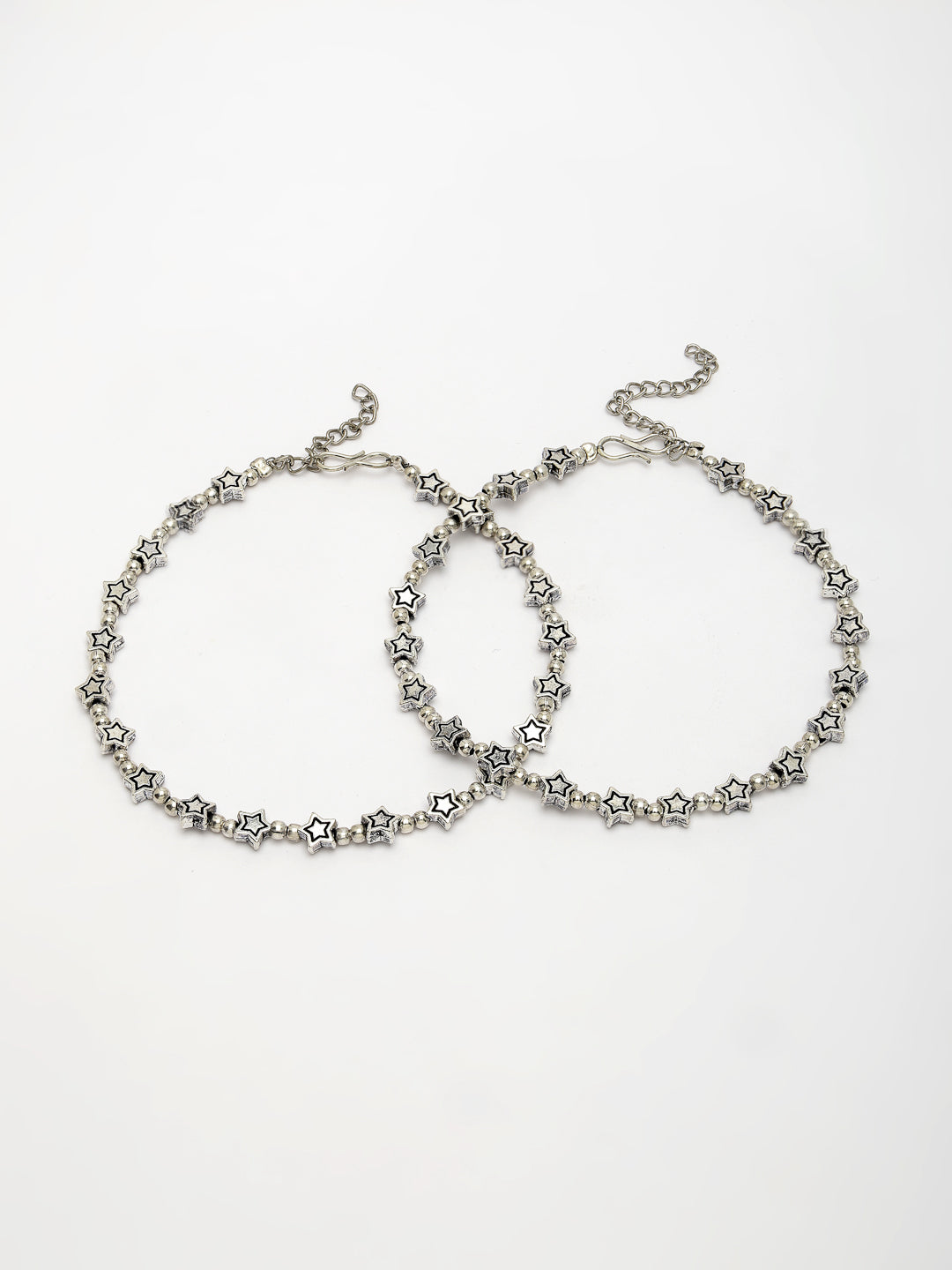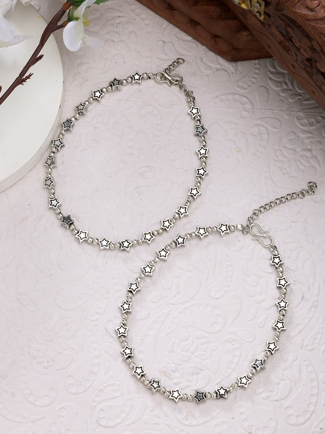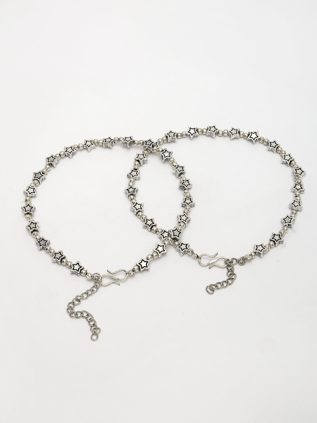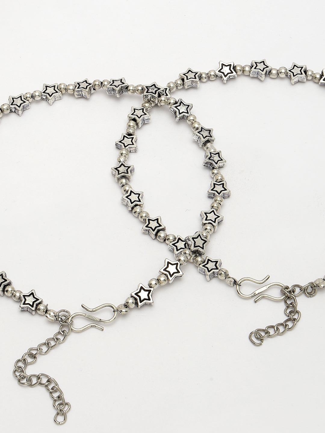 Style Note: The NVR Women Set of 2 Silver-Plated Star Design Anklets combines celestial charm with elegant simplicity. Each anklet features a silver-plated finish adorned with star designs, symbolizing guidance and aspiration. Perfect for both casual outings and special occasions, these anklets add a subtle yet enchanting touch to any outfit. Their adjustable length ensures a comfortable fit for various ankle sizes, making them versatile and easy to wear. Embrace their delicate beauty and add a hint of celestial magic to your ensemble with this stylish set of anklets.