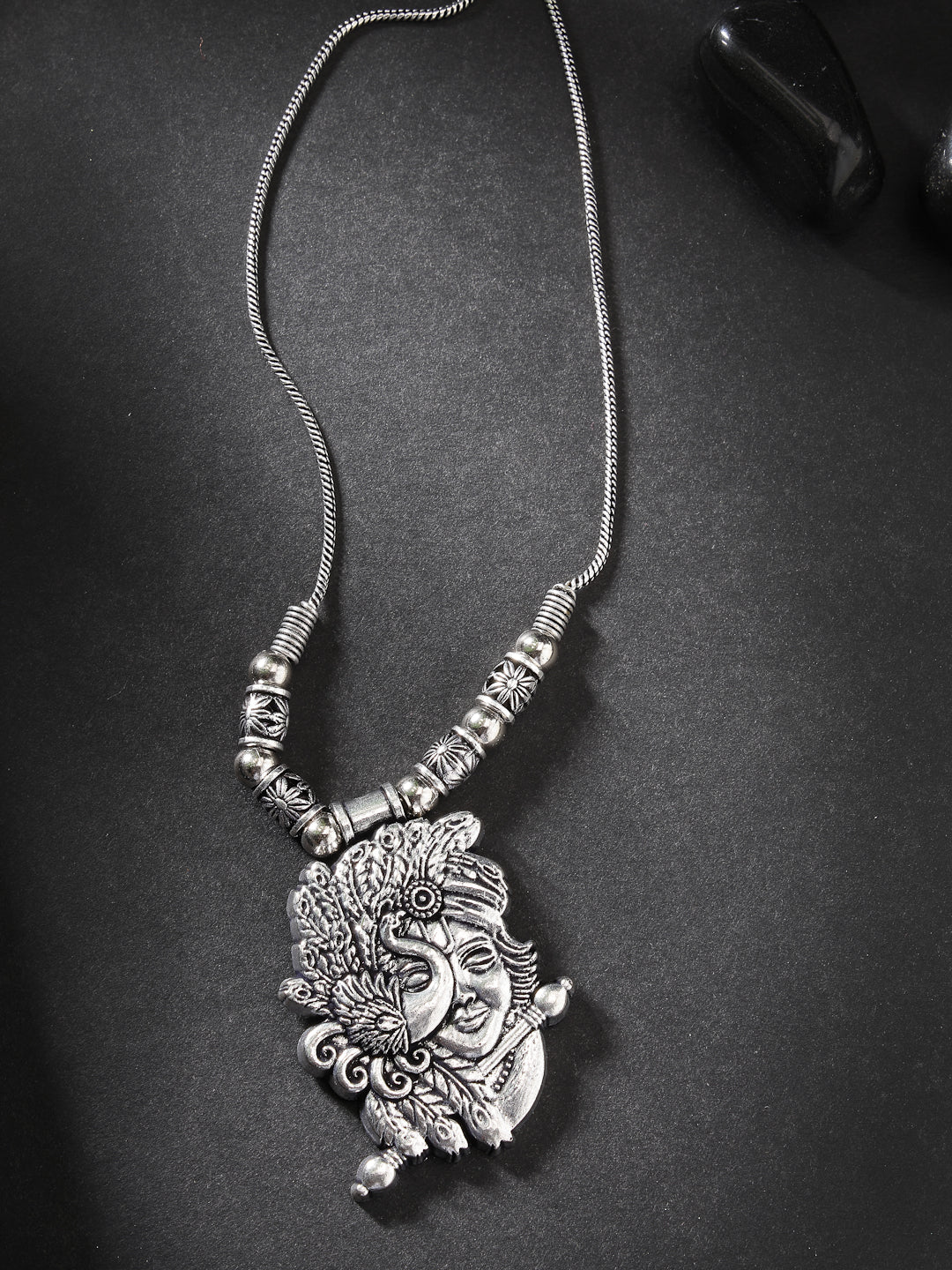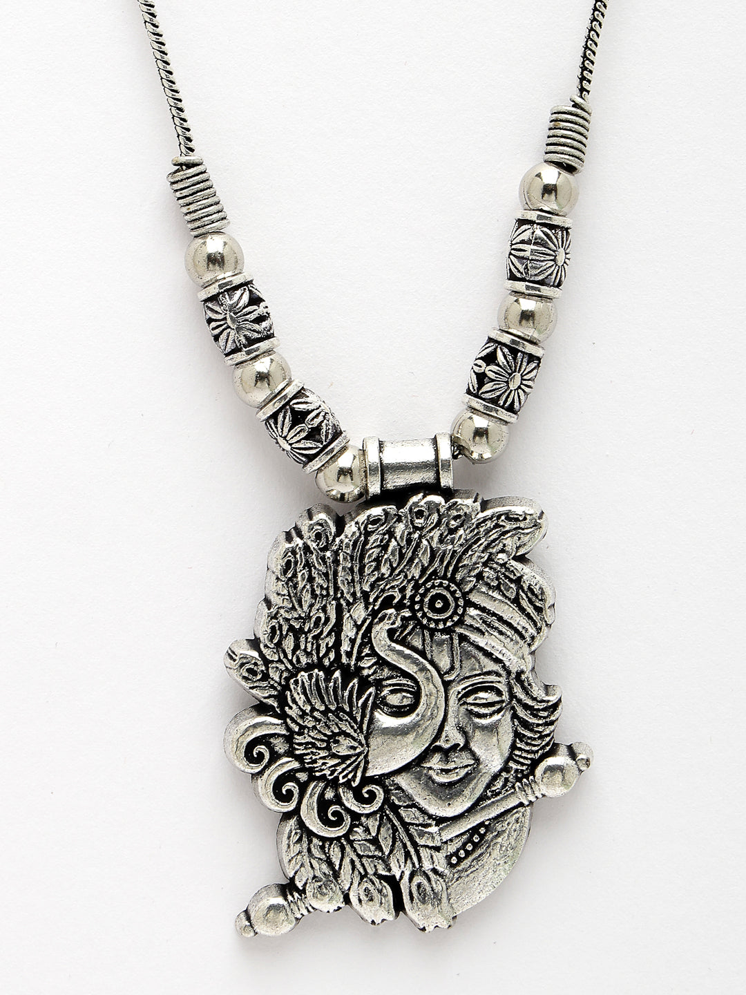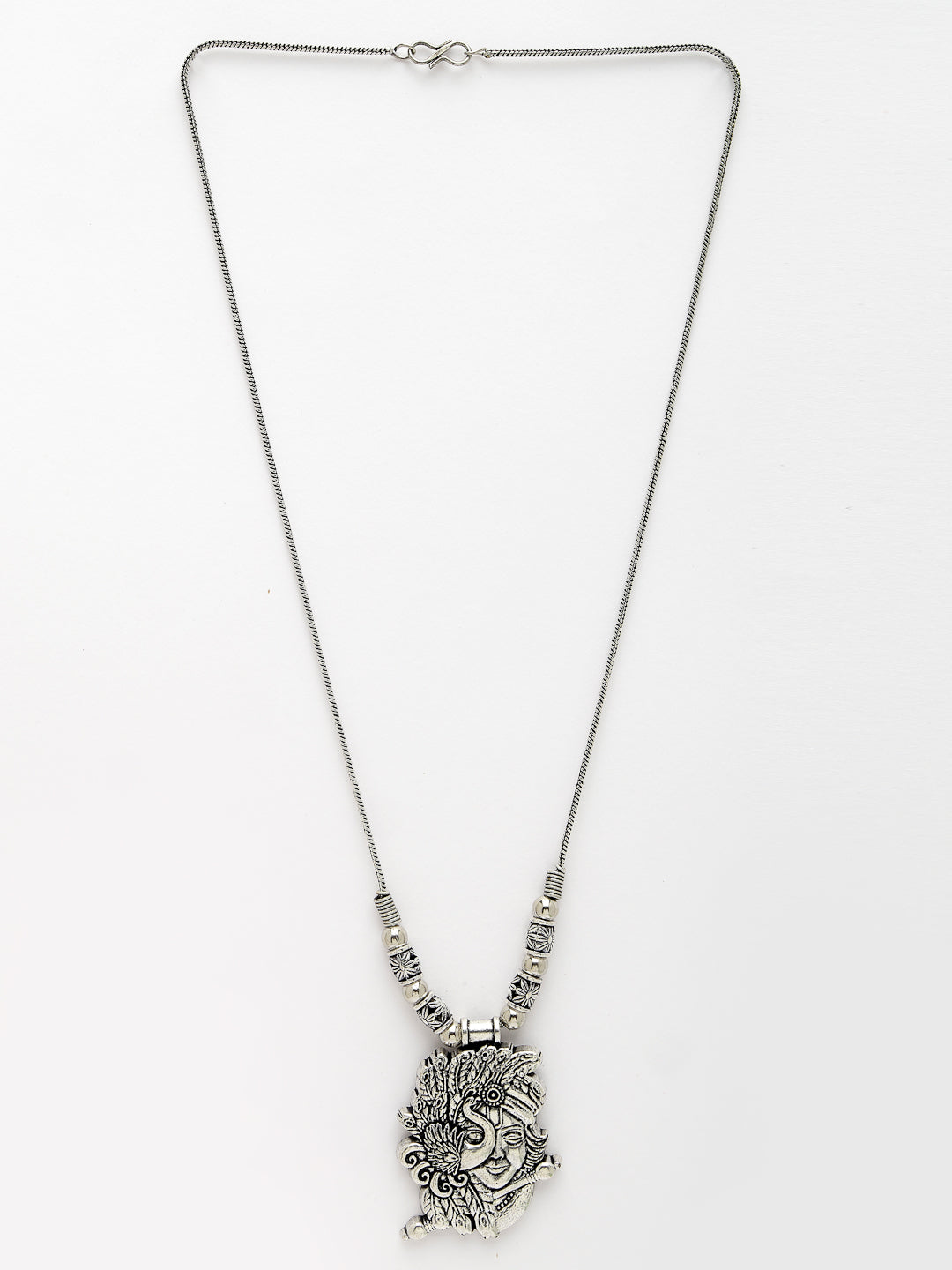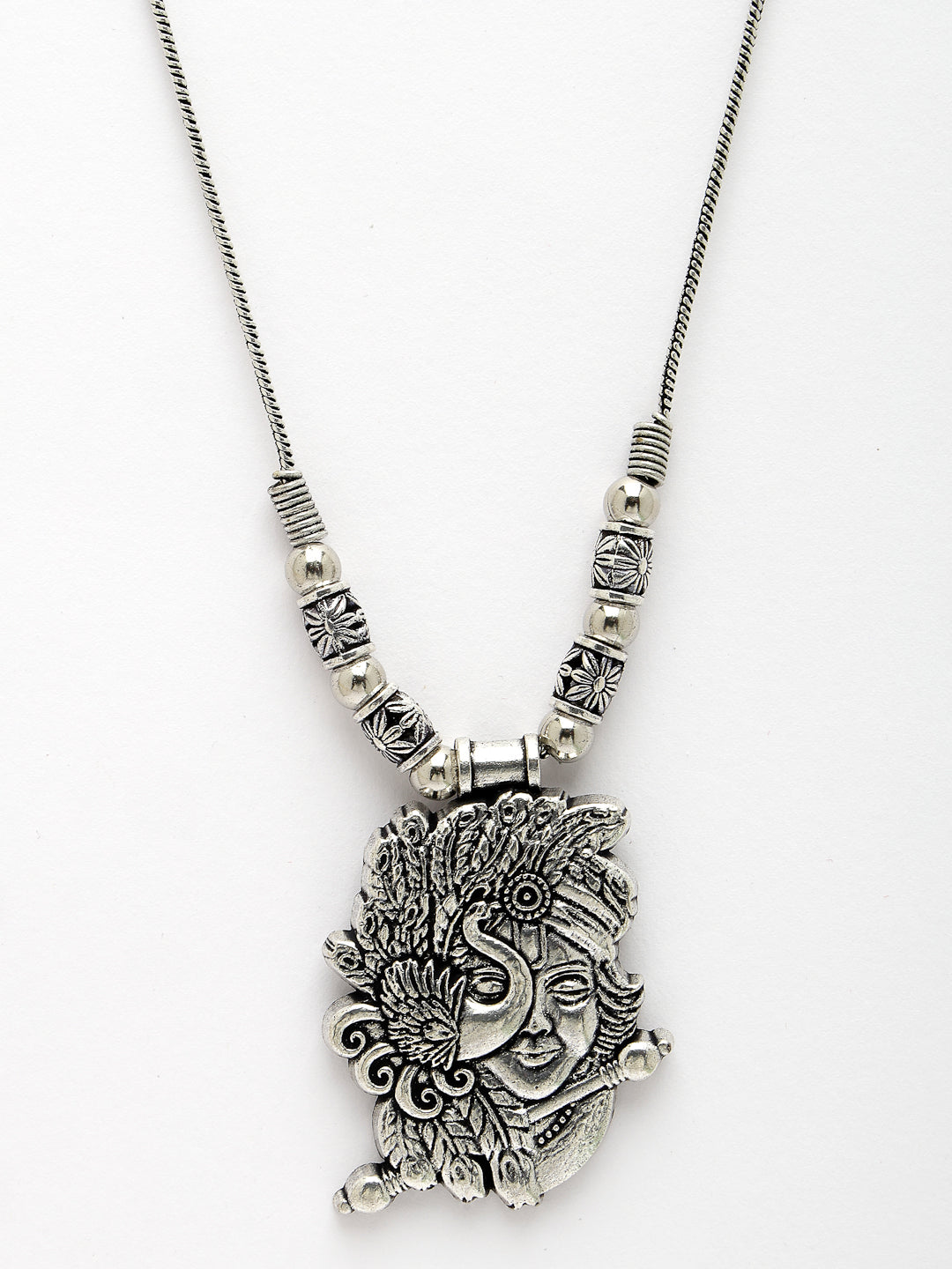 Style Note: The NVR Women Silver-Toned Krishna Pendant with Chain is a graceful and spiritually-inspired accessory. Crafted in silver-toned metal, the Krishna design reflects elegance and cultural richness. This pendant with chain adds a touch of reverence to both traditional and contemporary outfits, making it ideal for various occasions. Pair it with ethnic attire for cultural events or wear it with casual outfits to infuse a spiritual essence into your everyday style. Perfect for women who appreciate meaningful jewelry that combines artistry with spiritual symbolism.