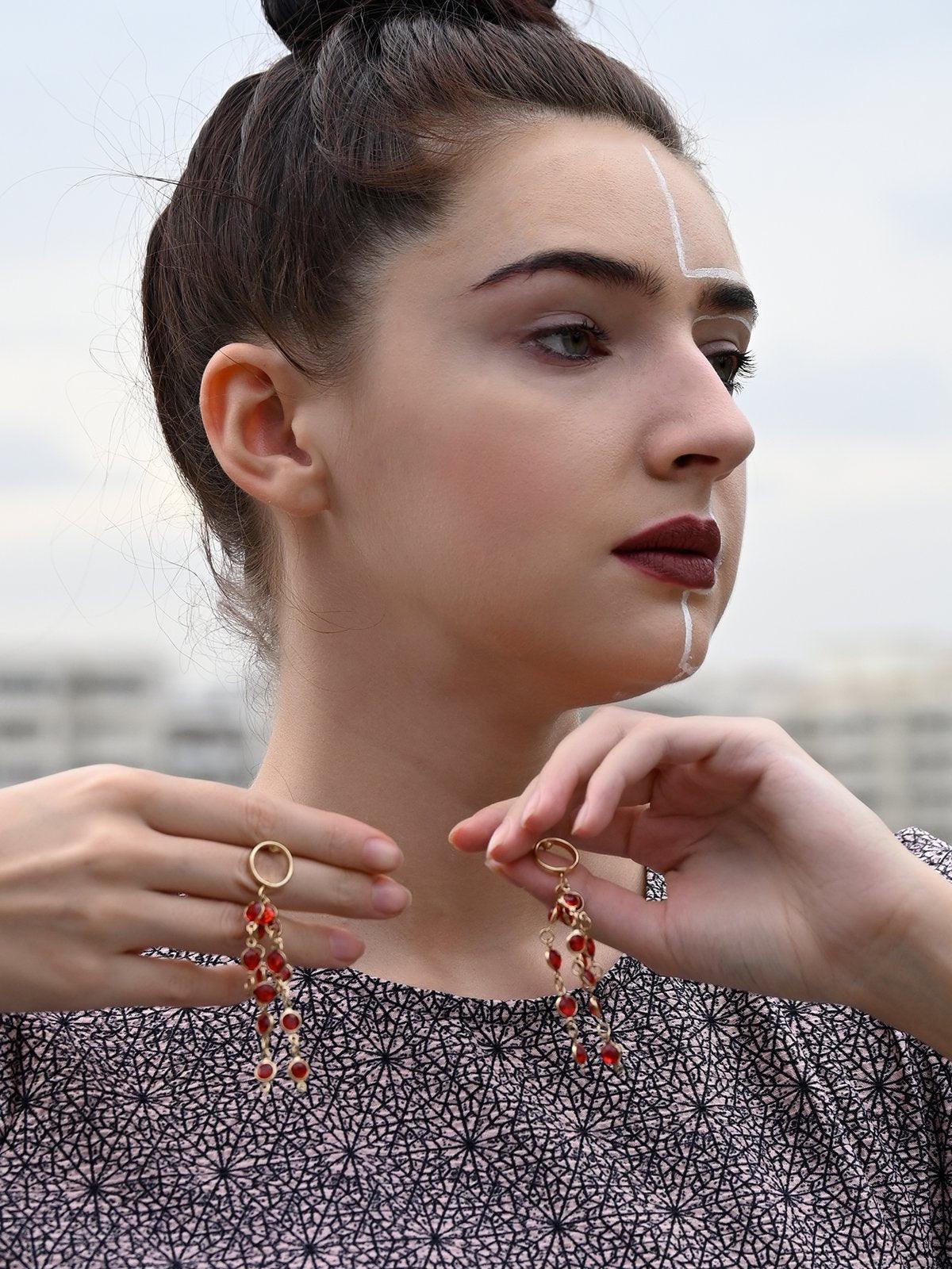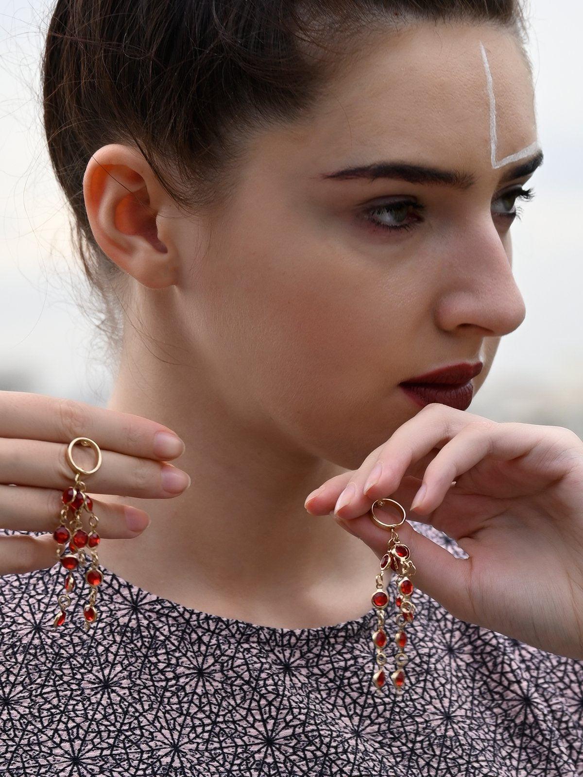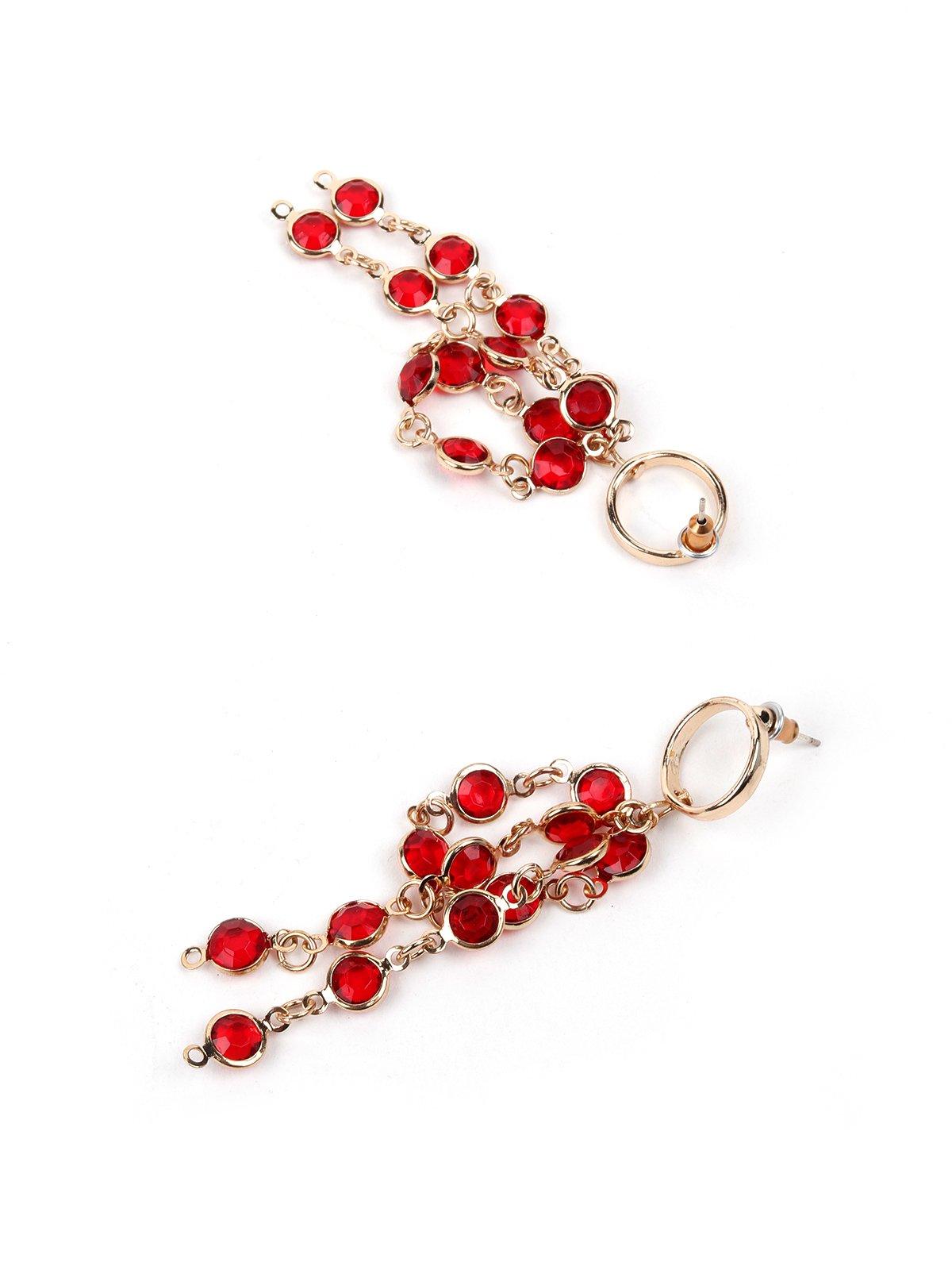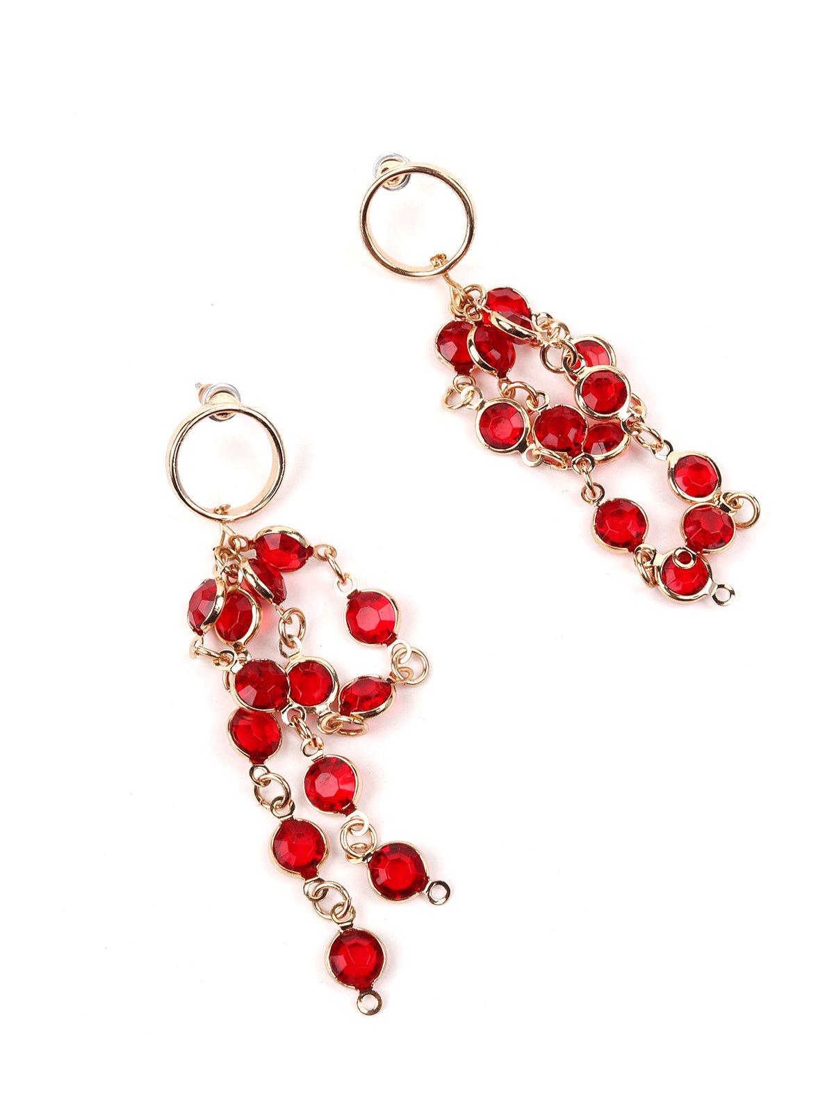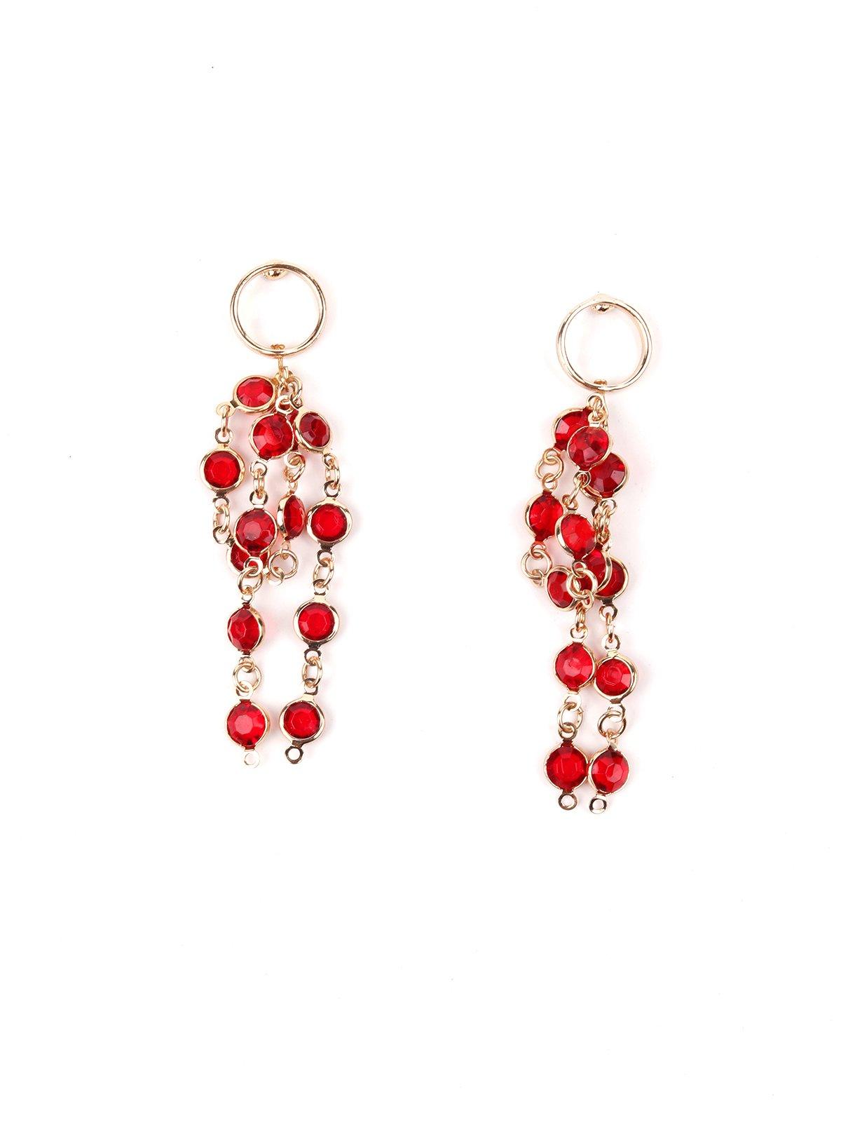 Featuring a very stunning red crystal earrings that spill down from your ears in a cricle shape that looks very elegant and effortless it framed with gold metal and secured with a post back closure
