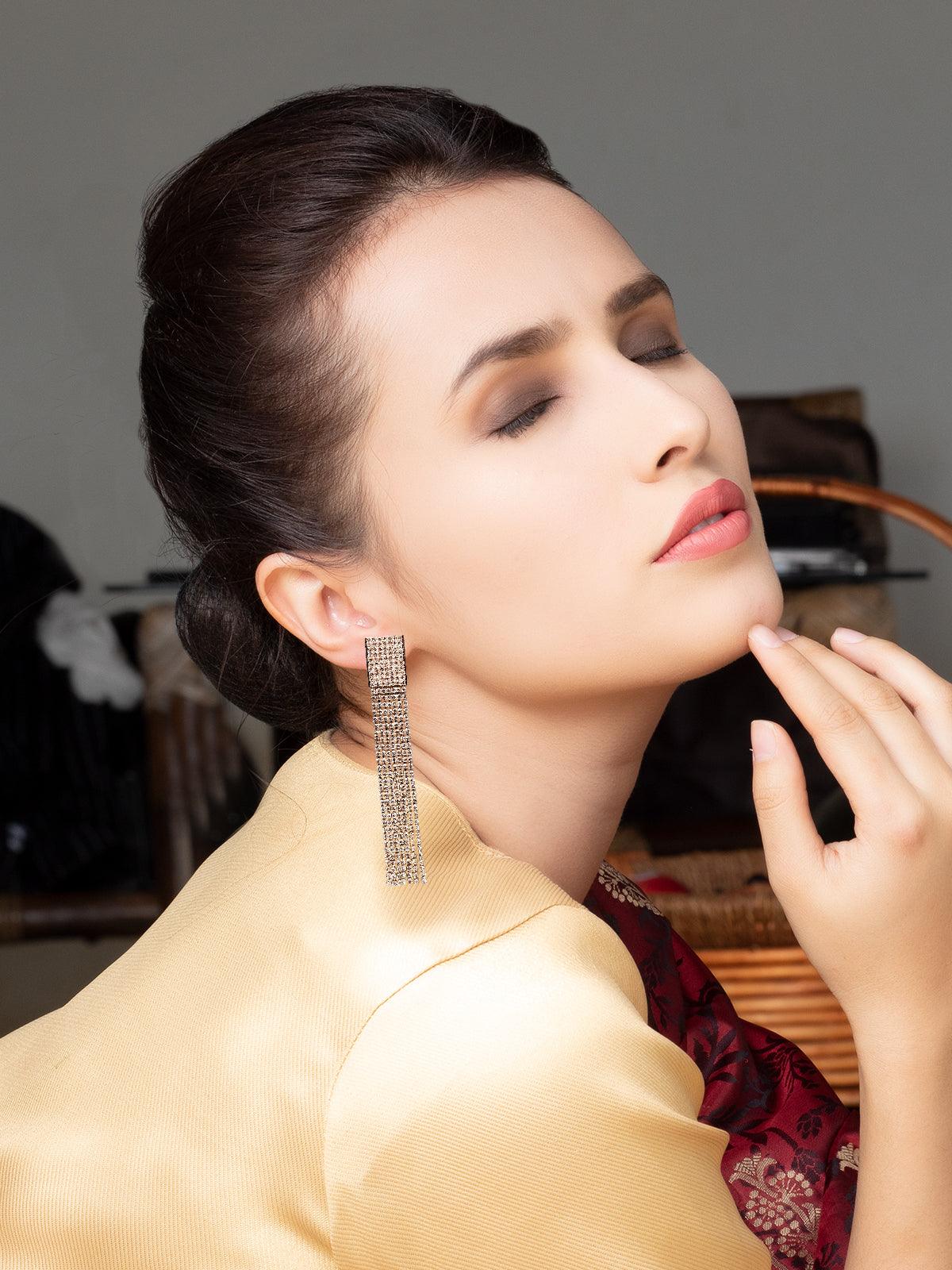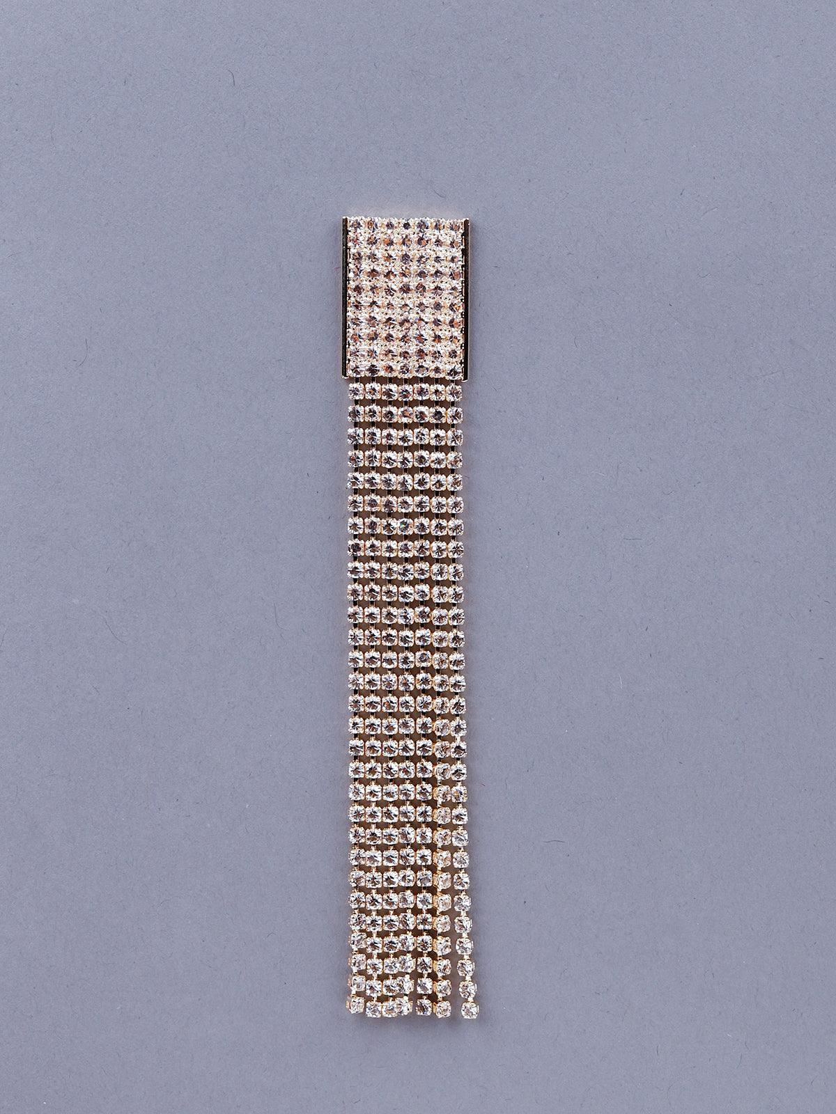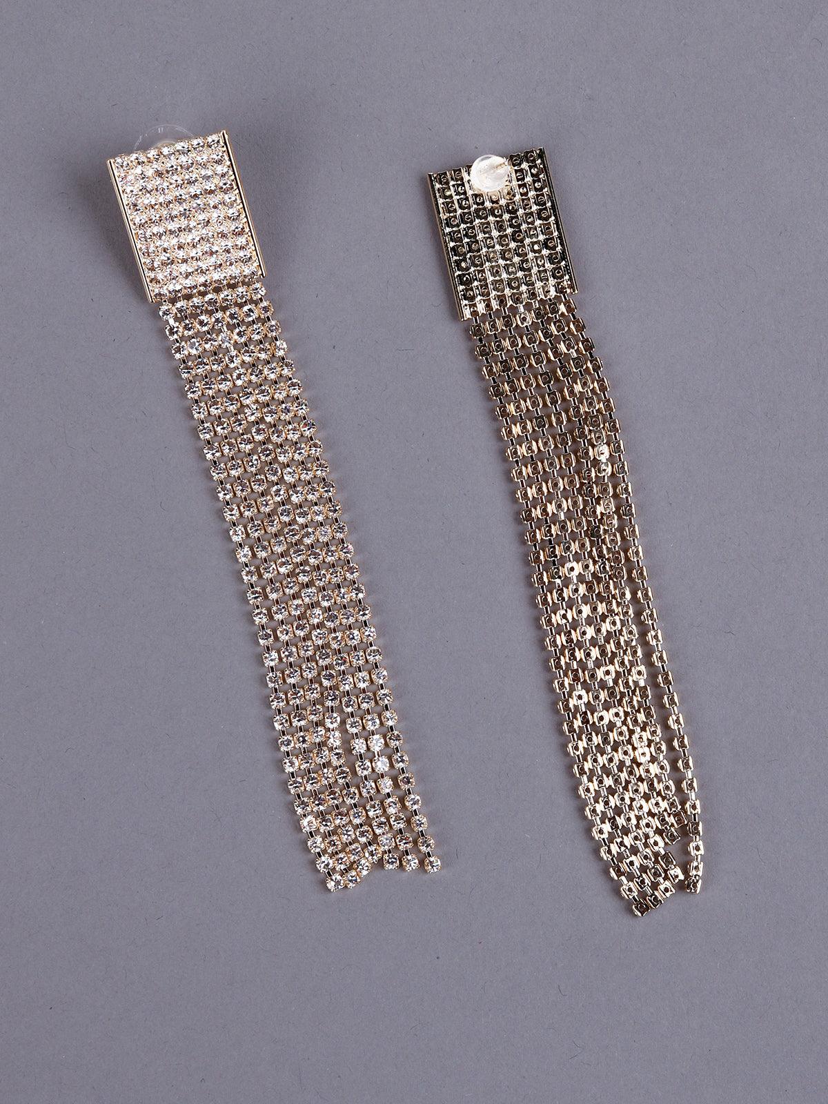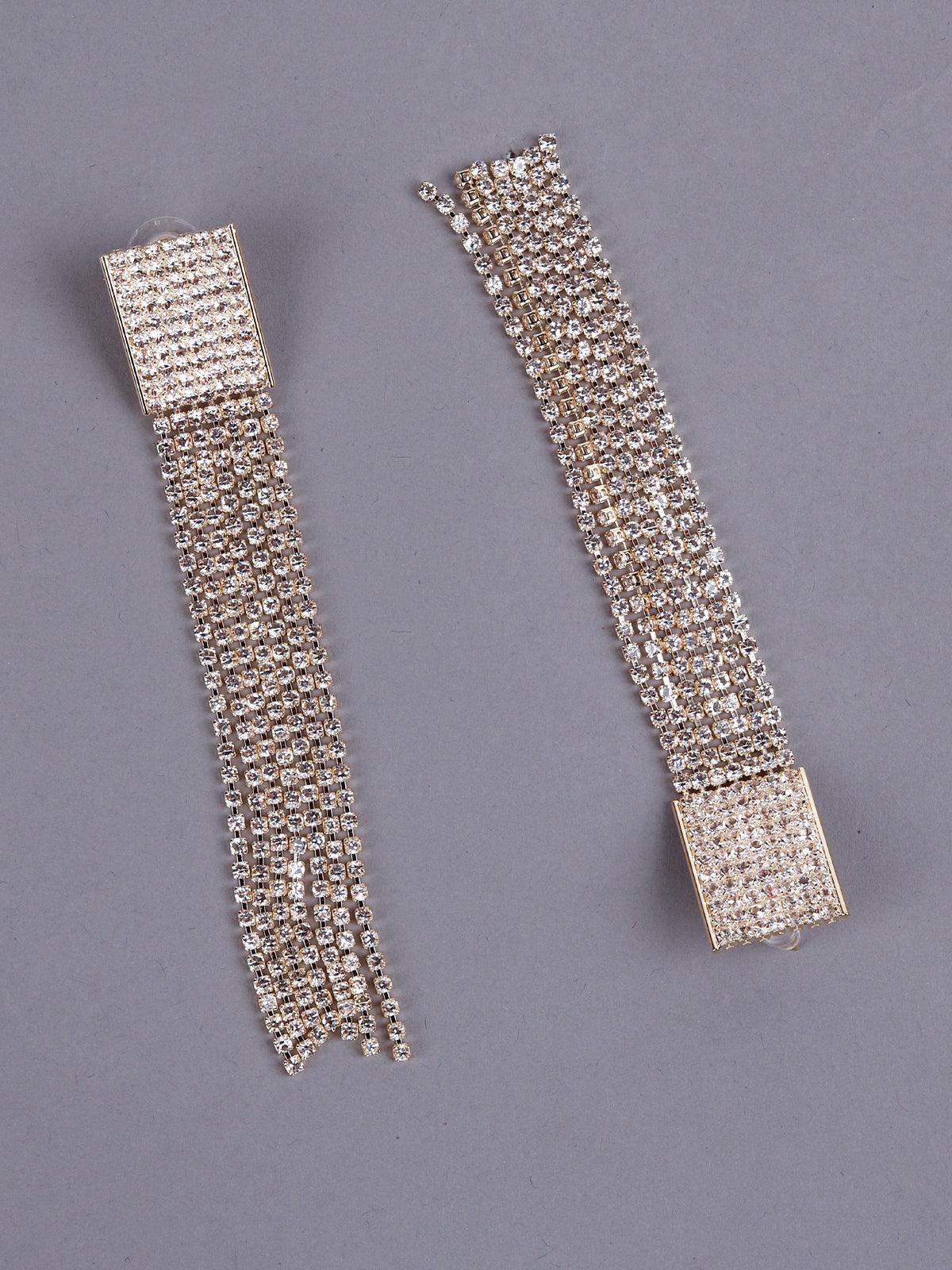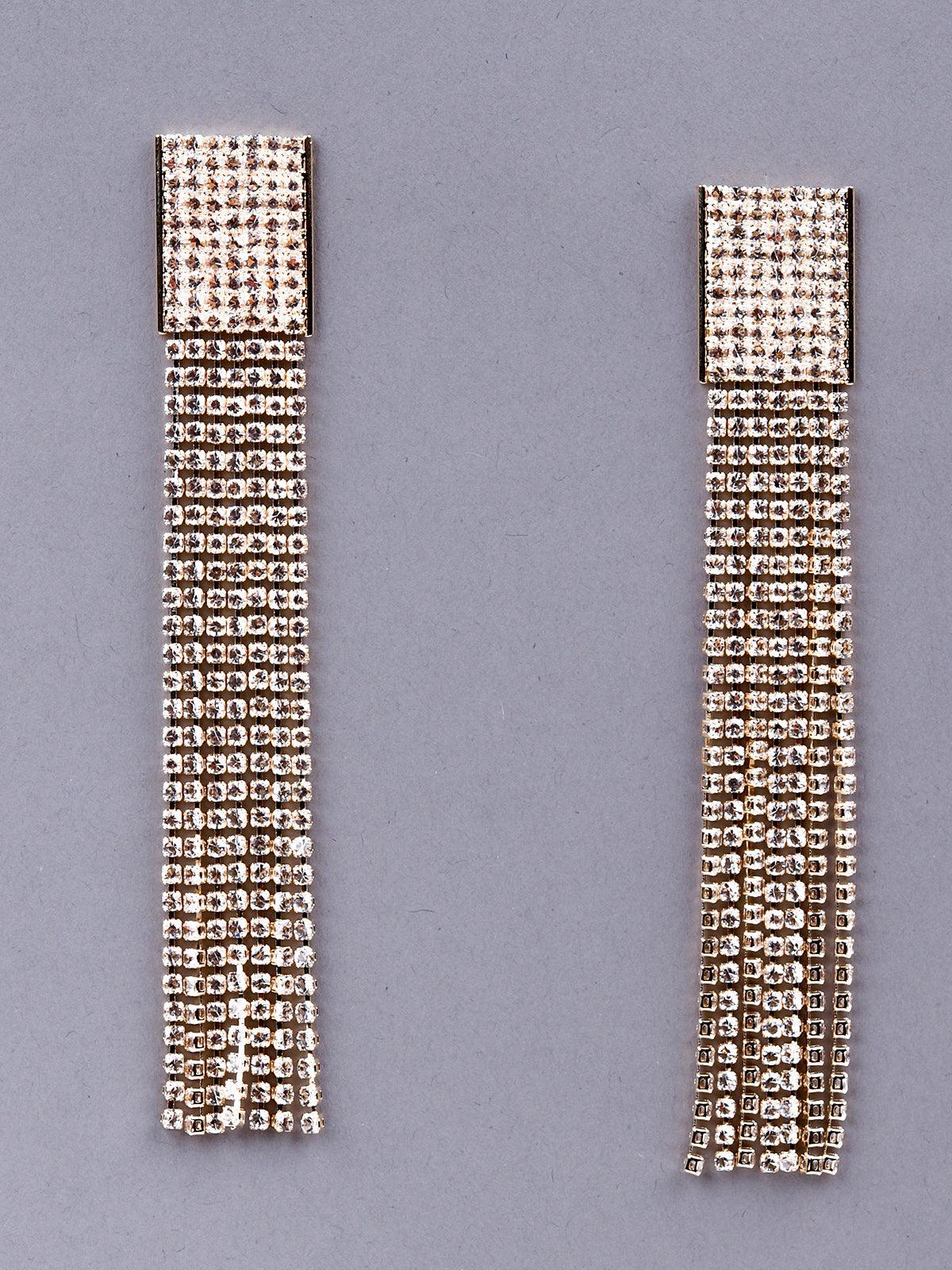 - These designer earrings feature a beautiful square overloaded with CZ crystals followed by a beautiful drop of sparkling clear crystal tassels.