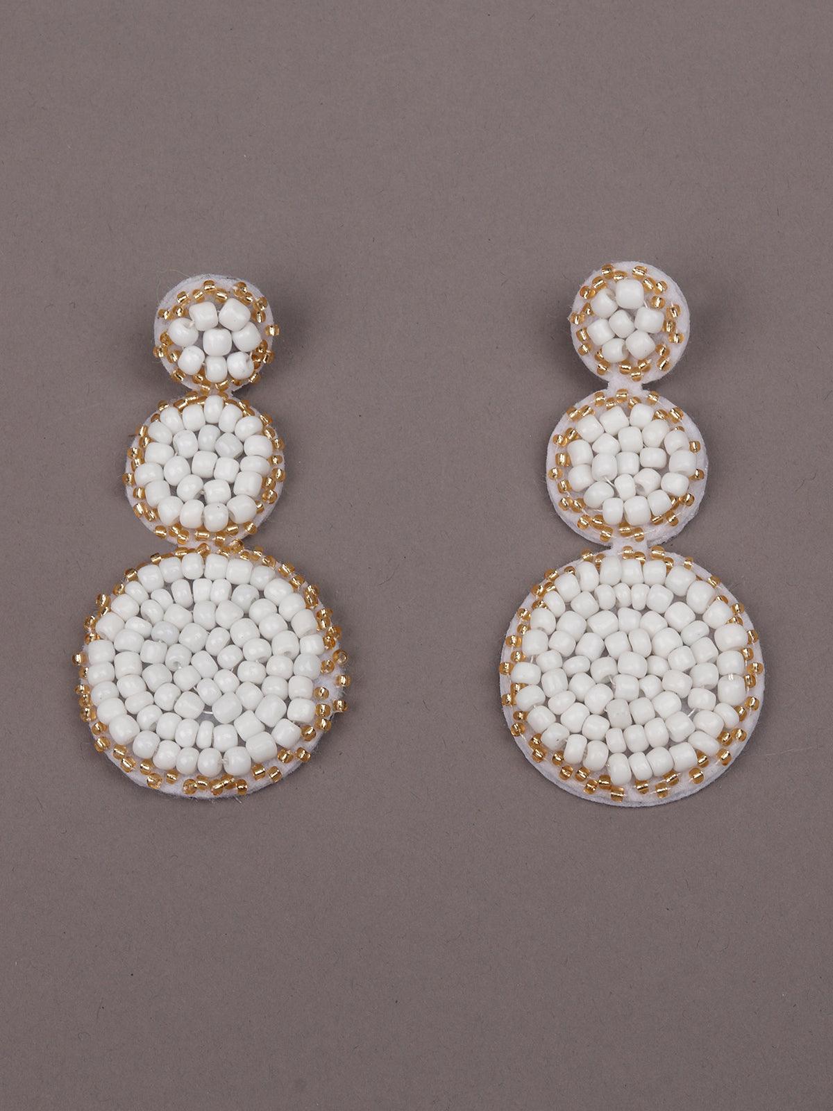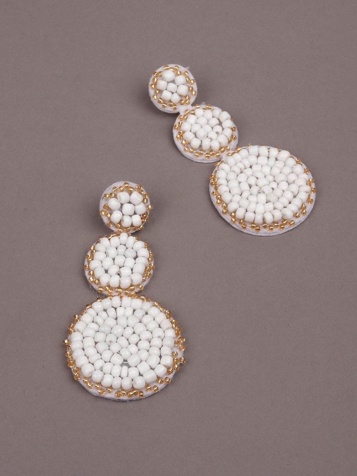 - These elegant dangler earrings feature three circles, each soldered onto the danglers covered with white and gold beads border.