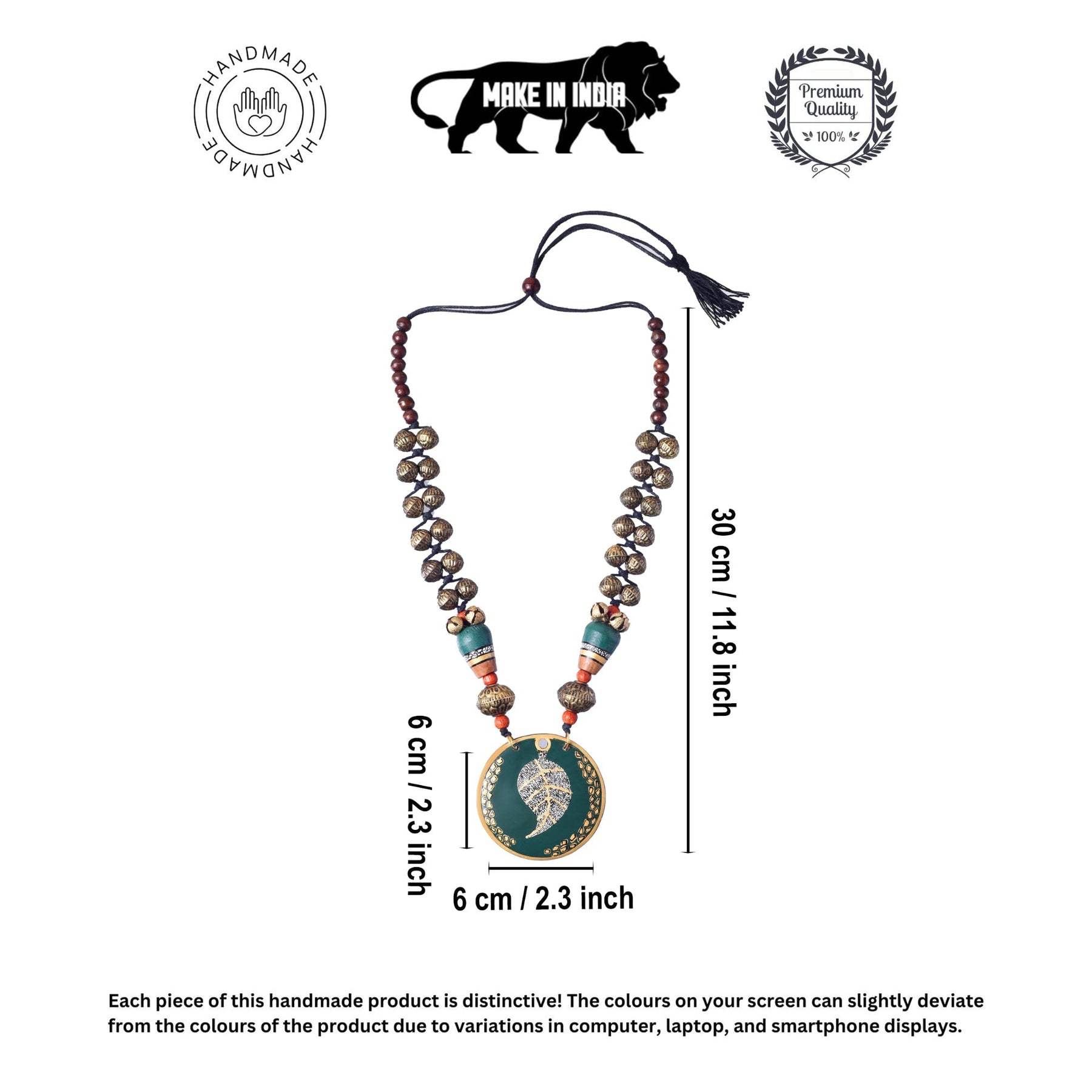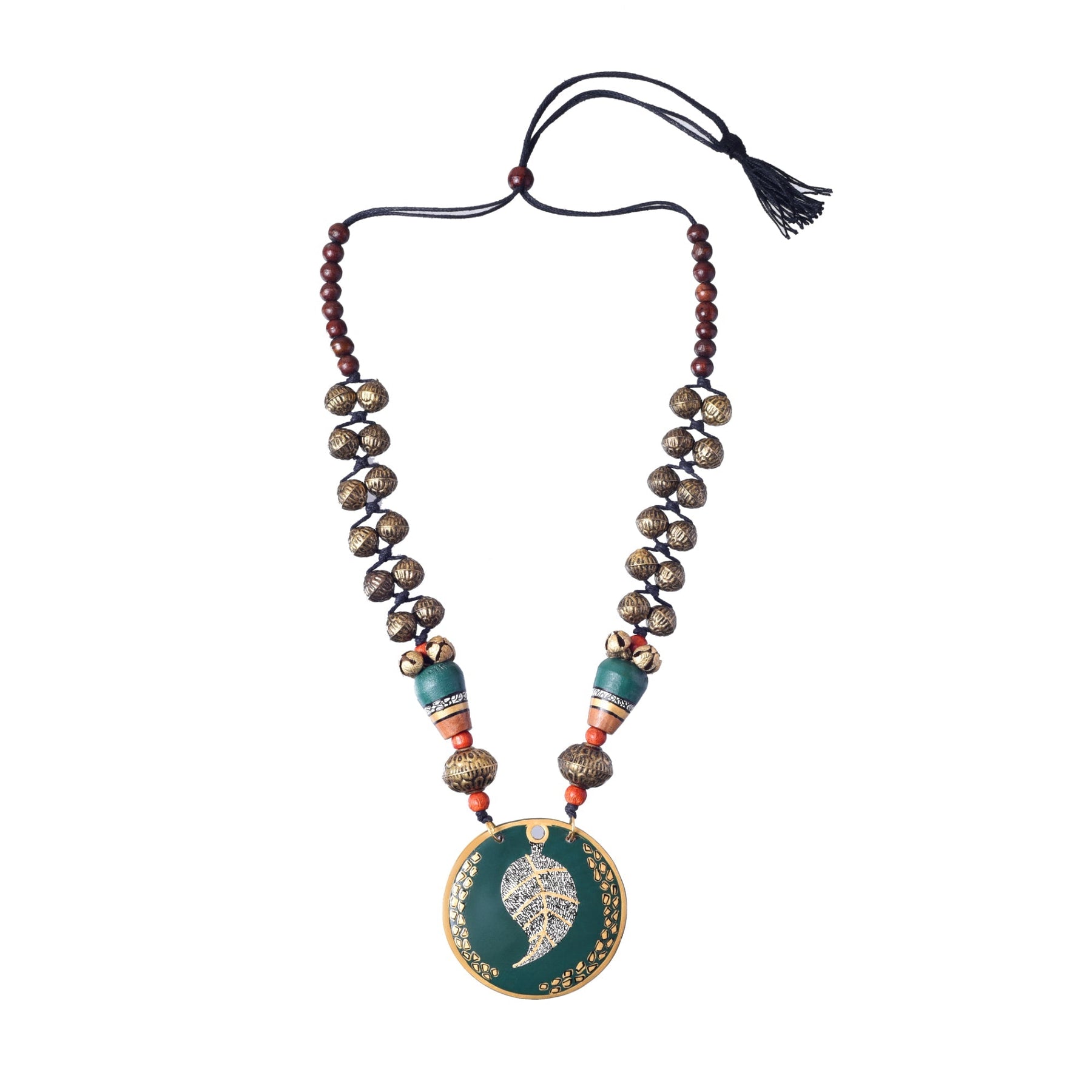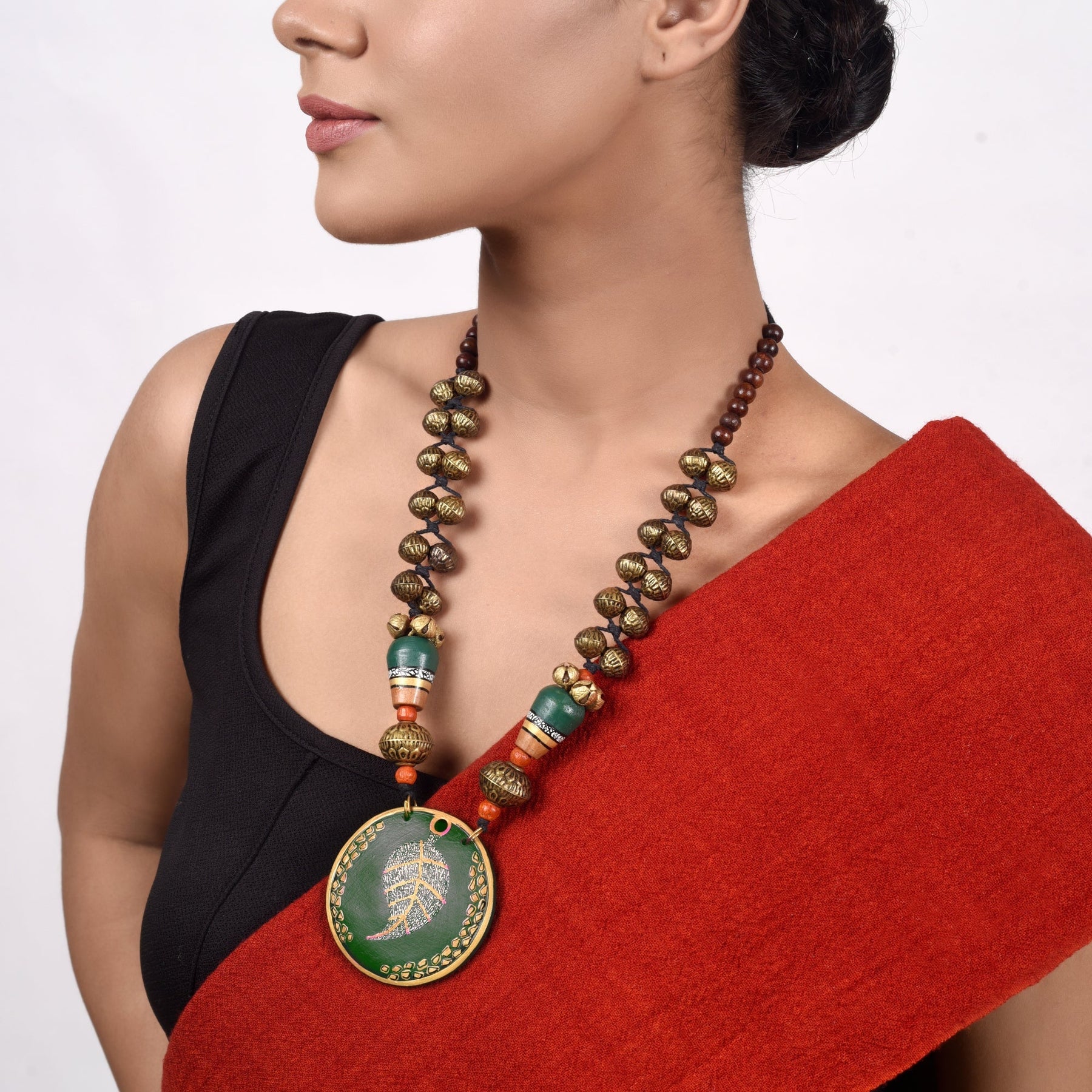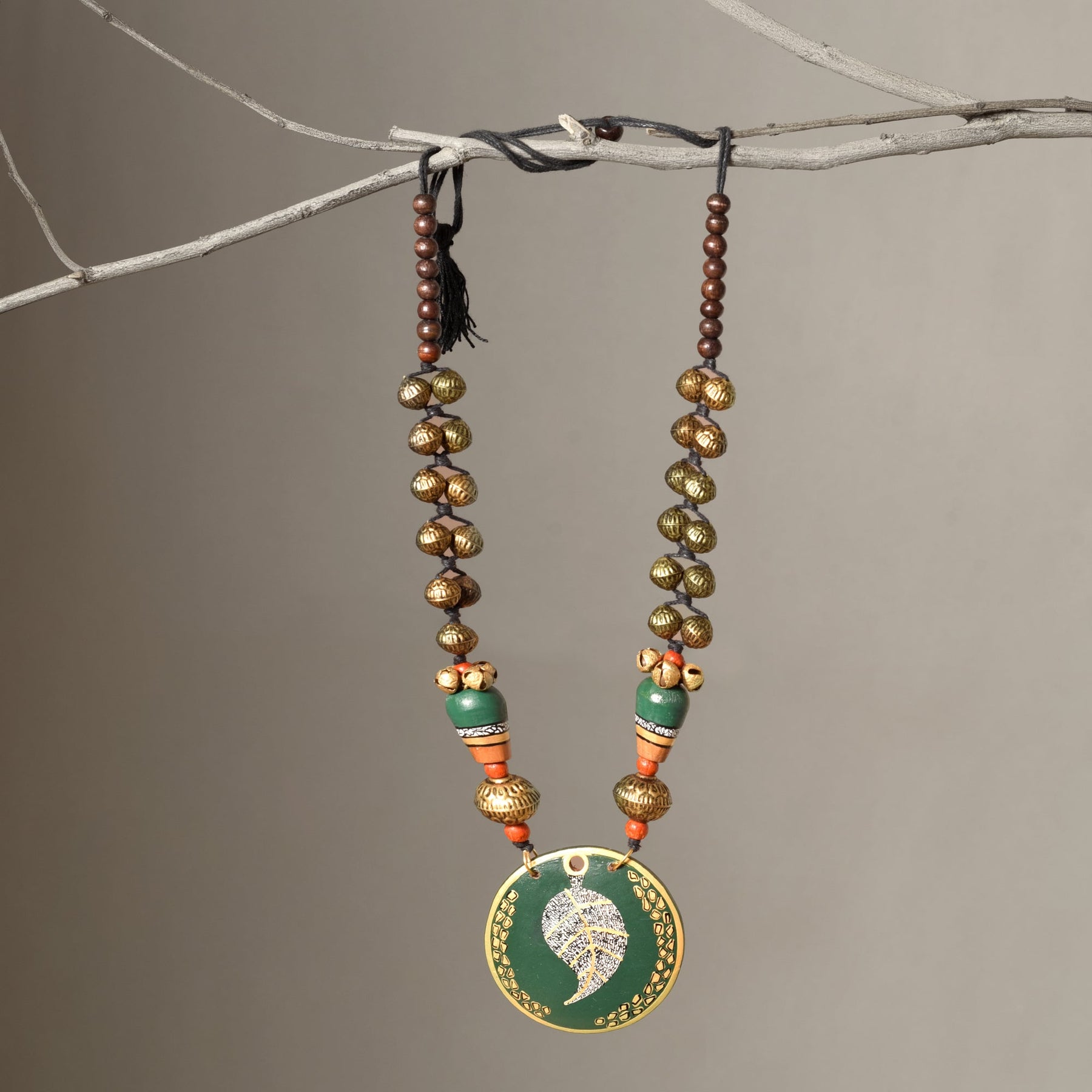Embrace nature's beauty with our Verdant Leaf Brass Necklace, showcasing a wooden pendant adorned with hand-painted green leaf motifs. Crafted with a combination of hand-painted wooden and brass beads, it exudes artisanal charm.