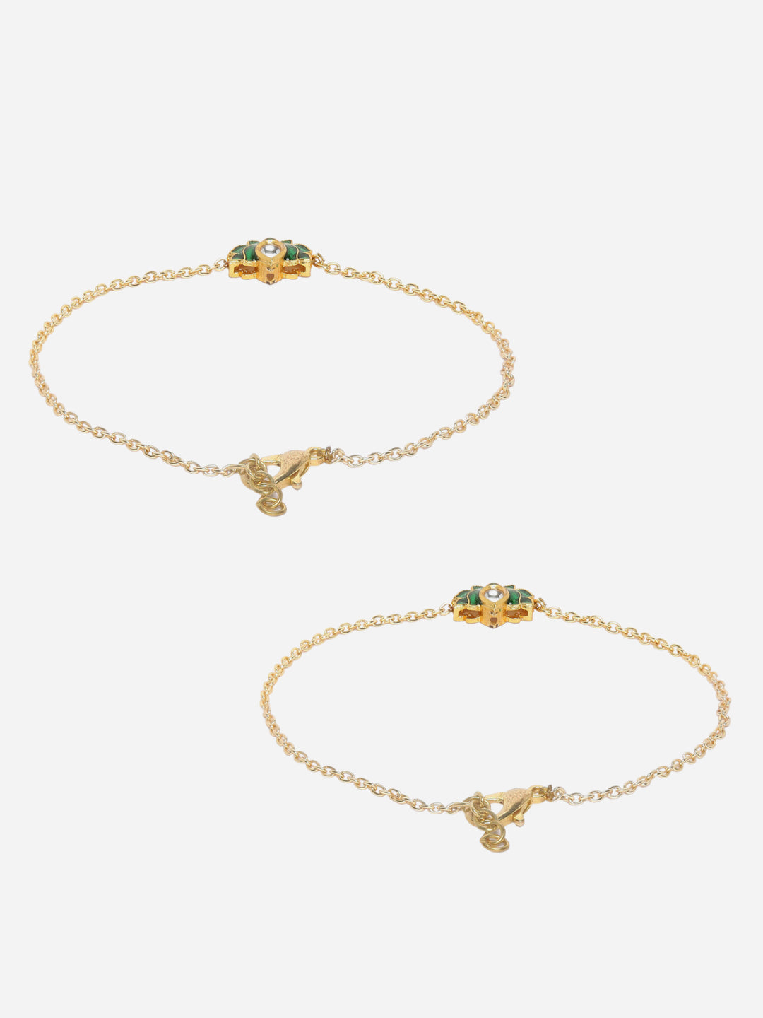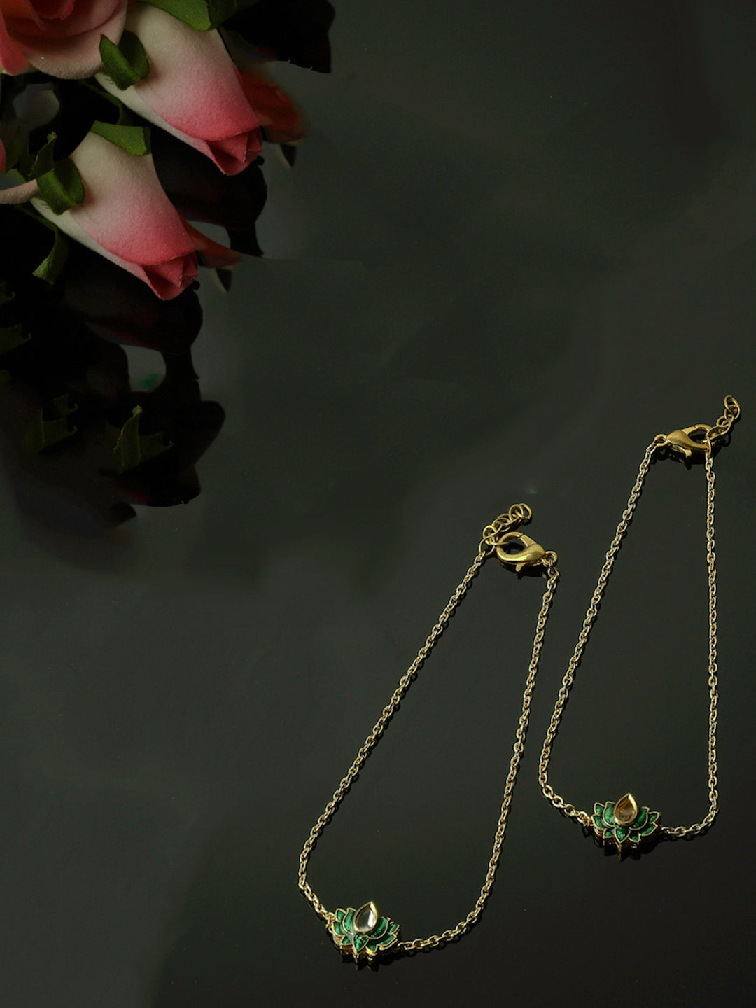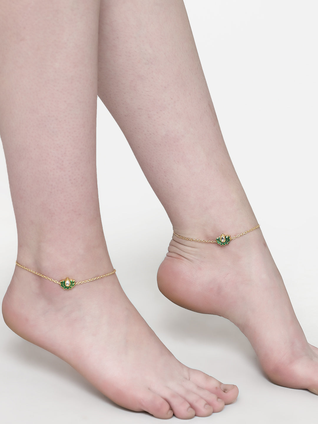 Green Meenakari Lotus In Payal To Giove U Super Light And Elegant Look This Festive Season; Category Of Jewellery Is Other Accessories; Sub Category Is Anklet; Ideal For Women; Color Is Green, Gold, White; Gemstones Used - Kundan, Pearls, Natural Stones; Plating Is Gold-Plated; Base Metal Is Alloy; Other Material Used - Adjustable Chain; Size Is Freesize; Adjustable - Yes; Weight Is 5 Gms; Mesaurements - Length Of Payal =25.3 Cm; Width Of Payal = 1.2 Cm; Adjustable - Yes; Content 1 Pair Anklet