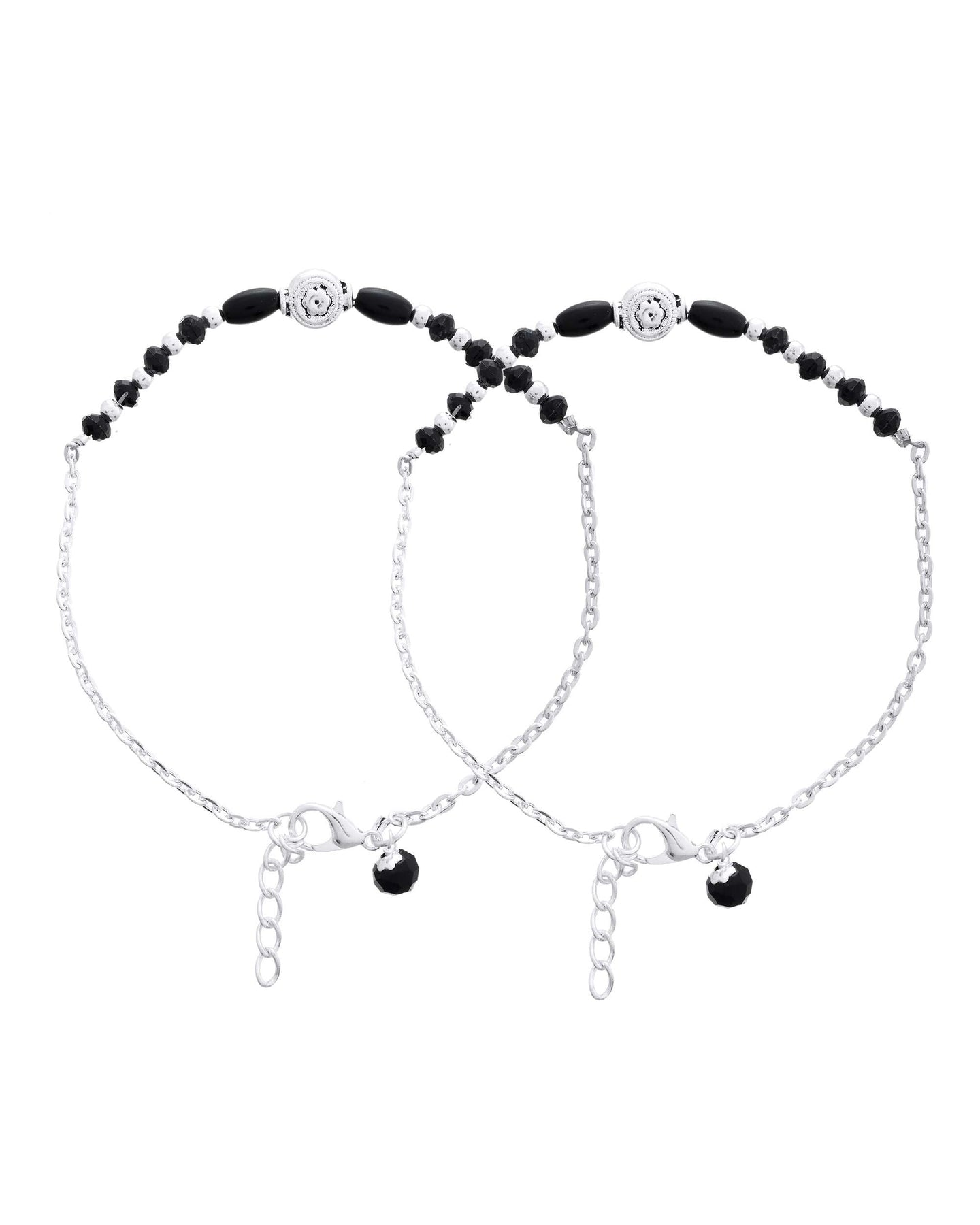 Enhance Your Traditional Or Indo-Western Look With This Set Of 2 Silver-Plated Beaded Anklets, Meticulously Crafted With Artificial Black Stones And Antique Floral Charms. Designed In High-Quality Stainless Steel With A Radiant Silver Plating, These Anklets Offer Durability With An Elegant Appeal. The Dual-Layer Design Features A Mix Of Round And Oval Beads, Making Them The Perfect Fusion Of Classic And Contemporary. Whether You'Re Dressing Up For A Festive Event, A Cultural Celebration, Or Simply Accessorizing A Casual Day Look, These Anklets Add A Graceful Rhythm To Every Step.