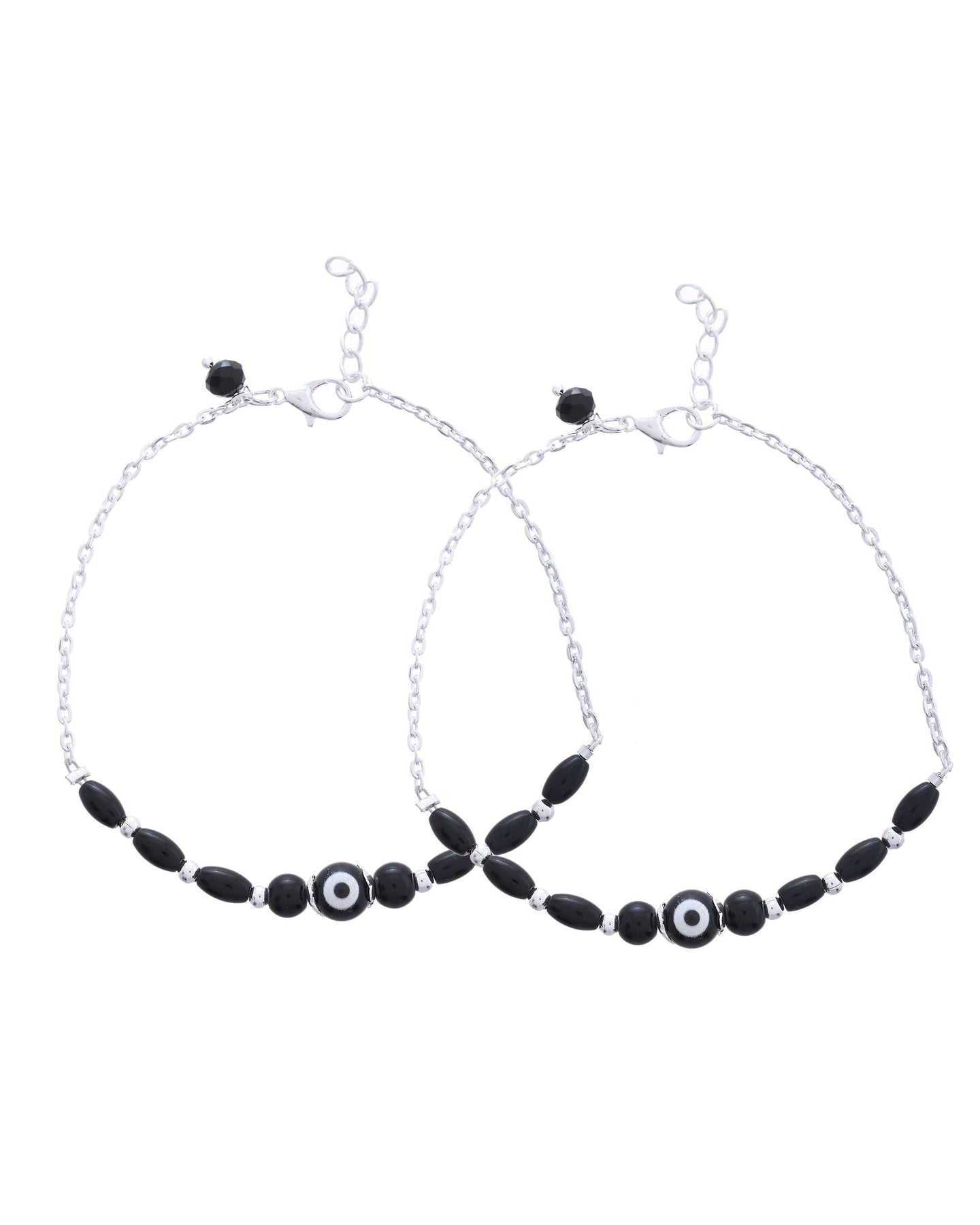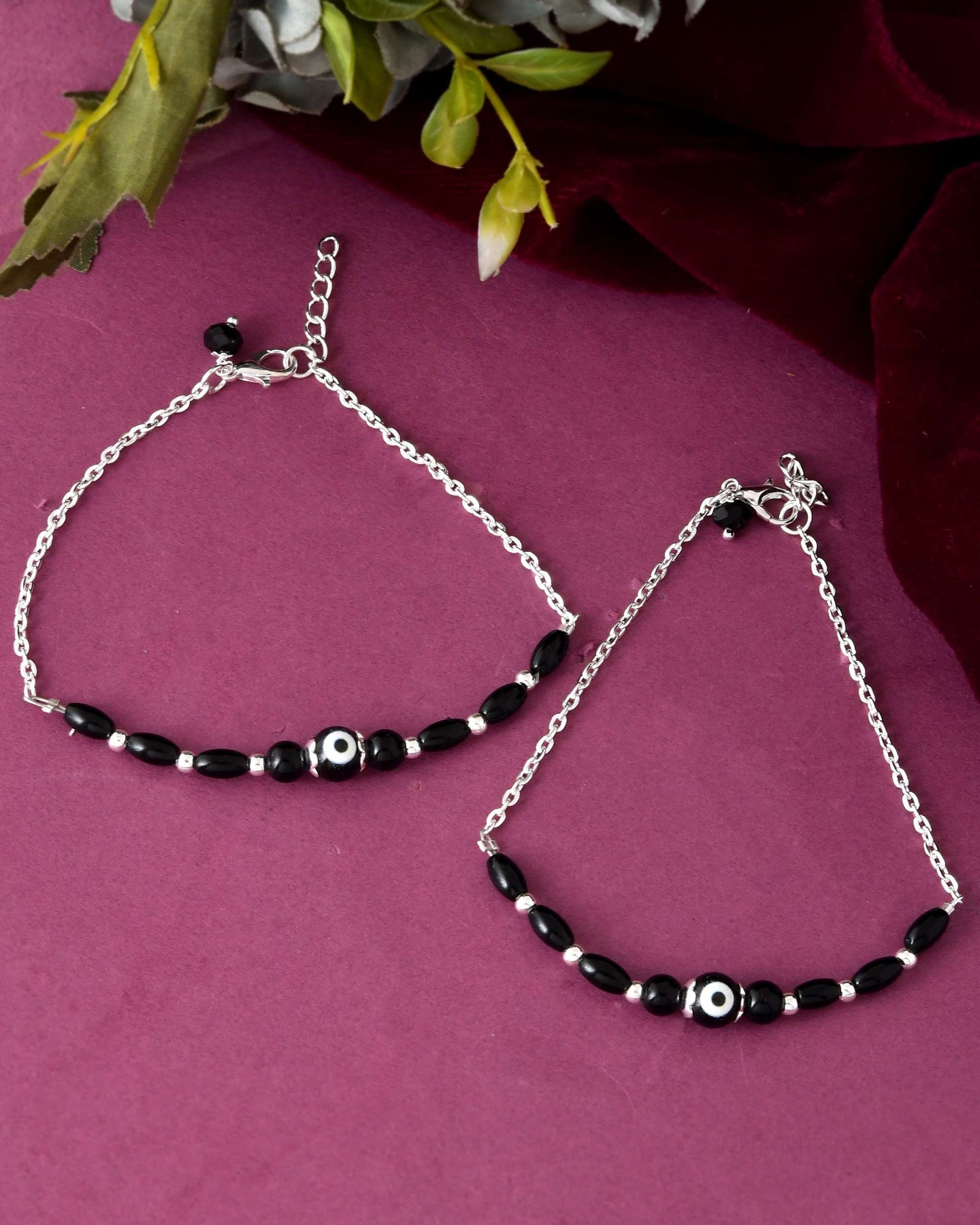 Add A Spiritual Twist To Your Style With This Striking Pair Of Charm Anklets Crafted From Premium-Grade Stainless Steel And Plated With An Elegant Silver Finish. Designed To Blend Traditional Vibes With Modern Elegance, These Anklets Feature Deep Navy Blue Artificial Stones And The Iconic Evil Eye Motif That Symbolizes Protection And Good Luck. The Secure Lobster Clasp Ensures A Comfortable Fit, While The Intricate Beaded Layout Makes It Perfect For Everyday Wear Or Festive Dressing. Lightweight Yet Durable, This Anklet Pair Elevates Your Ethnic And Indo-Western Outfits Effortlessly. Whether You'Re Heading To A Celebration Or Just Stepping Out Casually, This Fashion-Forward Accessory Brings Grace, Positivity, And Style To Your Look.