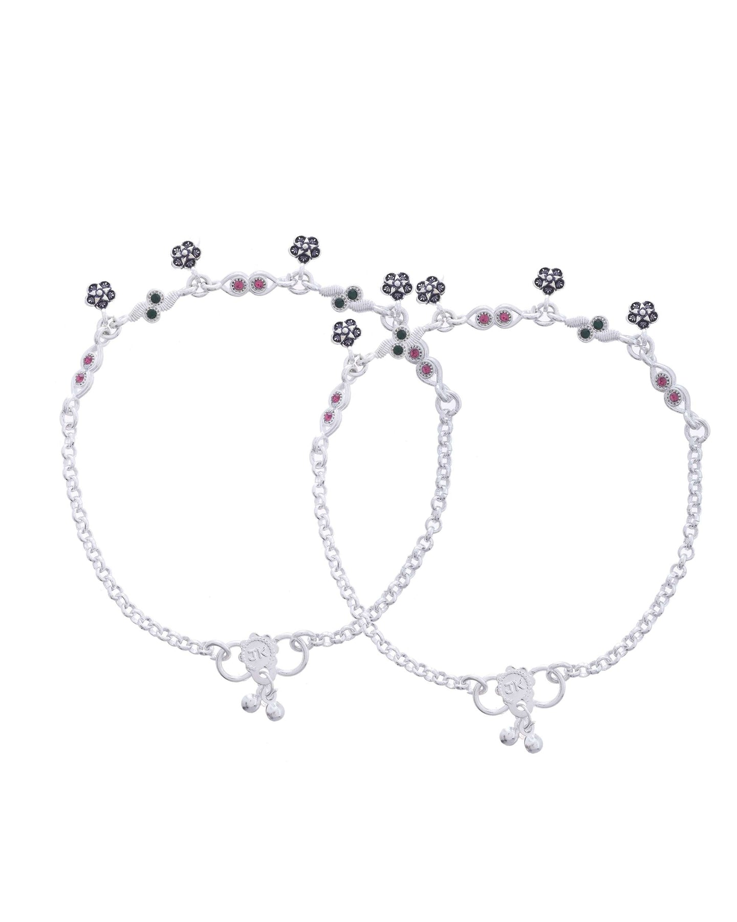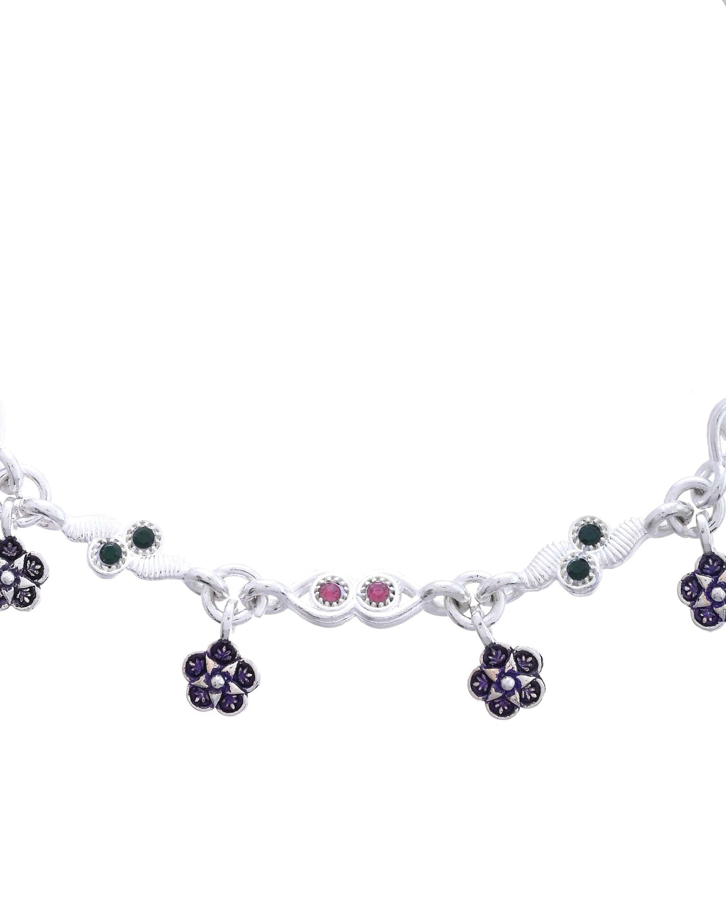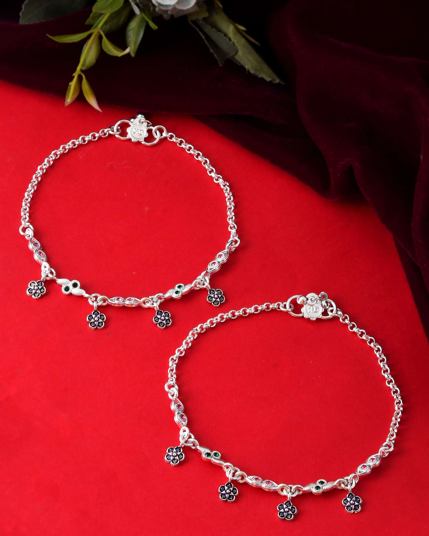 Step Into Elegance With This Charming Anklet Set Featuring Dainty Floral Charms And Vibrant Coloured Stones. Crafted From Premium Stainless Steel And Finished With A Radiant Silver Plating, These Anklets Offer Durability With A Touch Of Glamour. The Floral Detailing Combined With Dual Chains Makes Them A Standout Accessory That Effortlessly Blends Tradition With Trend. Lightweight And Comfortable For Everyday Use, These Anklets Are A Great Choice For Festive Occasions, Ethnic Outfits, Or Simply Adding A Fun Twist To Your Daily Look.