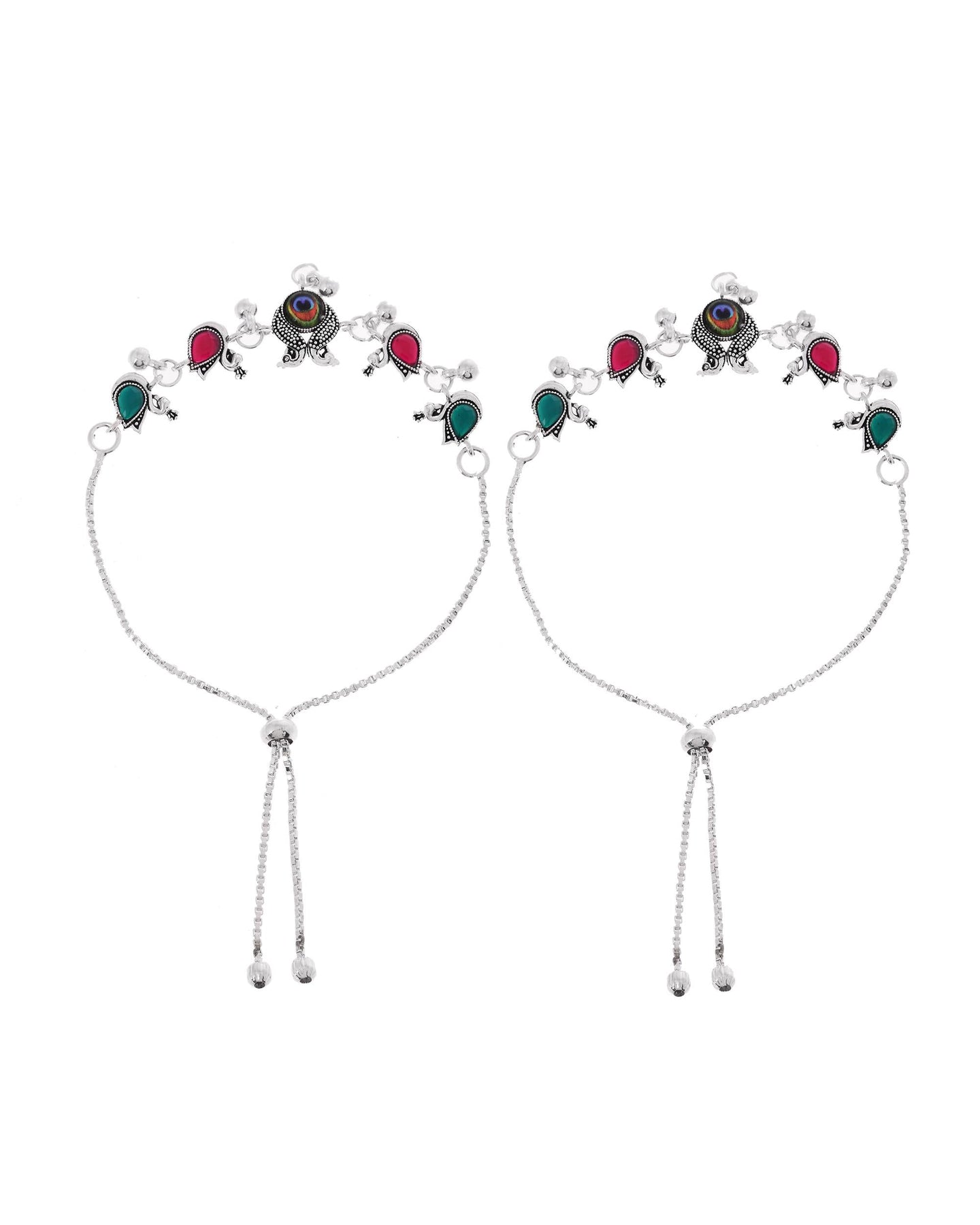 This Set Of 2 Silver-Plated Anklets Showcases Stunning Peacock-Shaped Designs, Intricately Studded With Sparkling Stones. The Beautiful Combination Of Elegance And Charm Makes Them Perfect For Any Special Occasion. Adjustable For A Comfortable Fit, These Anklets Add A Graceful Touch To Your Look. Elevate Your Style With These Timeless, Eye-Catching Accessories.