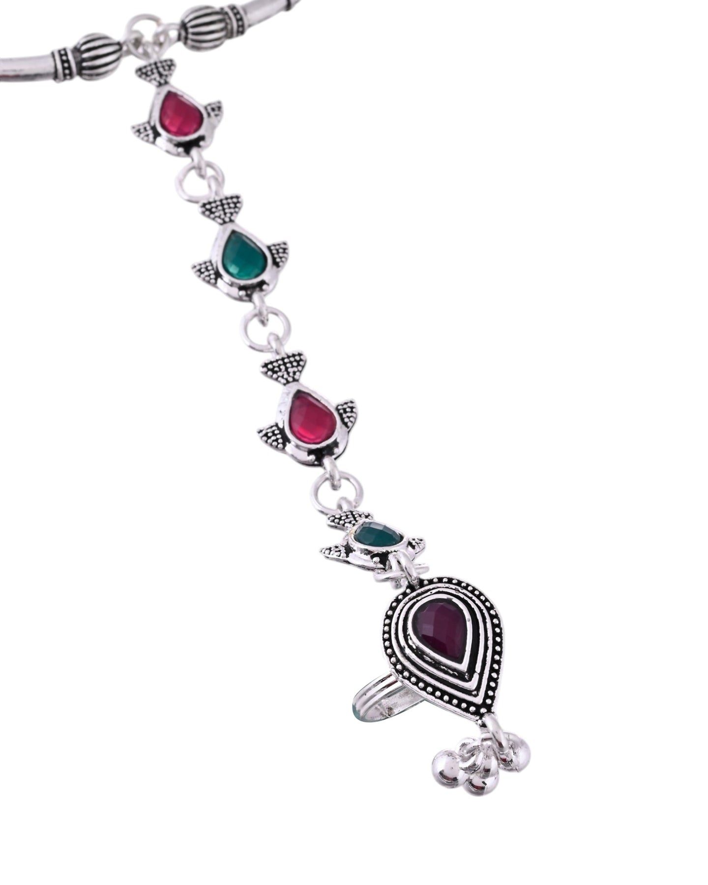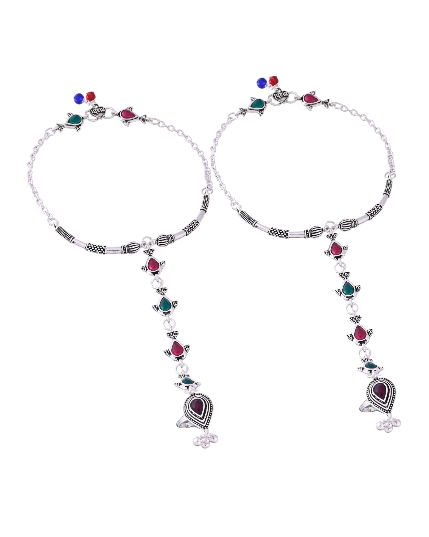 This Set Of 2 Silver Toned Meenakari Anklets With Toe Ring Beautifully Blends Traditional Artistry With Modern Elegance. Adorned With Vibrant Meenakari Detailing, The Anklets Feature Intricate Designs That Capture The Essence Of Classic Craftsmanship. Paired With A Matching Toe Ring, This Set Adds A Charming And Colorful Touch To Your Feet, Making It Perfect For Festive Occasions, Weddings, Or Everyday Wear.