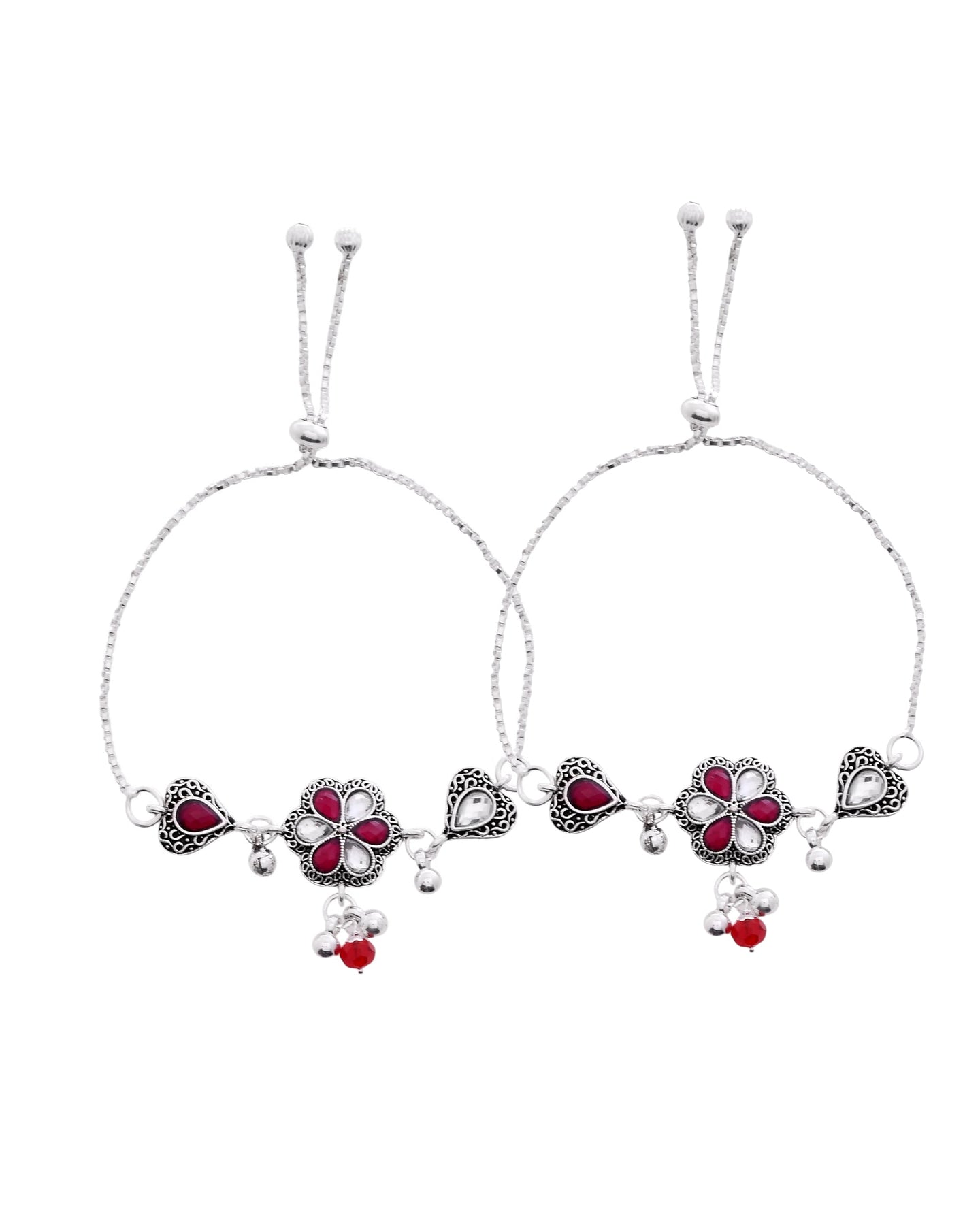 This Set Of 2 Silver Plated Floral Meenakari Anklets Combines Traditional Charm With Vibrant Artistry. Adorned With Intricate Floral Meenakari Designs And A Sleek Silver-Plated Finish, These Anklets Add A Colorful, Elegant Touch To Your Look. Perfect For Festive Occasions, Weddings, Or Casual Wear, This Set Enhances Your Style With Timeless Beauty And Grace, Making It A Must-Have Addition To Your Jewelry Collection.