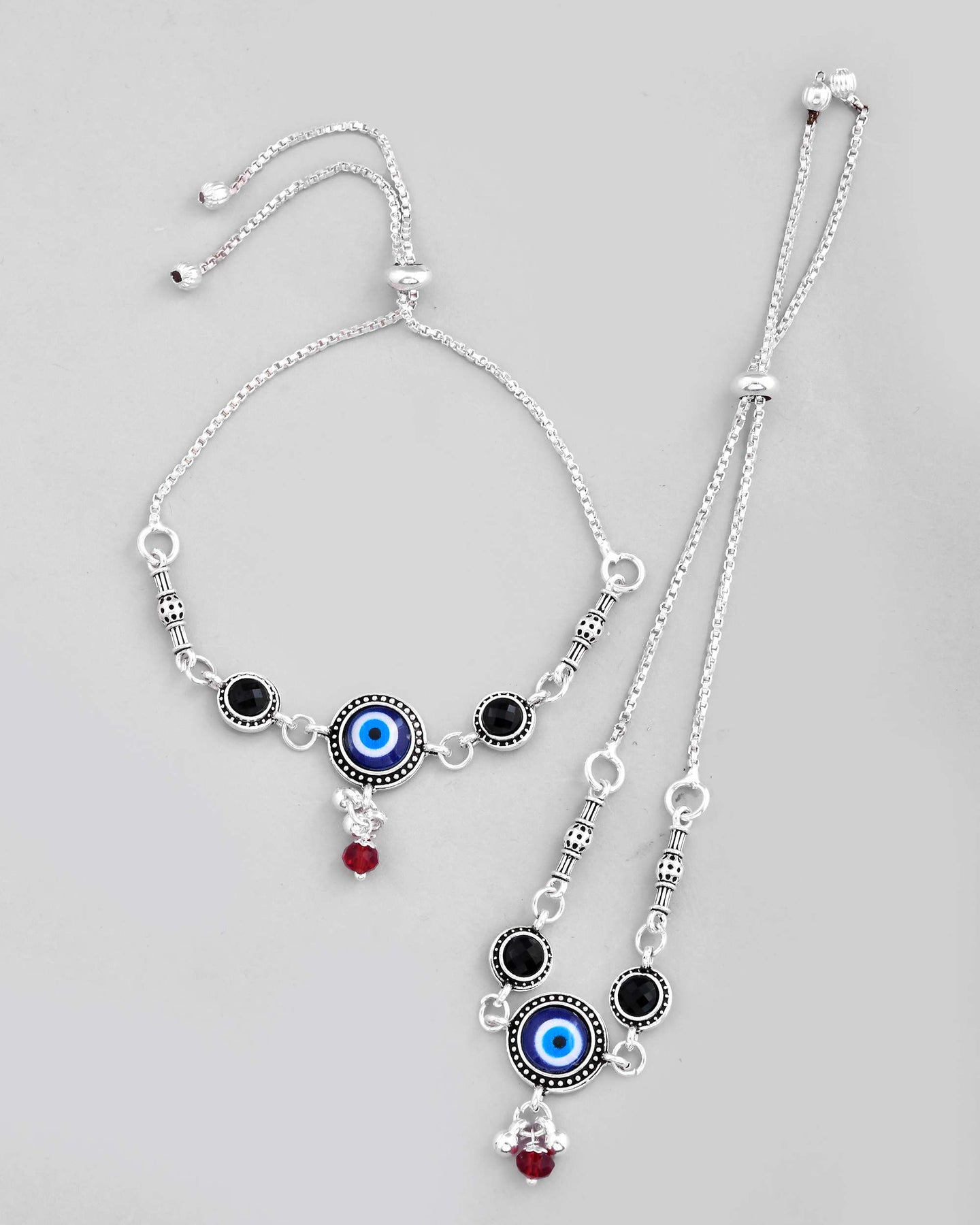 Add a touch of elegance and protection to your style with our set of two silver-plated handcrafted adjustable anklets featuring the iconic evil eye design. Each anklet is meticulously crafted to ensure a unique look, blending beauty with a meaningful symbol of good fortune. Perfect for layering or wearing solo, these anklets make a thoughtful gift or a lovely treat for yourself!