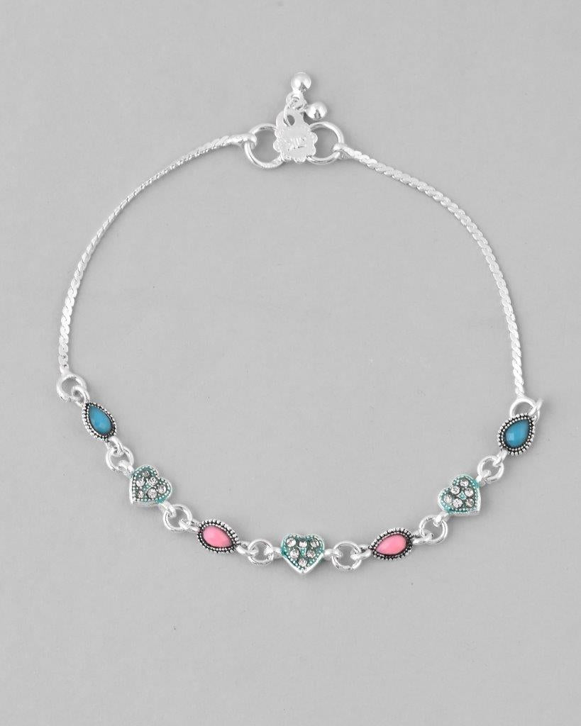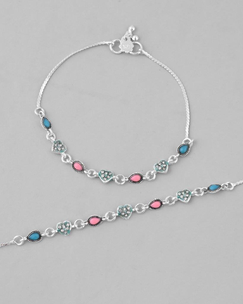 Express Your Love For Unique Jewelry With Our Set Of 2 Silver Plated Heart Shaped Meenakari Anklets. Each Anklet Features An Enchanting Heart Design, Beautifully Enhanced With Vibrant Meenakari Work That Showcases Exquisite Craftsmanship. The Silver Plating Provides Durability And A Radiant Shine, Making These Anklets Perfect For Both Everyday Wear And Special Occasions. Lightweight And Comfortable, They Add A Charming Touch To Any Outfit, Making Them A Delightful Accessory For The Modern Woman Who Appreciates Traditional Artistry With A Contemporary Flair.