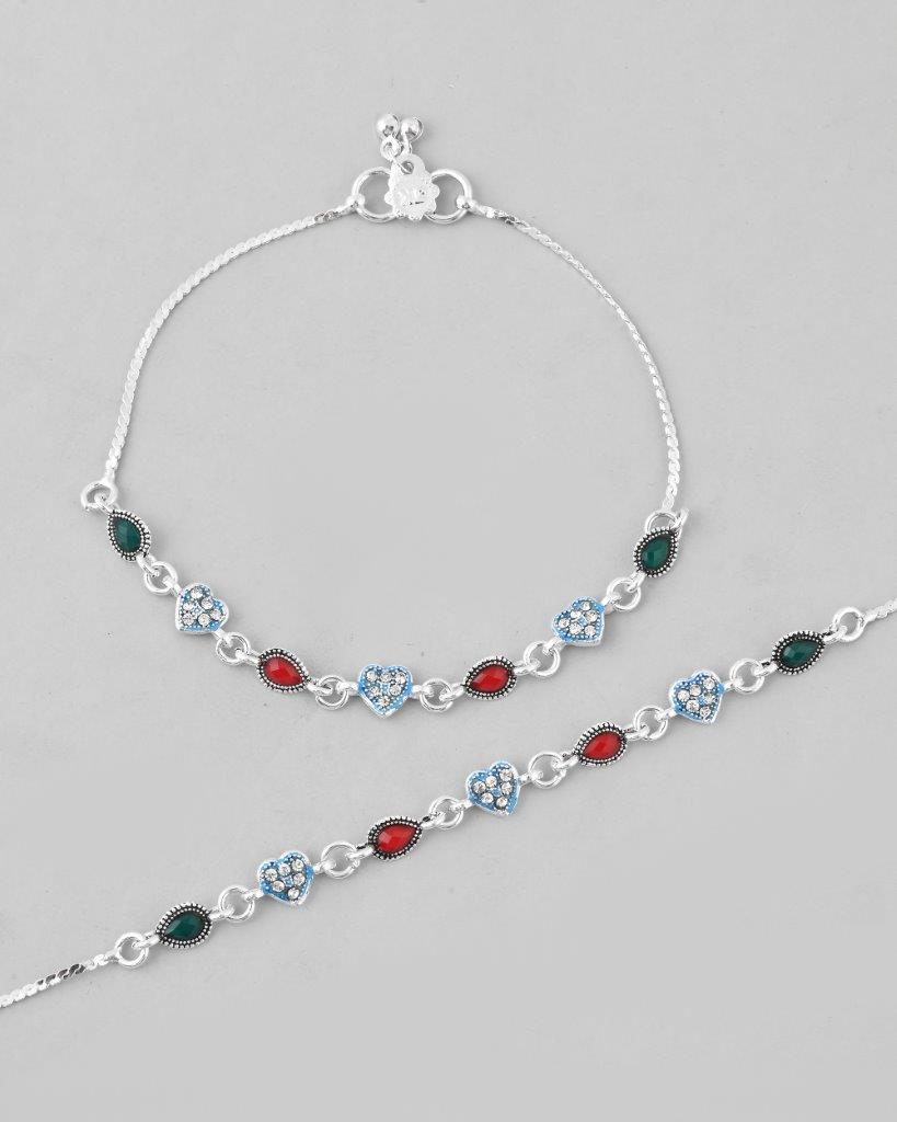 Add A Touch Of Romance To Your Jewelry Collection With Our Set Of 2 Silver Plated Heart Shaped Stone Studded Anklets. Each Anklet Features A Charming Heart Design, Elegantly Adorned With Sparkling Stones That Catch The Light Beautifully. Crafted From High-Quality Silver Plating, These Anklets Ensure Durability And A Lasting Shine, Perfect For Everyday Wear Or Special Occasions. Lightweight And Comfortable, They Effortlessly Enhance Any Outfit, Making Them A Must-Have Accessory For The Modern Woman Who Loves To Express Her Unique Style With Elegance.