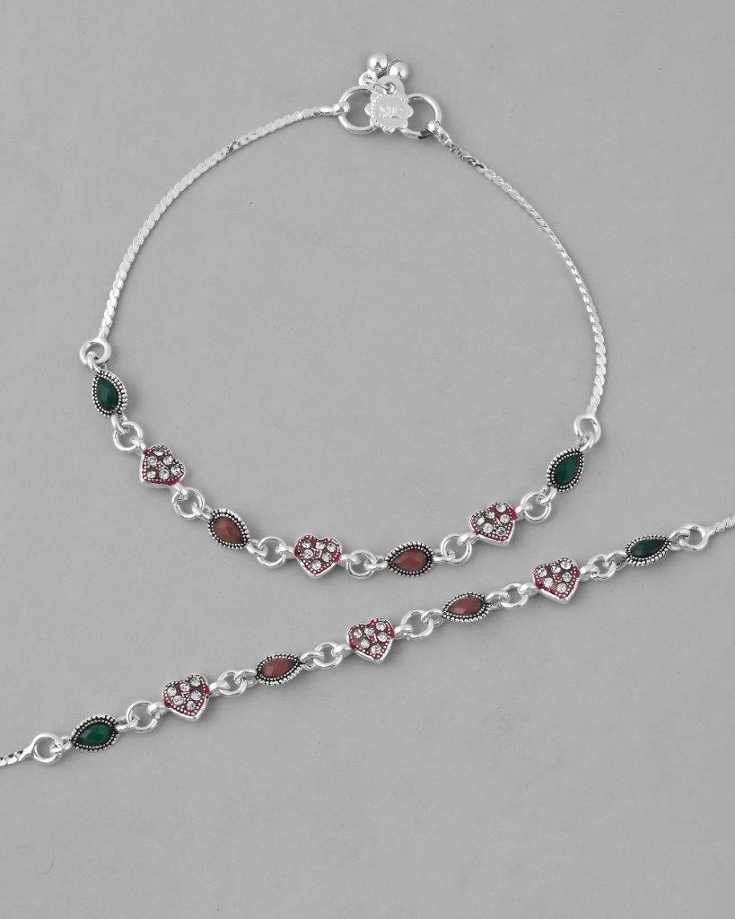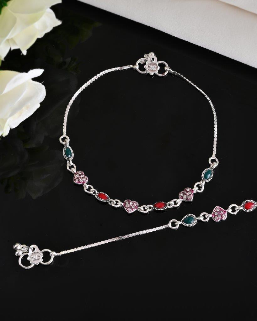 Brighten Your Accessory Collection With Our Set Of 2 Silver Plated Heart Shaped Multi Color Anklets. Each Anklet Features An Adorable Heart Design Beautifully Embellished With Vibrant Multi-Color Accents That Add A Playful Touch To Your Look. Crafted From High-Quality Silver Plating, They Offer Durability And A Radiant Shine, Making Them Perfect For Both Everyday Wear And Festive Occasions. Lightweight And Comfortable, These Anklets Are Designed To Complement Any Outfit, Making Them An Essential Accessory For The Modern Woman Who Loves To Express Her Unique Style!