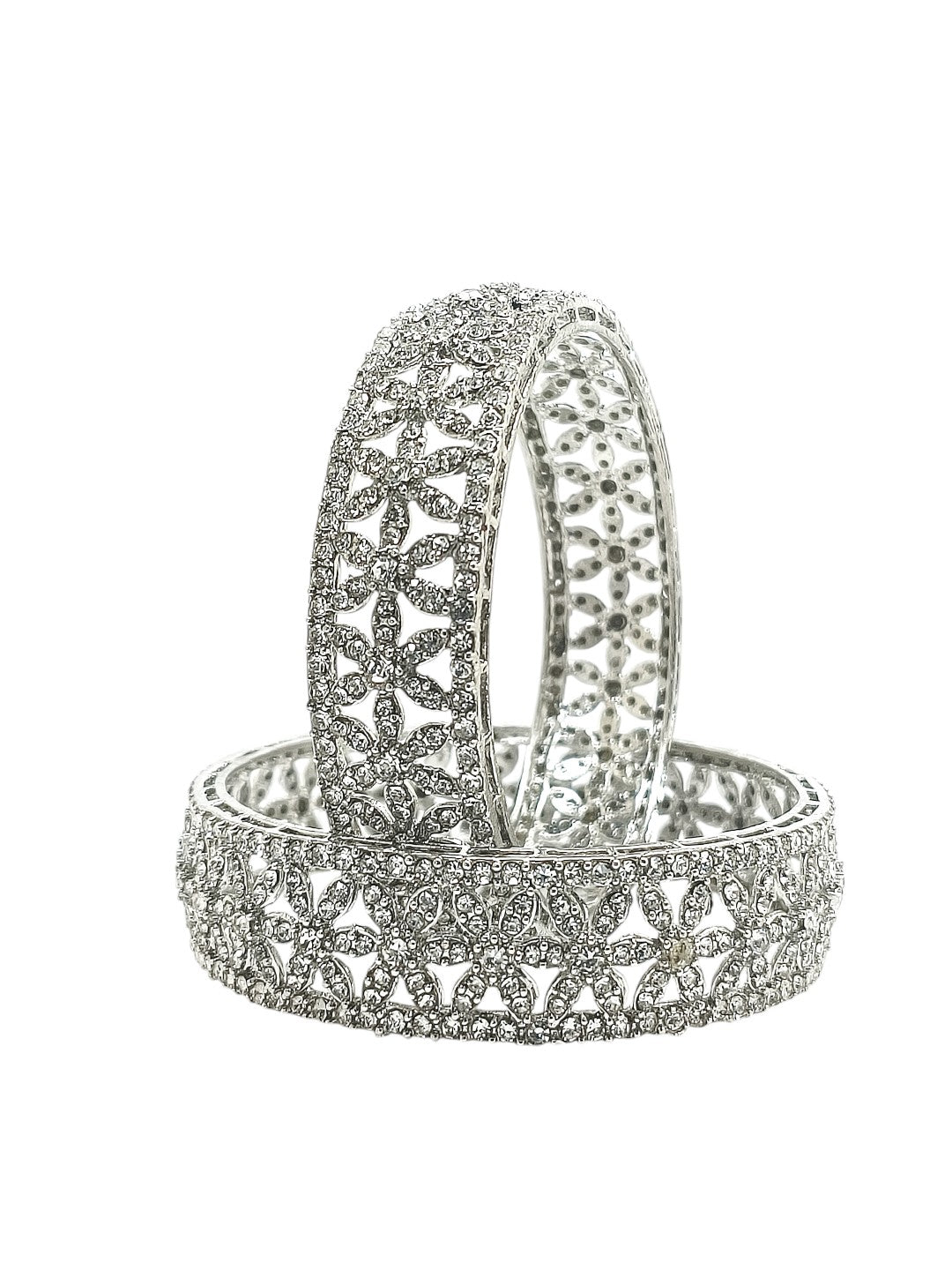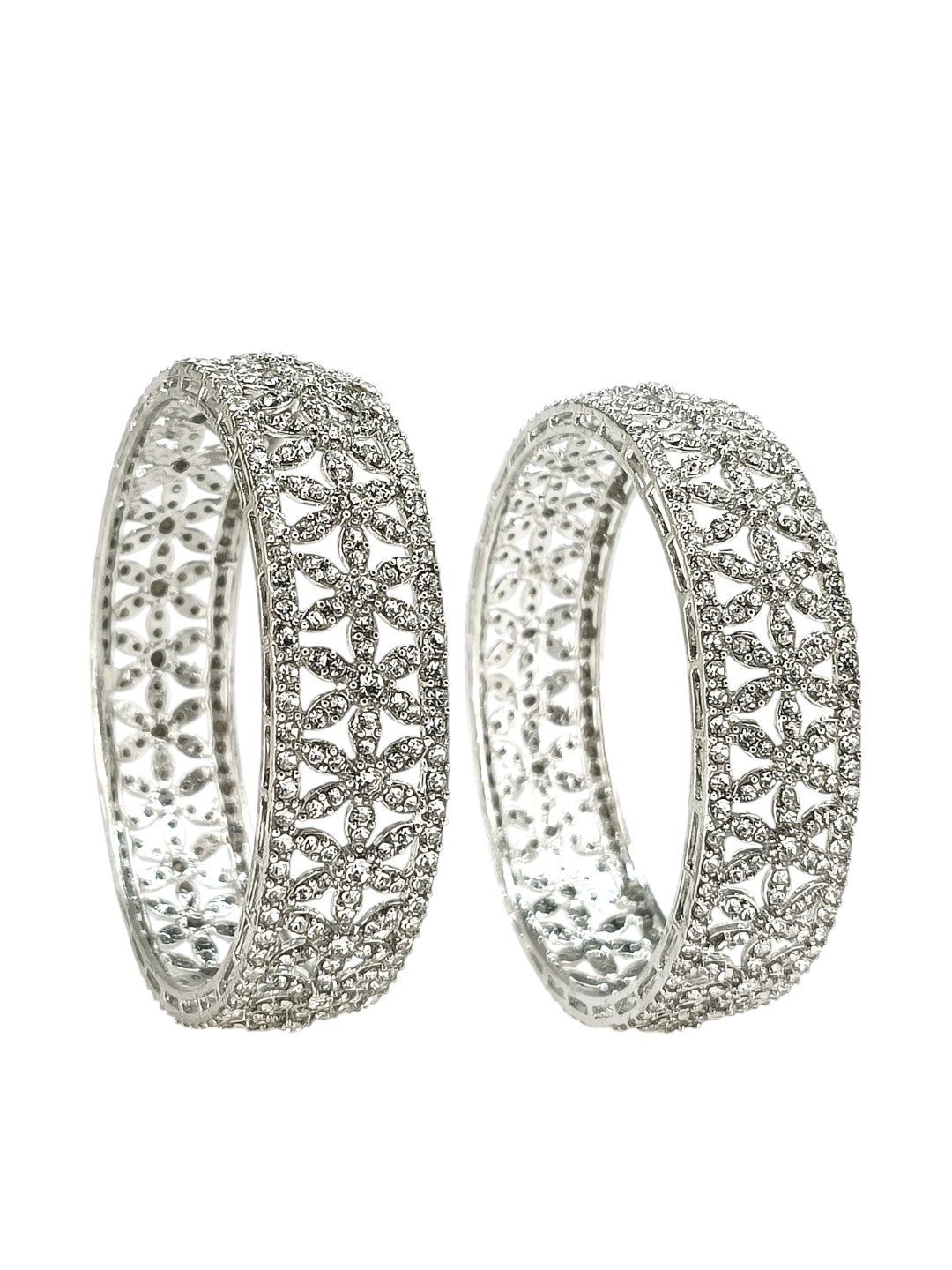 Set Of 2 Silver Toned Broad Bangle Set Studded With Cubic Zircon. Secured With Slip On Closure