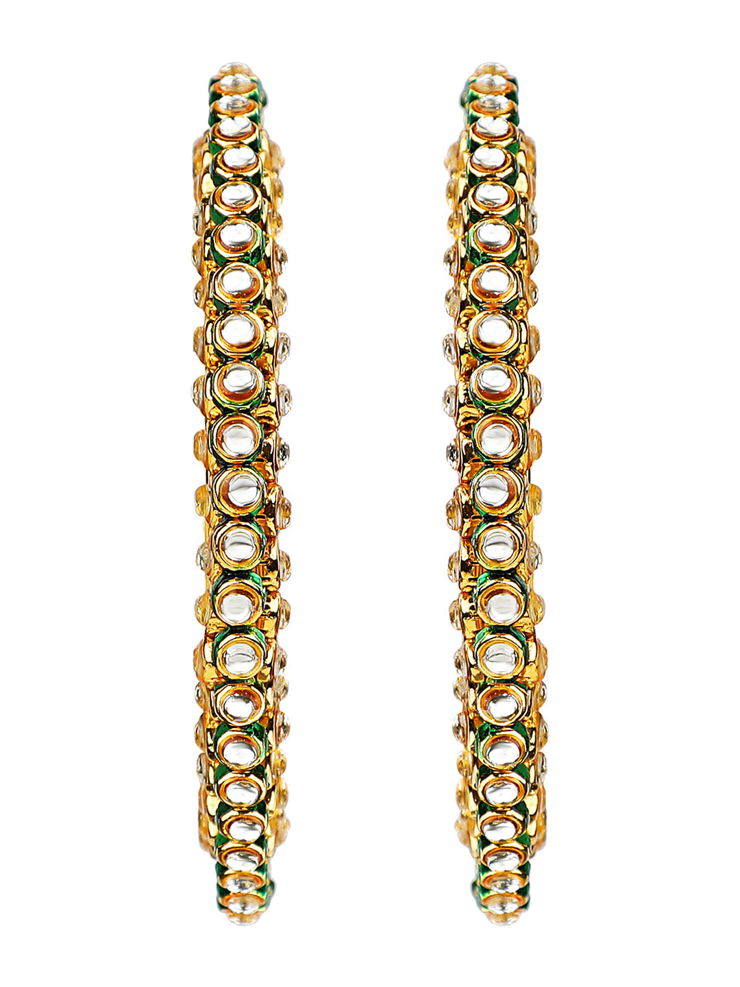 Royal Rajputi Style Gold-Plated Kundan Bangle Is A Timeless Piece Of Jewelry That Effortlessly Blends Traditional Craftsmanship With Style. Green Meenakari Accents With Gold Plating Adds A Lustrous Shine To The Bangle. These Stones Add Sparkle And Glamour To The Bangle. This Outstanding Design Is A Must Have For Those Special Events In Your Life. Size Available : 2.4 (2.2 Inch Inner Diameter - 7.1 Inch Circumference) Condition : New Never Worn Contents : Set Of 2
