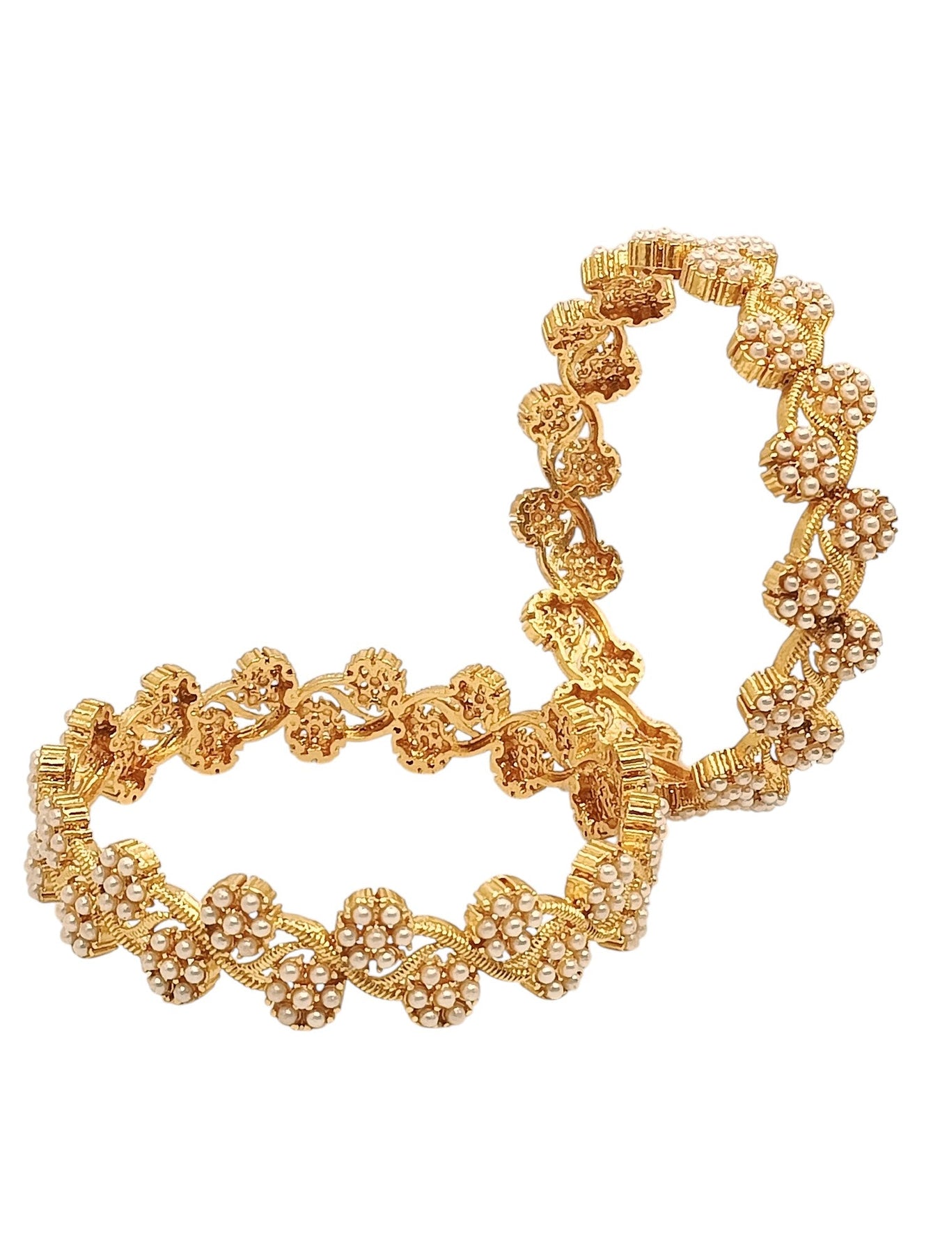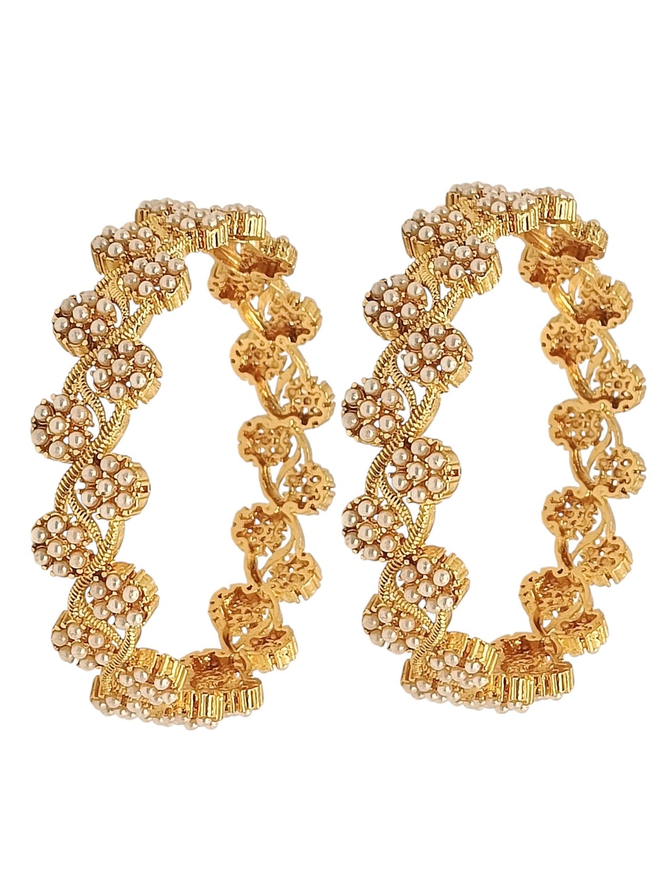 Set Of 2 Gold Toned Floral Design Bangles Set Studded With White Beads. Secured With Slip On Closure.