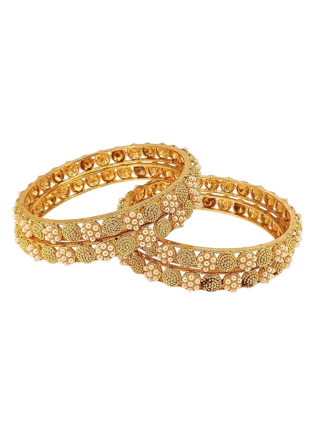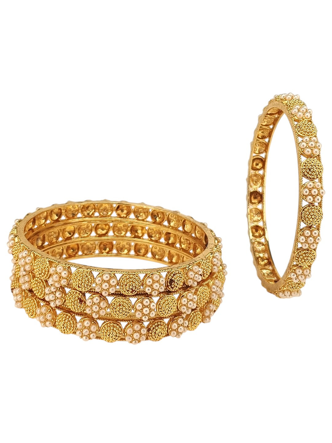Set Of 4 Gold Plated White Beads Studded Detail Bangles Set. Secured With Slip On Closure.