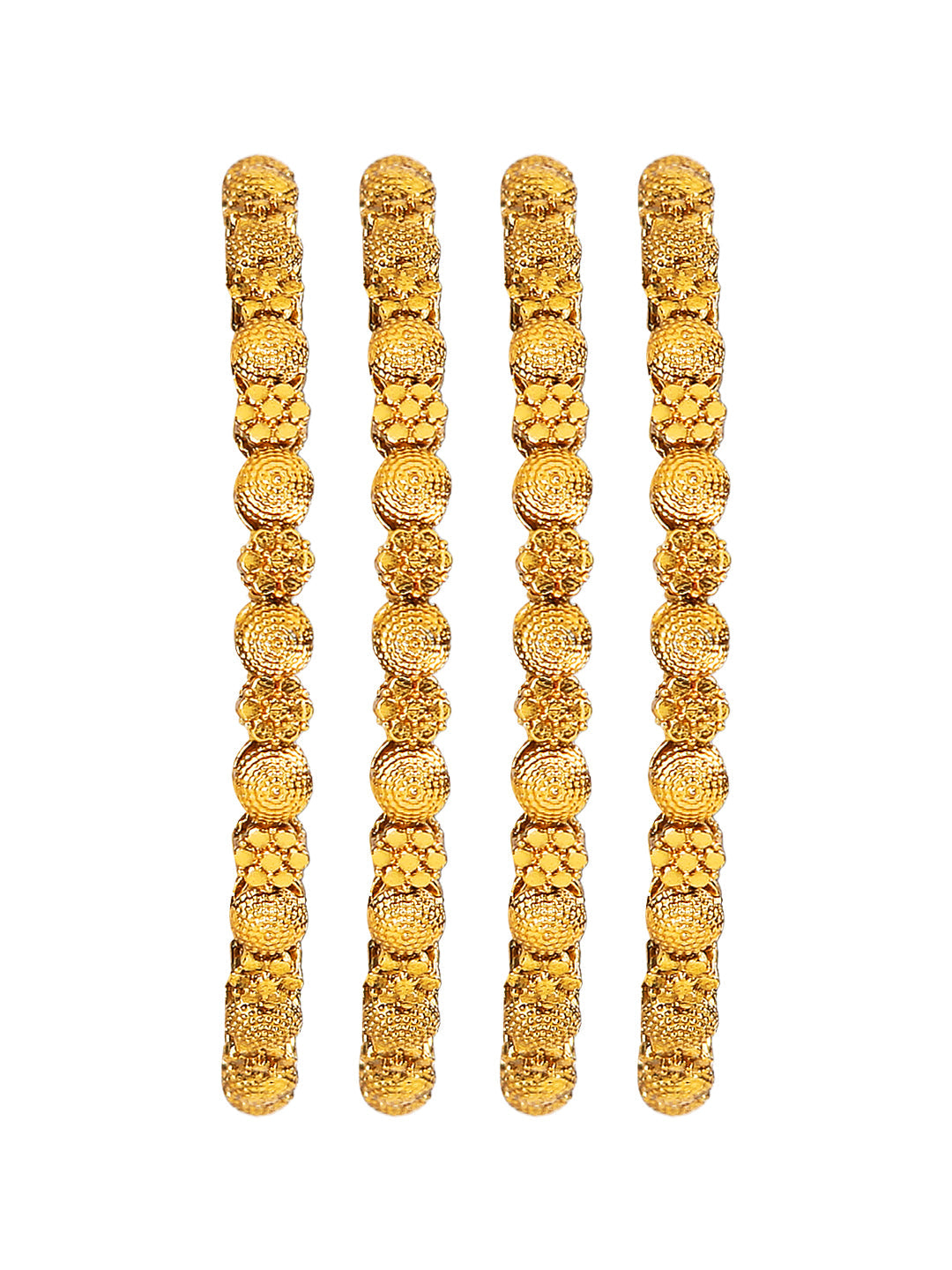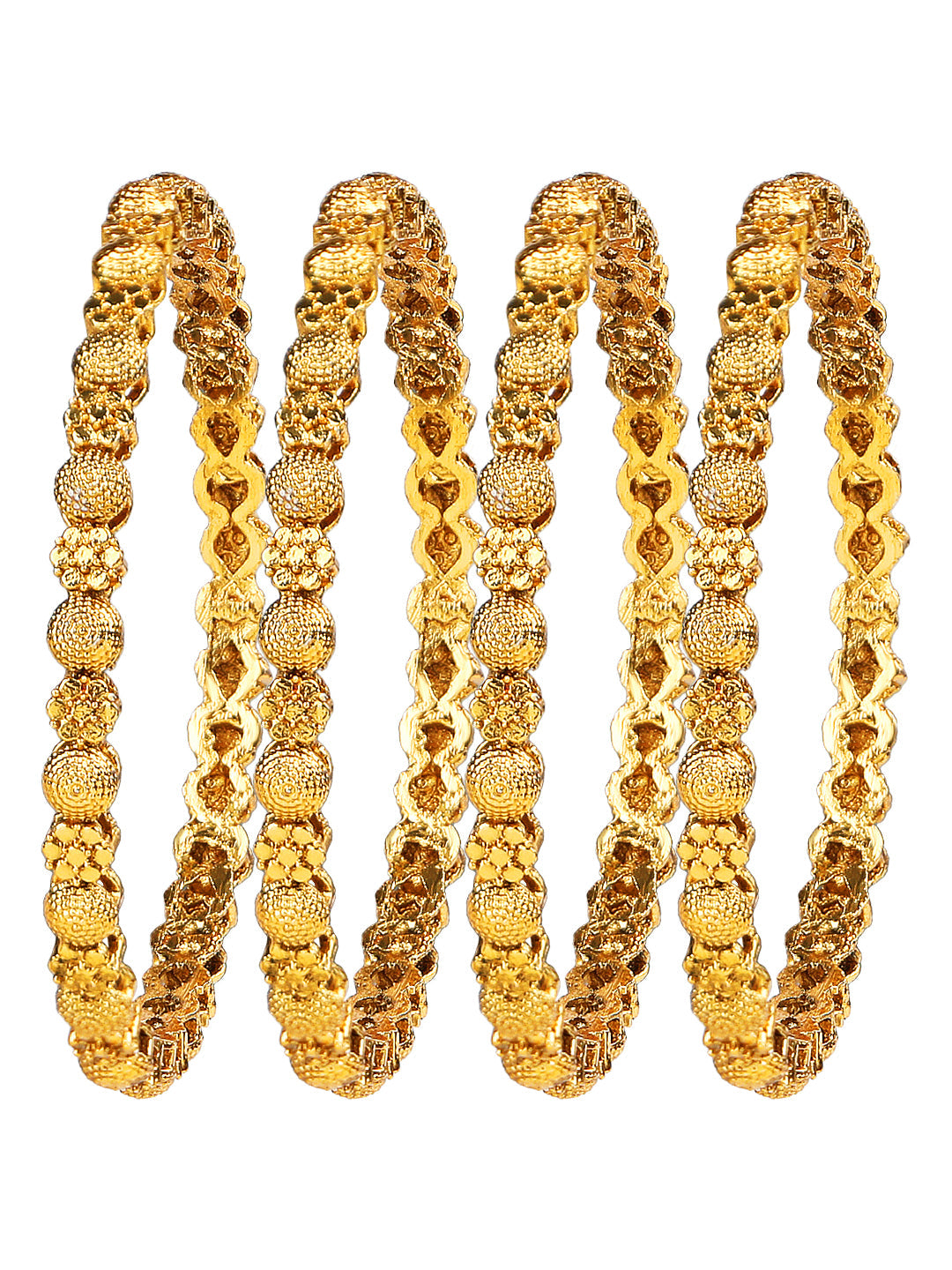 Crafted With Meticulous Bangles Feature Intricate Floral Designs That Add A Touch Of Sophistication To Any Outfit.The Gold Plating Lends A Luxurious Sheen, Making Them Perfect For Both Formal Occasions And Ethnic Wear.These Bangles Are Sure To Become A Treasured Addition To Your Jewelry Collection.Each Bangle Features Intricate Floral Motifs, Delicately Sculpted To Enhance Their Beauty And Charm. Size Available : 2.4 (2.2 Inch Inner Diameter - 7.1 Inch Circumference) Condition : New Never Worn Contents : Set Of 4