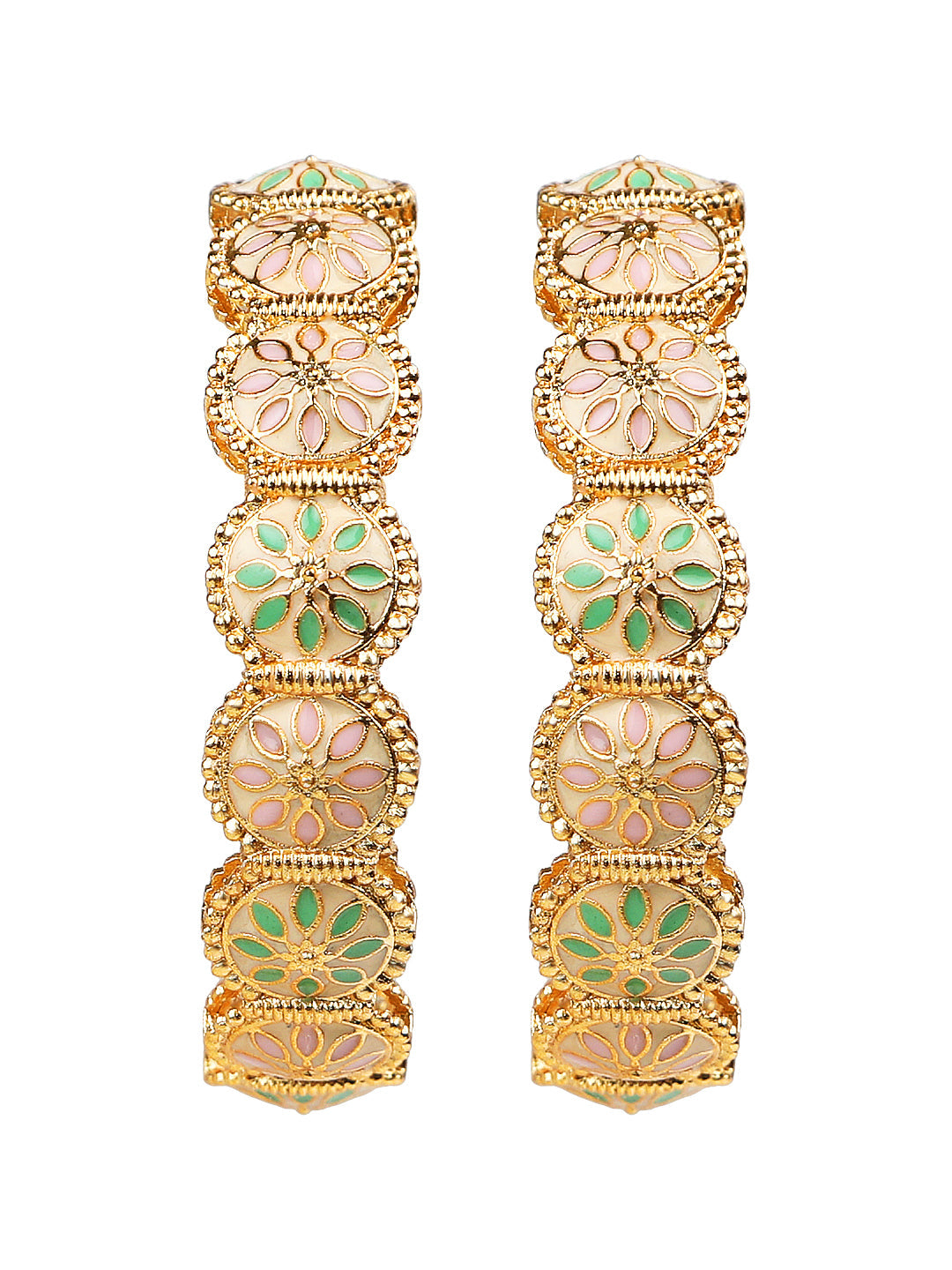 Adorn Your Wrist With This Exquisite Gold Plated Meenakari Bangle Featuring Delicate Baby Pink Florals.This Gold Plated Meenakari Bangle Is A Testament To Timeless Elegance.The Delicate Detailing And Soft Pastel Florals Add A Touch Of Magic To Your Jewelry Collection.Intricate Design Create A Piece That Is As Elegant As It Is Versatile, Perfect For Adding A Touch Of Sophistication To Any Ensemble. Size Available : 2.4 (2.2 Inch Inner Diameter - 7.1 Inch Circumference) Condition : New Never Worn Contents : Set Of 2