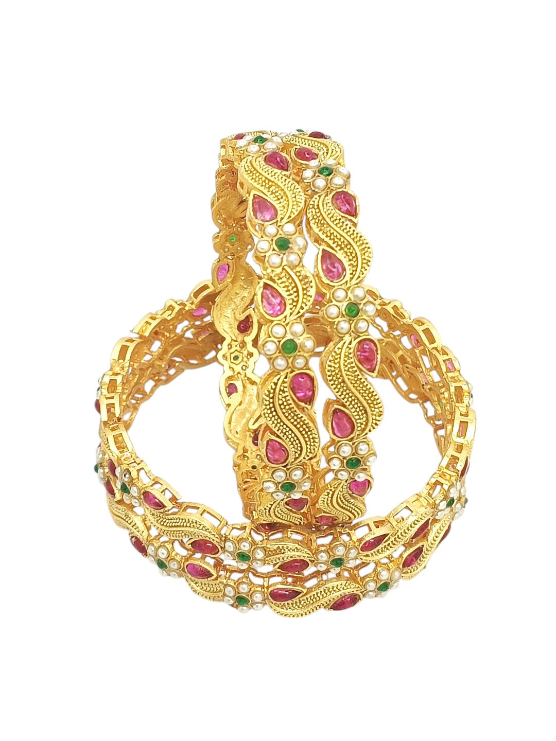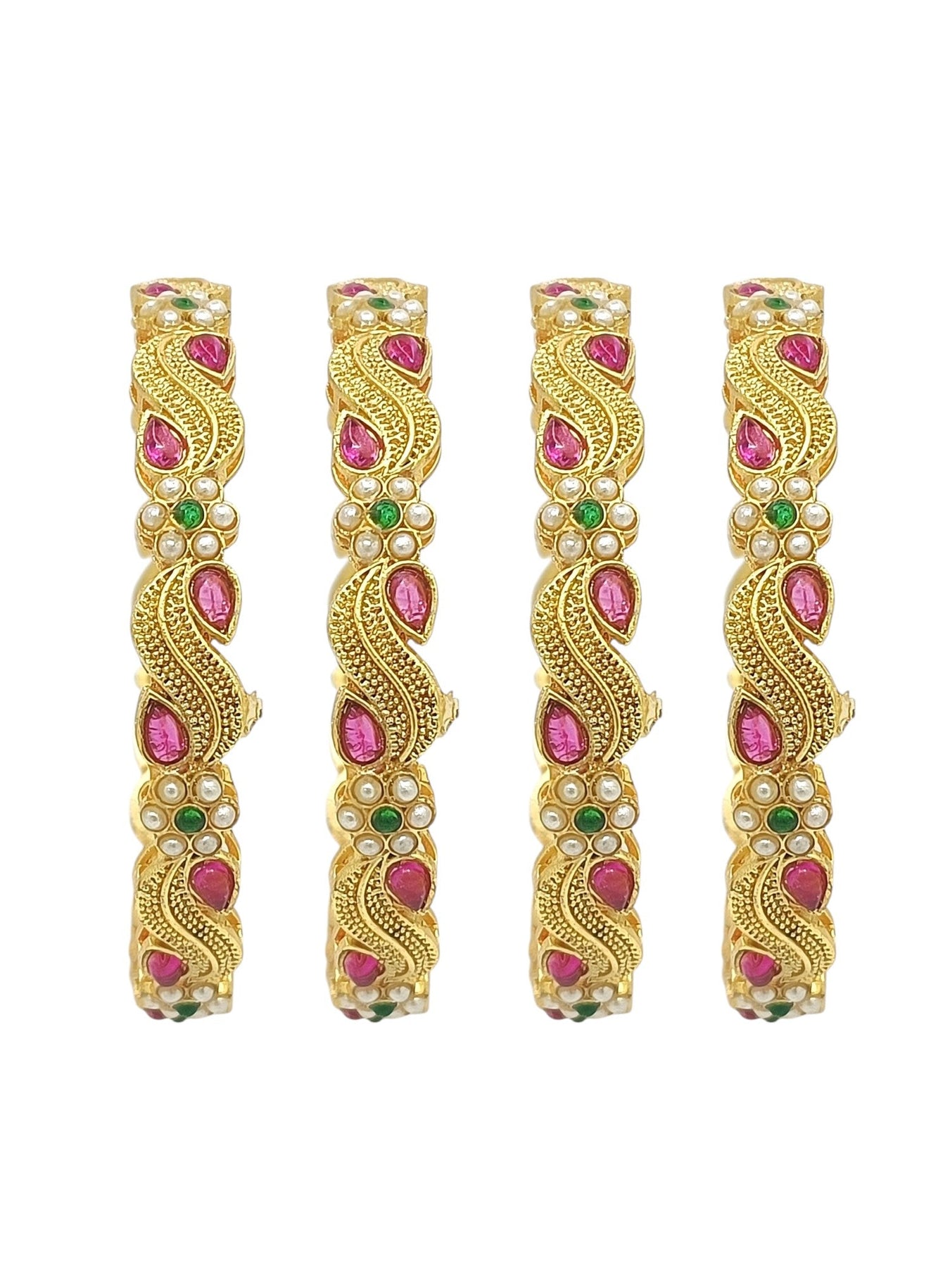 Set Of 4 Gold Plated Pink And White Stones Studded Paisely Bangles Set. Secured With Slip On Closure.