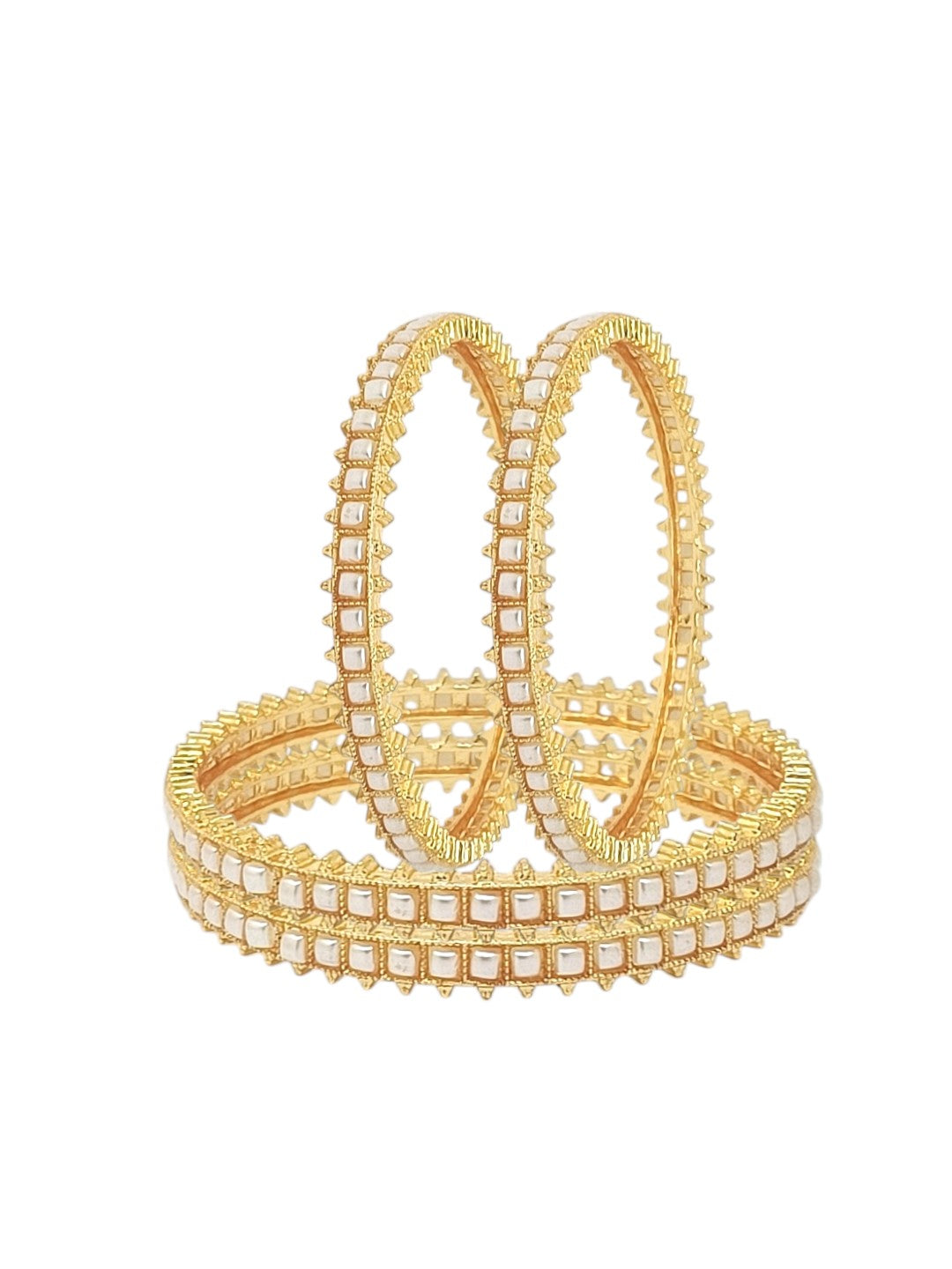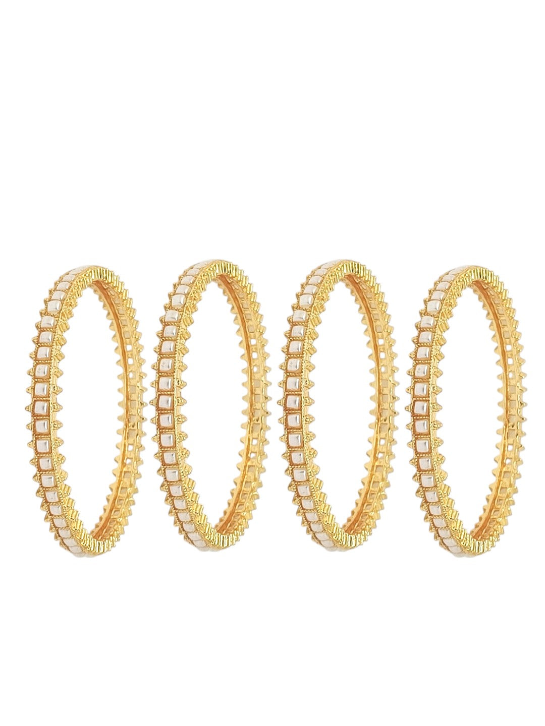 Set Of 4 Gold Toned White Beads Studded Bangles Set. Secured With Slip On Closure