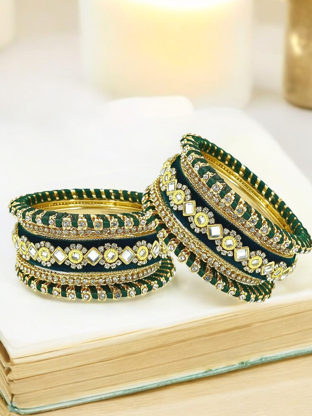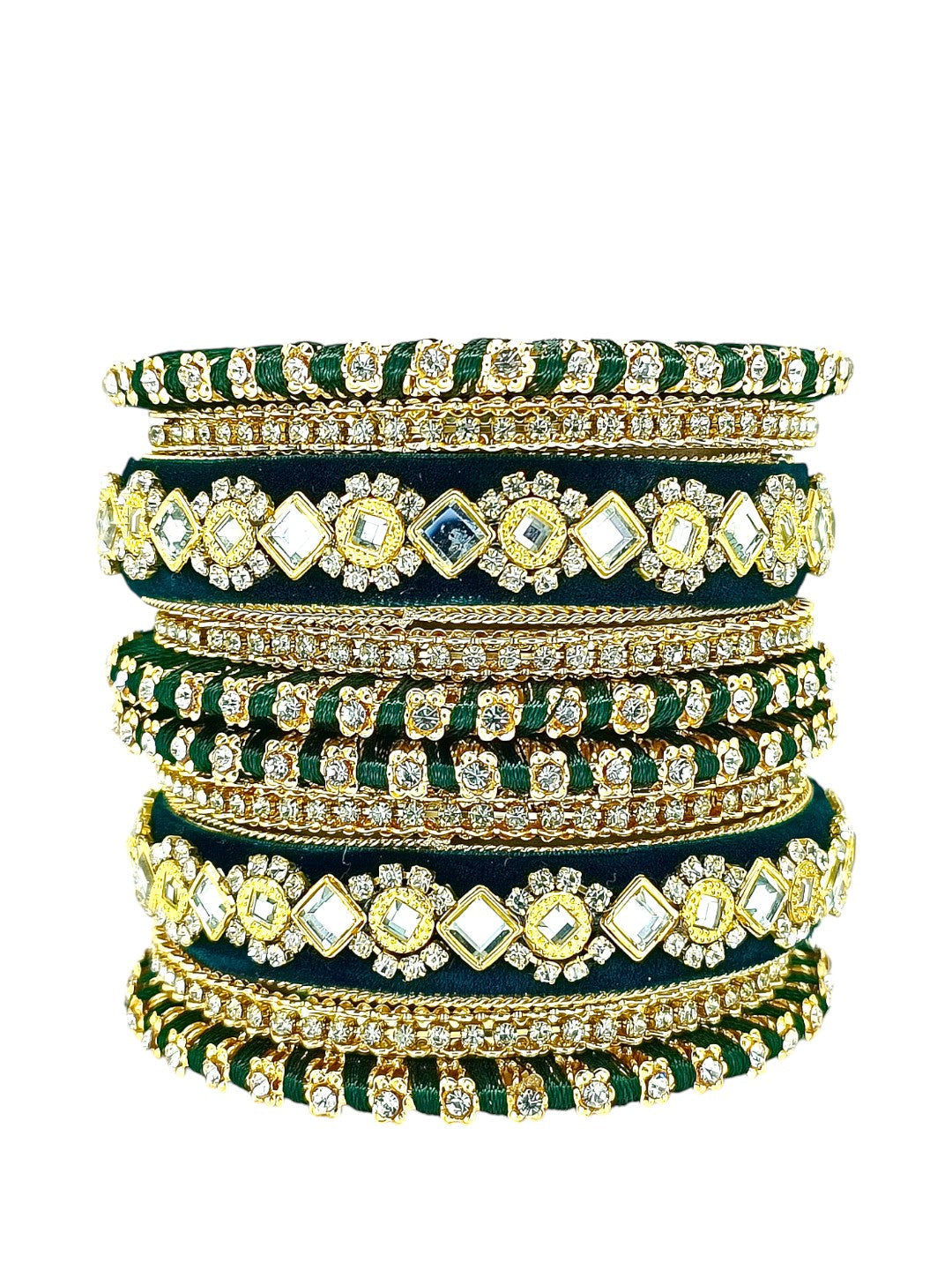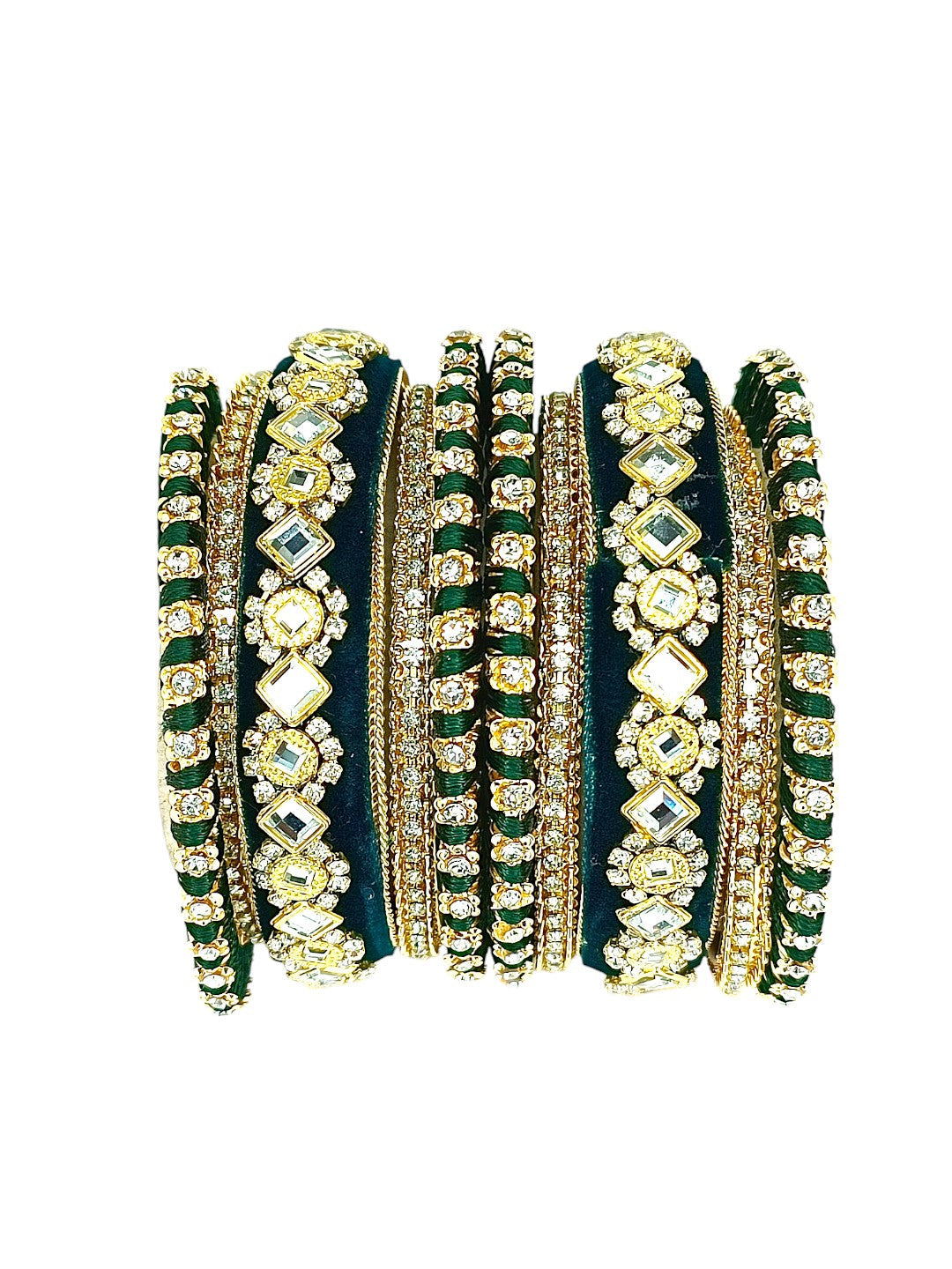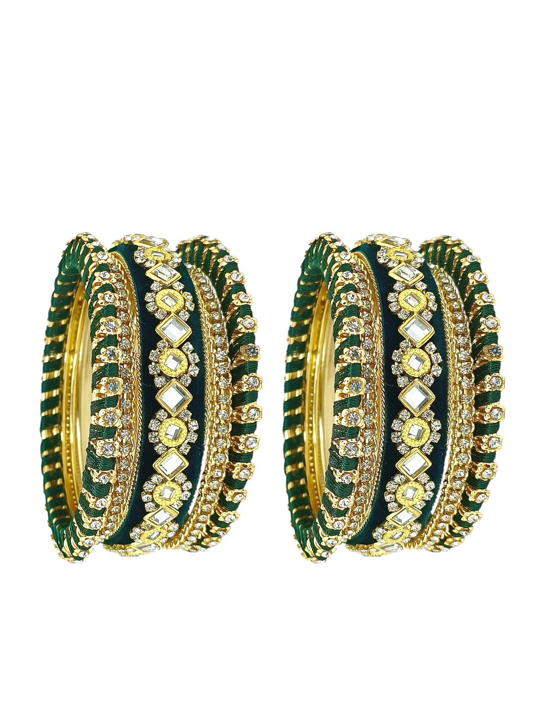 Gold Toned Green Velvet Silk Thread Chuda Set Studded With Cubic Zircon Stones. Secured With Slip On Closure