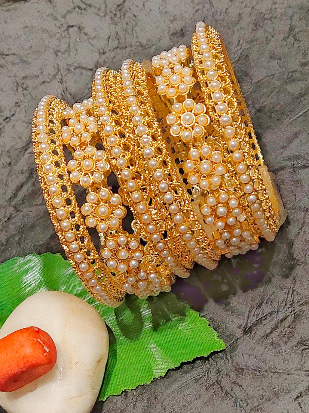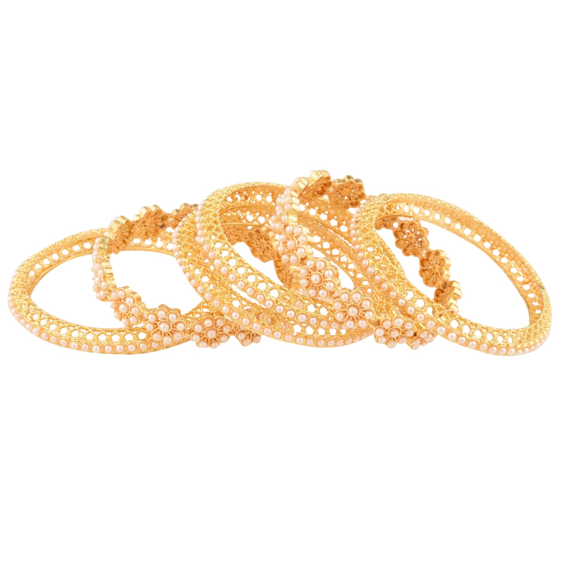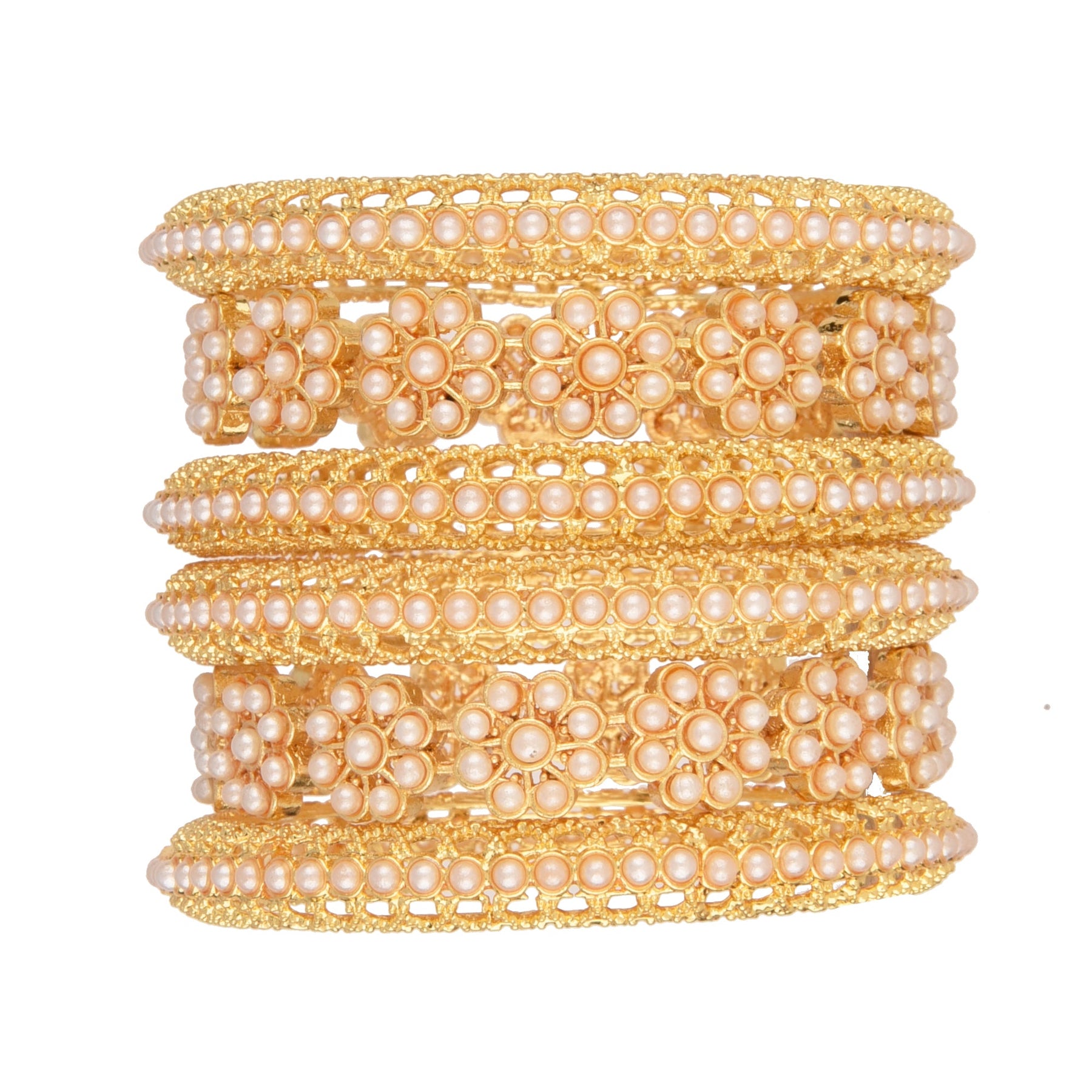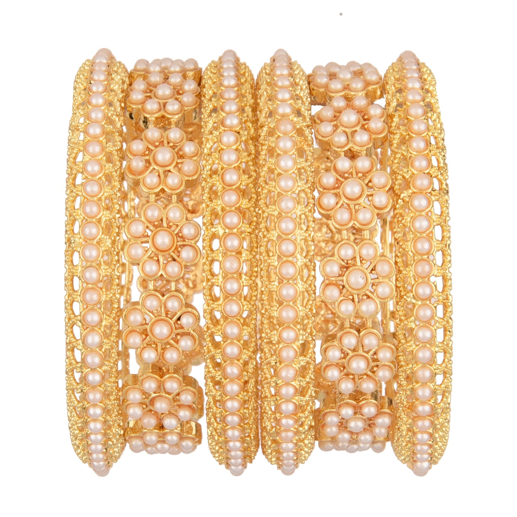 Immerse Yourself In The Enchanting Beauty Of Our Floral Gold Plated Pearl Bangles Set Of 6. This Captivating Collection Of Bangles Combines The Allure Of Gold Plating, The Timeless Elegance Of Pearls, And The Delicate Charm Of Floral Motifs .Whether Worn Individually For A Subtle And Refined Look Or Stacked Together For A More Dramatic Statement, These Bangles Effortlessly Elevate Your Style And Add A Touch Of Elegance To Any Outfit.