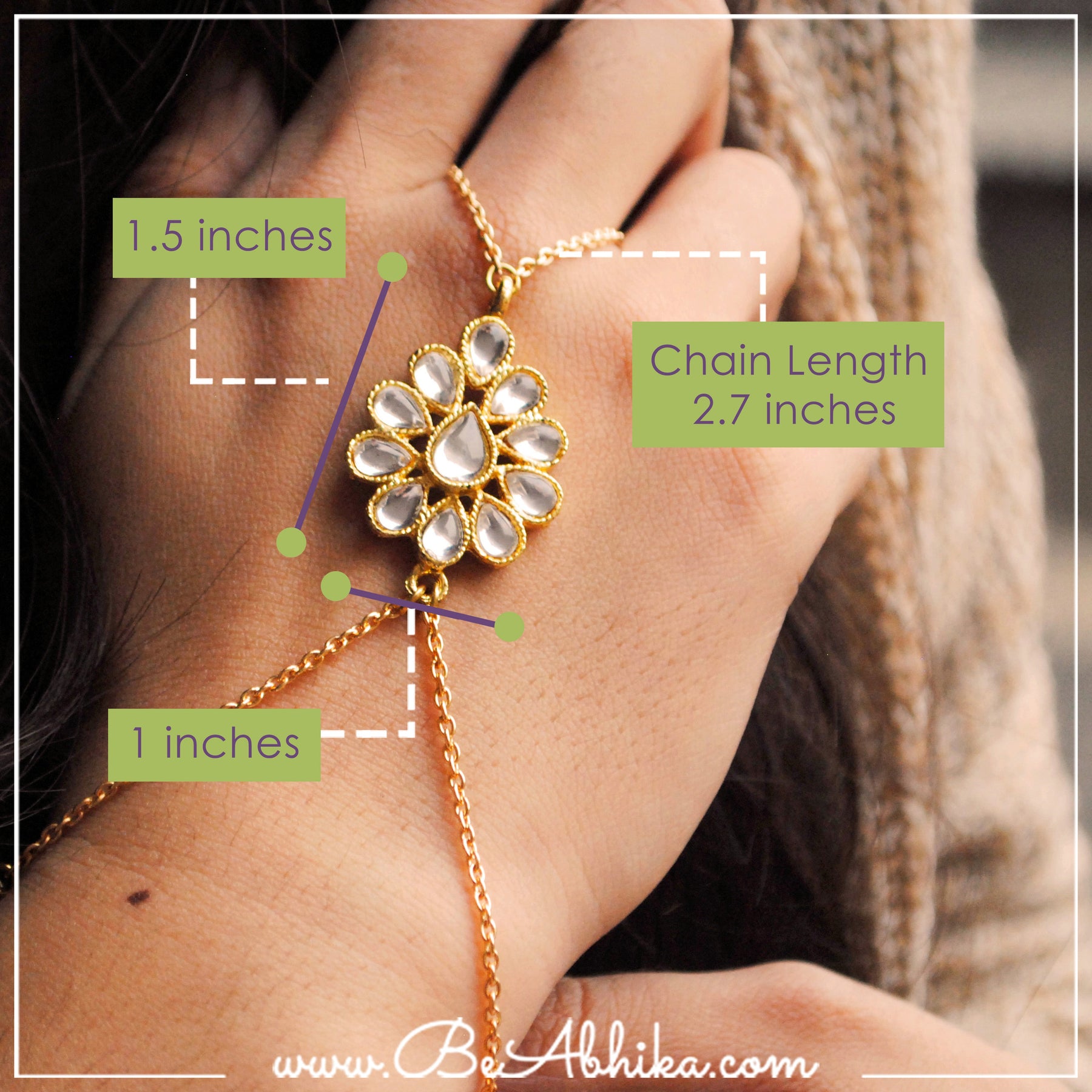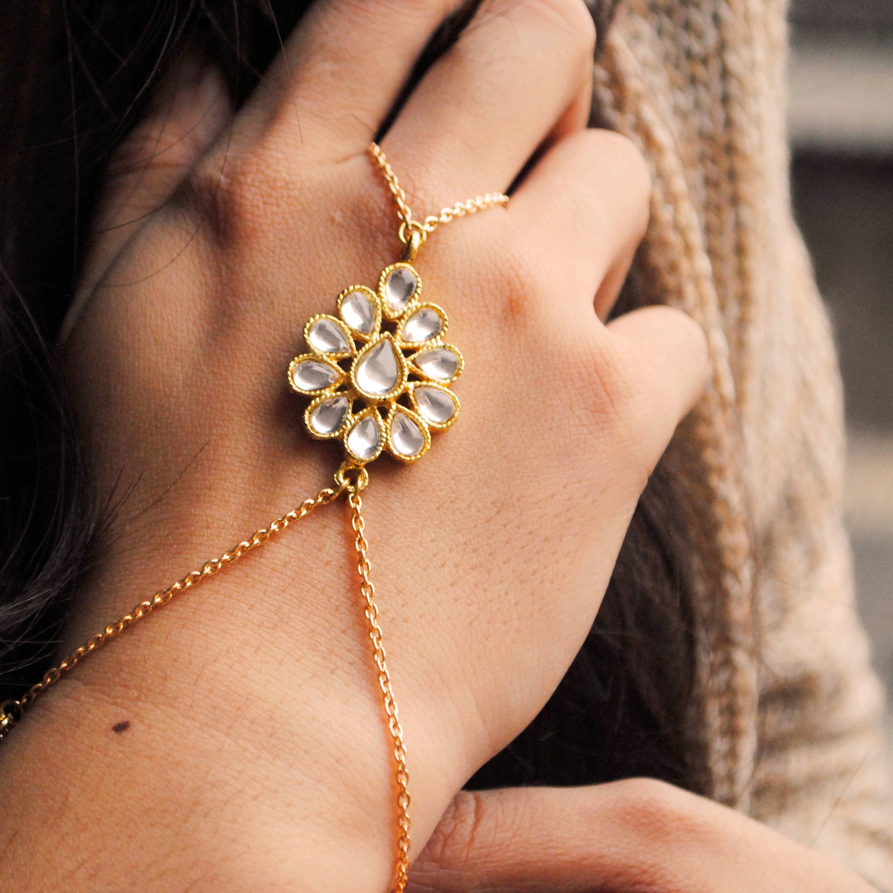 This Classic Kundan Slave Bracelet Will Never Go Out Of Style. A Drop Shaped Kundan Ornamented By Others In Floral Ensemble Acts As Connector For Both Ring And The Bracelet, Which Are Made Of Shiny Golden Metal Alloy Chains.