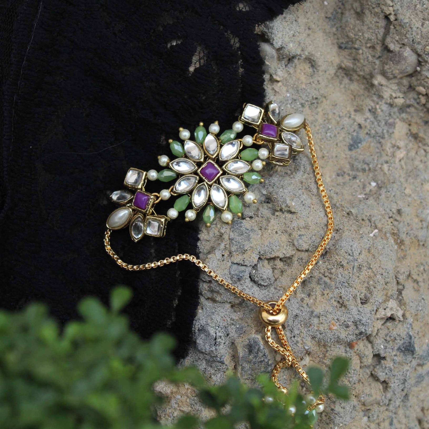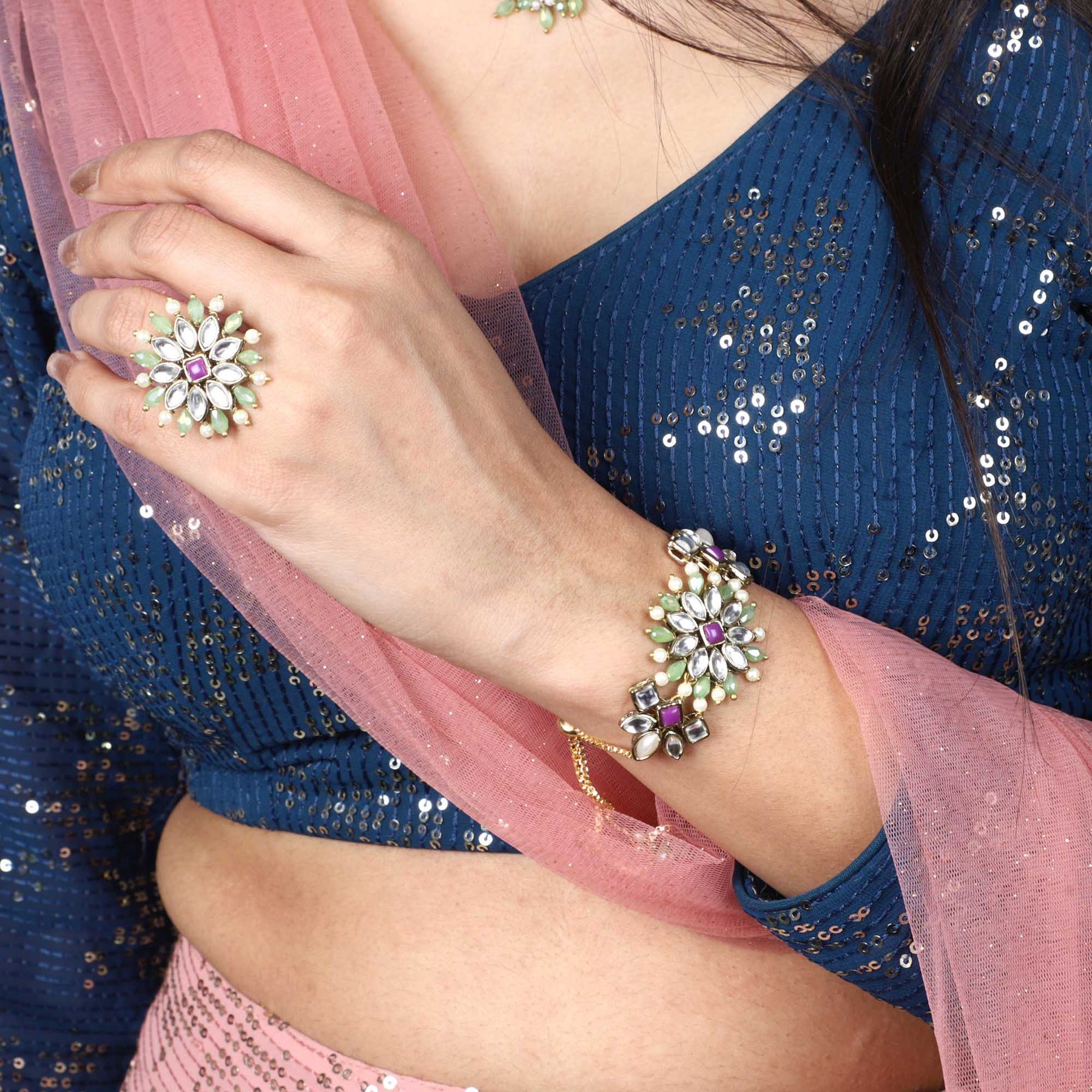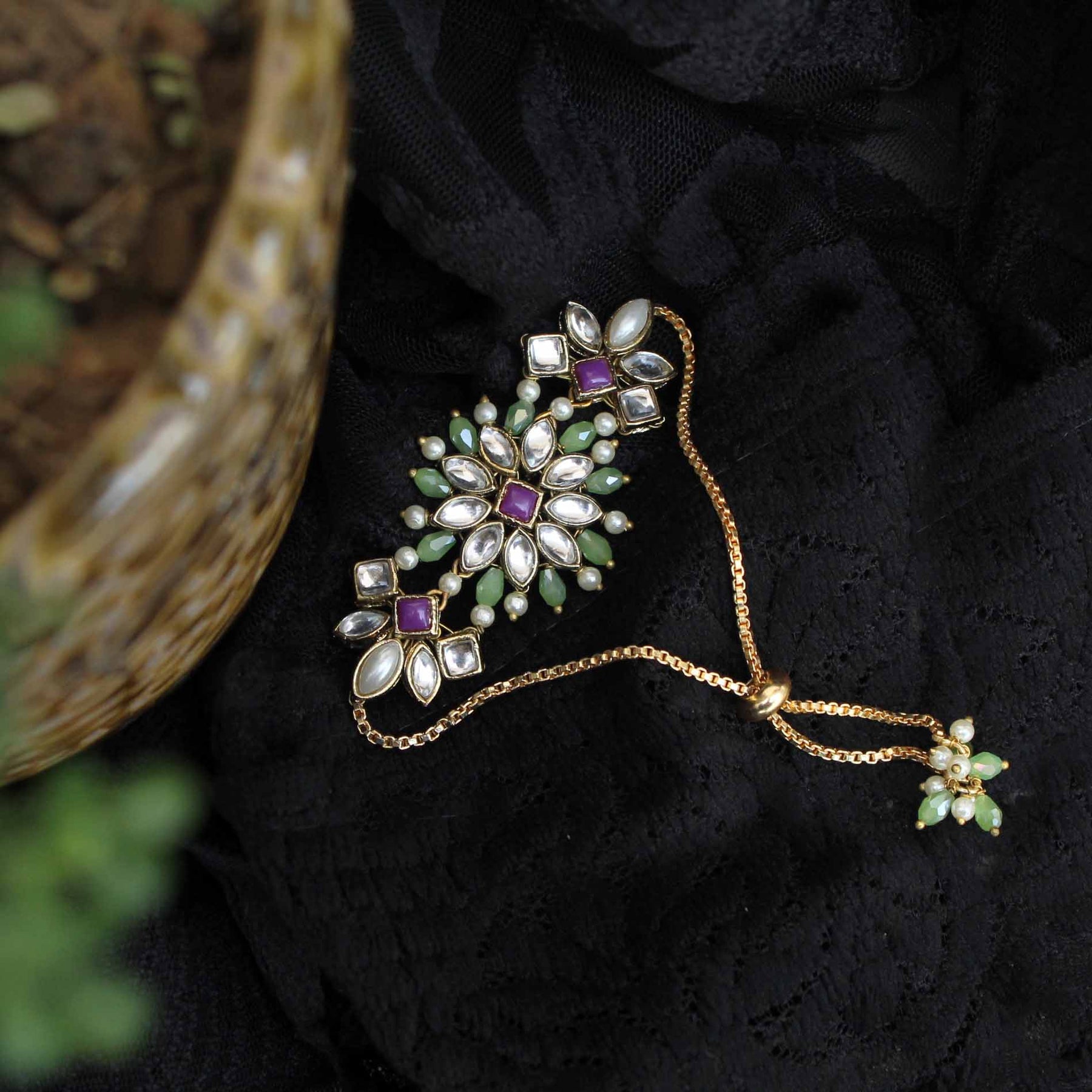 Add A Touch Of Elegance To Your Ethnic Or Modern Outfit With This Exquisite Handmade Beaded Green Beads And Kundan Bracelet. The Floral Design Studded With High-Quality Kundan Stones Gives It A Stylish And Elegant Look. Perfectly Adorned With Matching Attire, This Bracelet Is The Perfect Accessory To Add Brilliance And Spark To Your Entire Look. Suitable For Weddings, Parties, Gifting, And Other Indian Festivals, This Bracelet Is A Perfect Blend Of Traditional And Modern Design. Make A Statement With This Stunning Kundan And Beaded Bracelet.