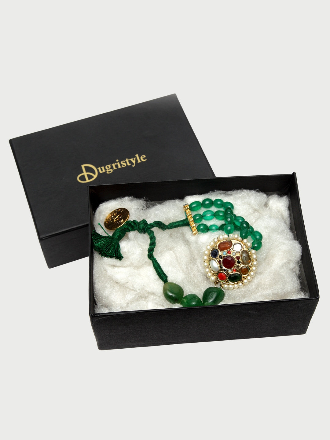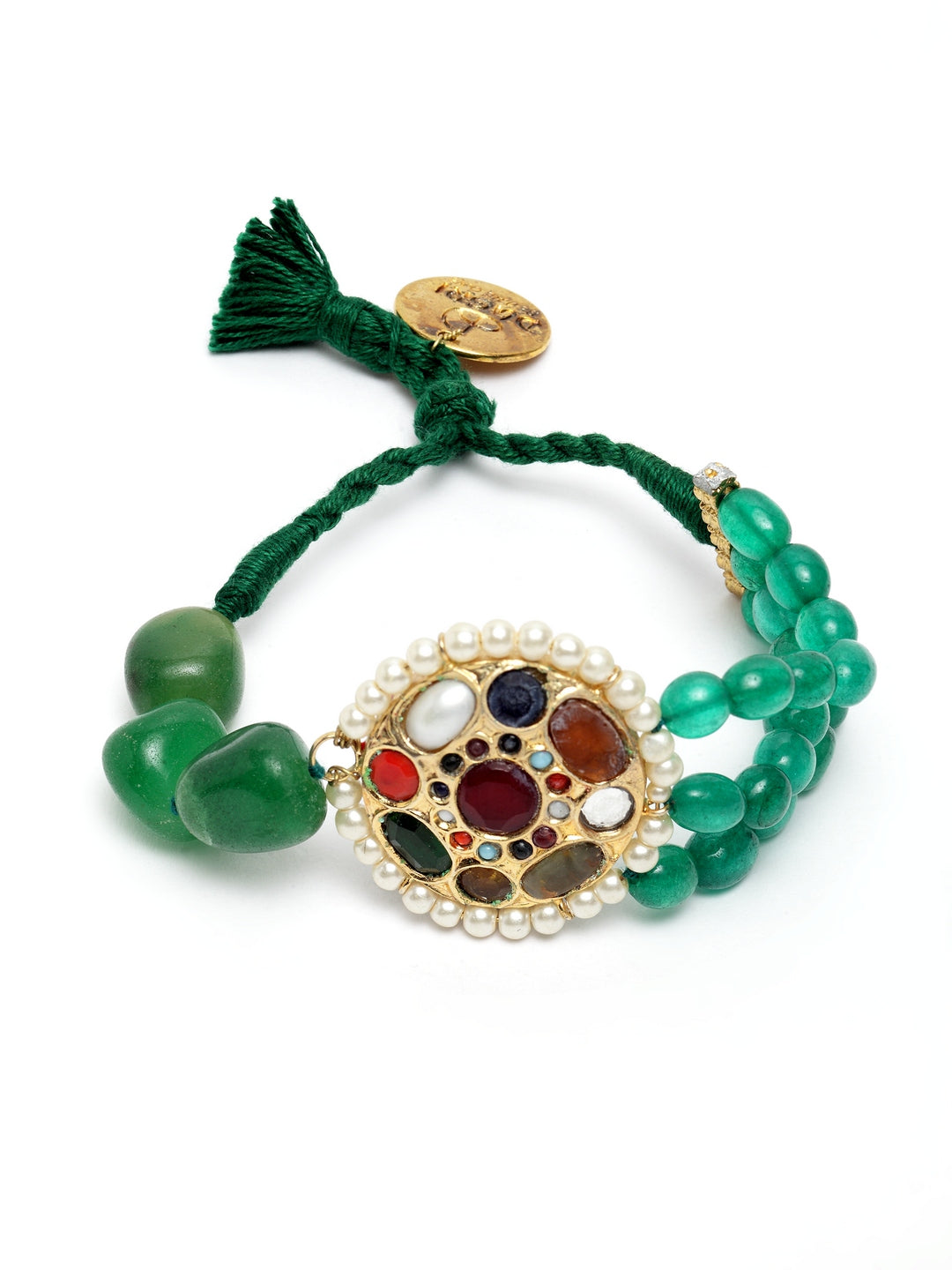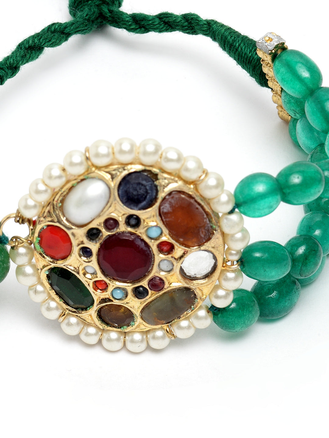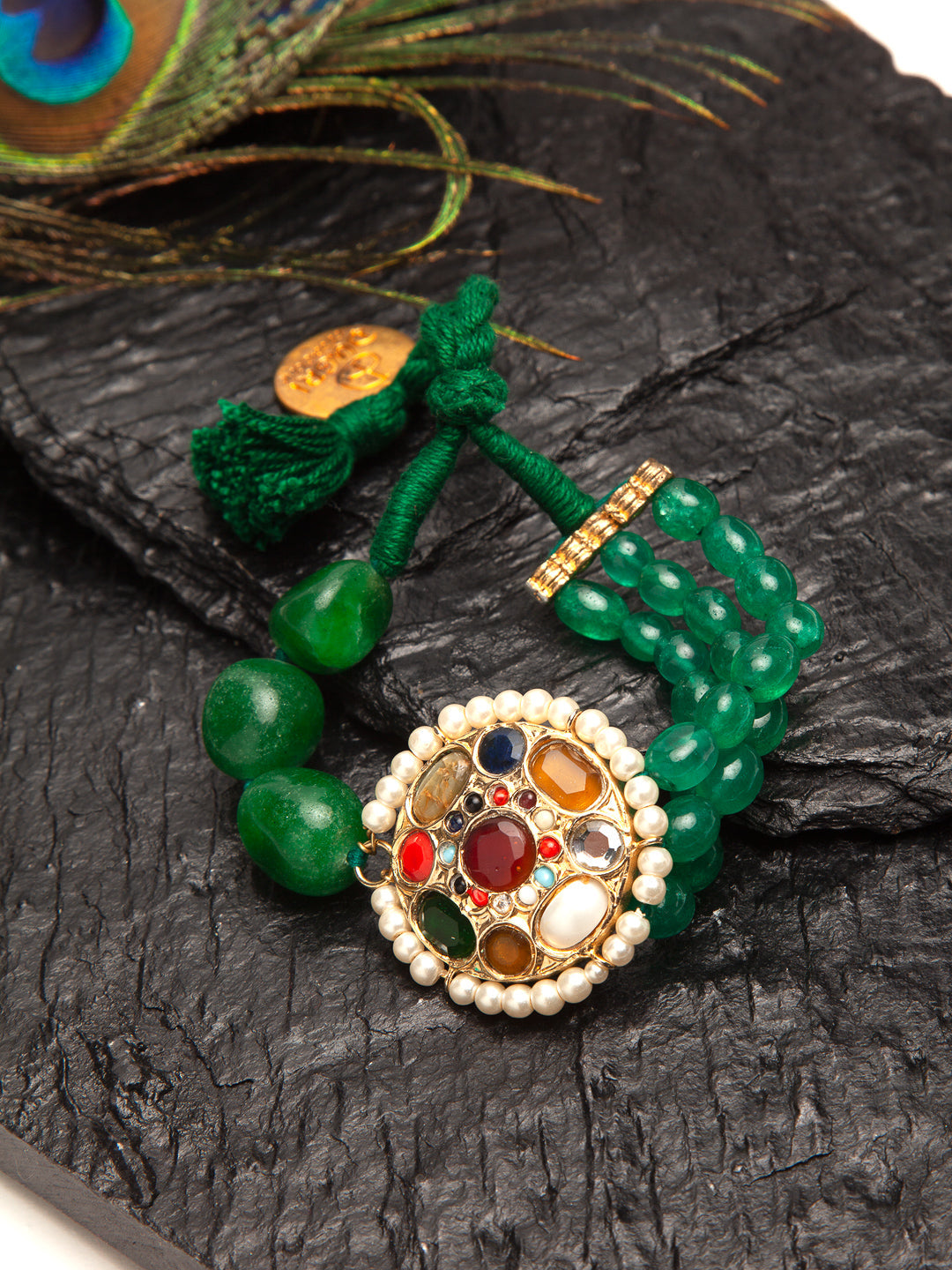 Green & None Bracelet With Faux Emerald & Pearls; Category Of Jewellery Is Hand Jewellery; Sub Category Is Bracelets; Ideal For Women; Base Color Is Green; Gemstones Used - Faux Emerald, Pearls; Plating Is Gold-Plated; Base Metal Is Alloy; Other Material Used - Lakh Center Piece, Handmade Thread Adjustable Closure; Size Is Freesize; Adjustable - Yes; Weight Is 65 Gms; Mesaurements - Width Of Bracelet = 4 Cm; Diameter Of Bracelet =6.03 Cm; Circumference Of Bracelet = 18.95 Cm; Content 1 Bracelet