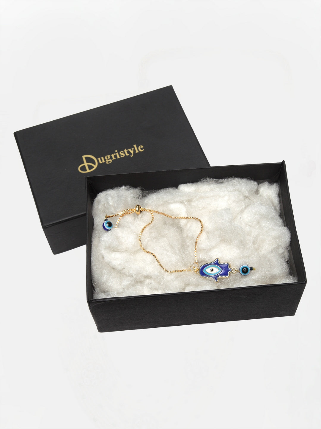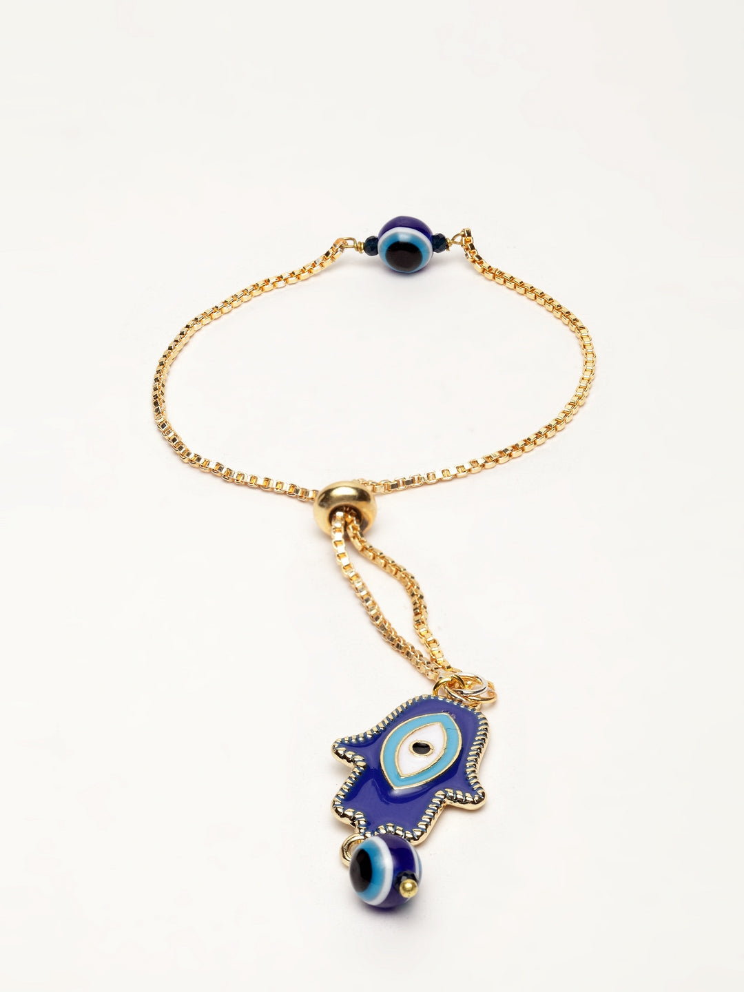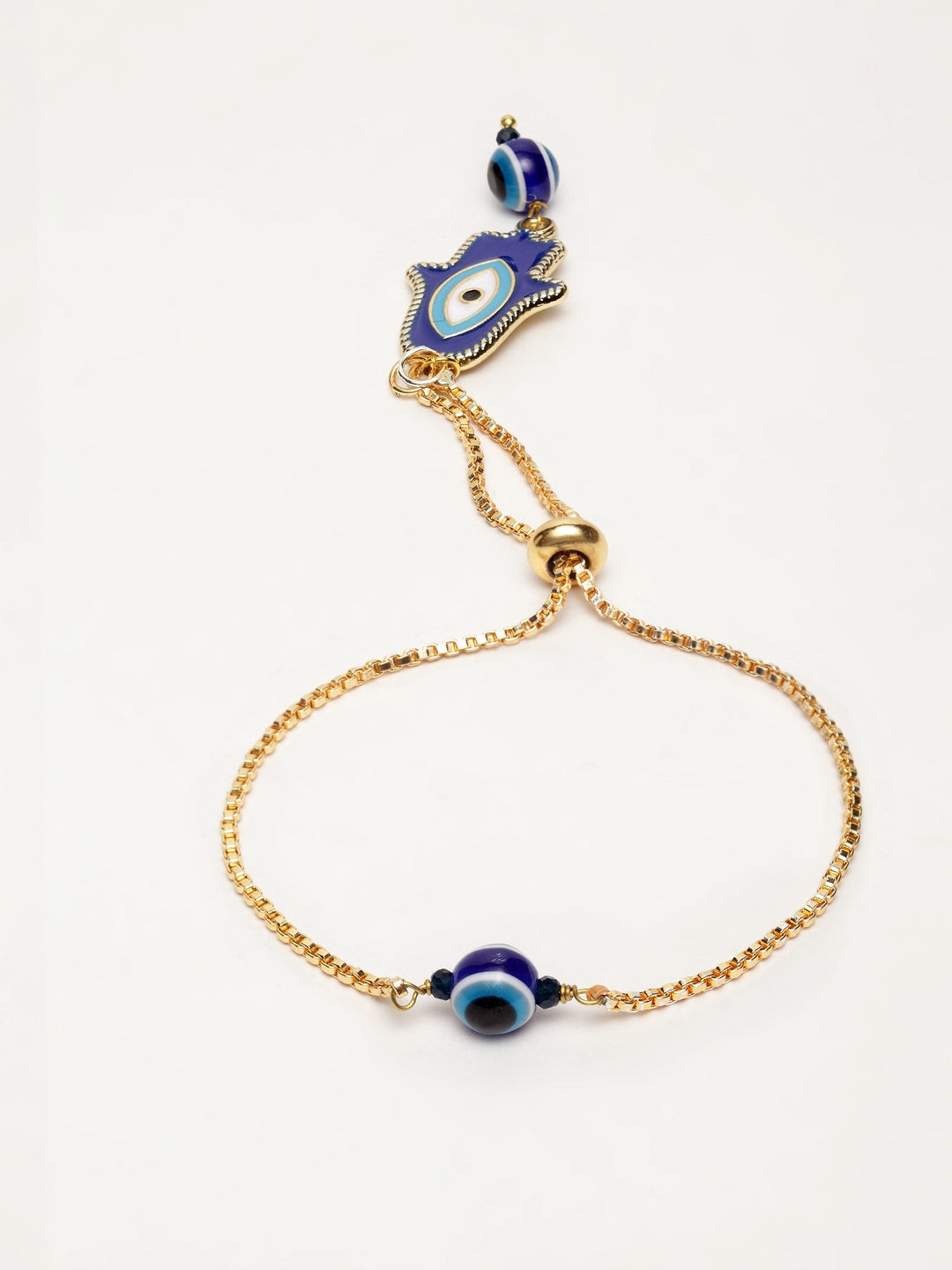 Blue & Bracelet With Natural Stones & Evil Eye; Category Of Jewellery Is Hand Jewellery; Sub Category Is Bracelets; Ideal For Women; Base Color Is Blue; Gemstones Used - Natural Stones, Evil Eye; Plating Is Gold-Plated; Base Metal Is Alloy; Other Material Used - ; Size Is Freesize; Adjustable - Yes; Weight Is 11 Gms; Mesaurements - Width Of Bracelet = 4 Cm; Diameter Of Bracelet =6.03 Cm; Circumference Of Bracelet = 18.95 Cm; Content