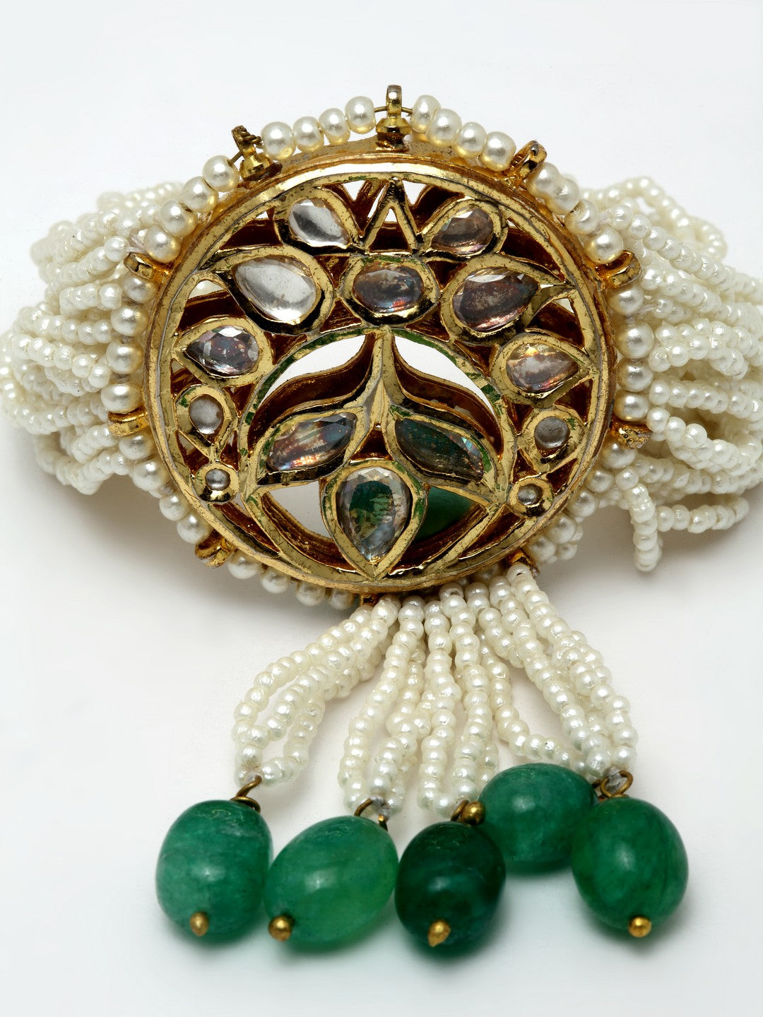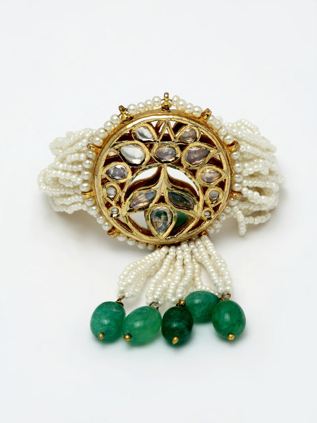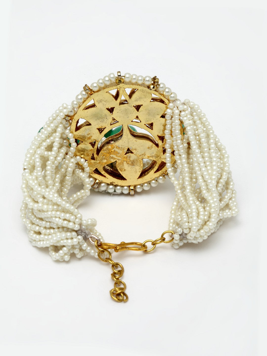 Gold & Pearl Beacelet Bracelet With Kundan & Pearls; Category Of Jewellery Is Hand Jewellery; Sub Category Is Bracelets; Ideal For Women; Base Color Is Gold; Gemstones Used - Kundan, Pearls, Faux Emerald; Plating Is Gold-Plated; Base Metal Is Alloy; Other Material Used - S Hook Clasp; Size Is Freesize; Adjustable - Yes; Weight Is 50 Gms; Mesaurements - Width Of Bracelet = 4 Cm; Diameter Of Bracelet =6.03 Cm; Circumference Of Bracelet = 18.95 Cm; Content 1 Bracelet