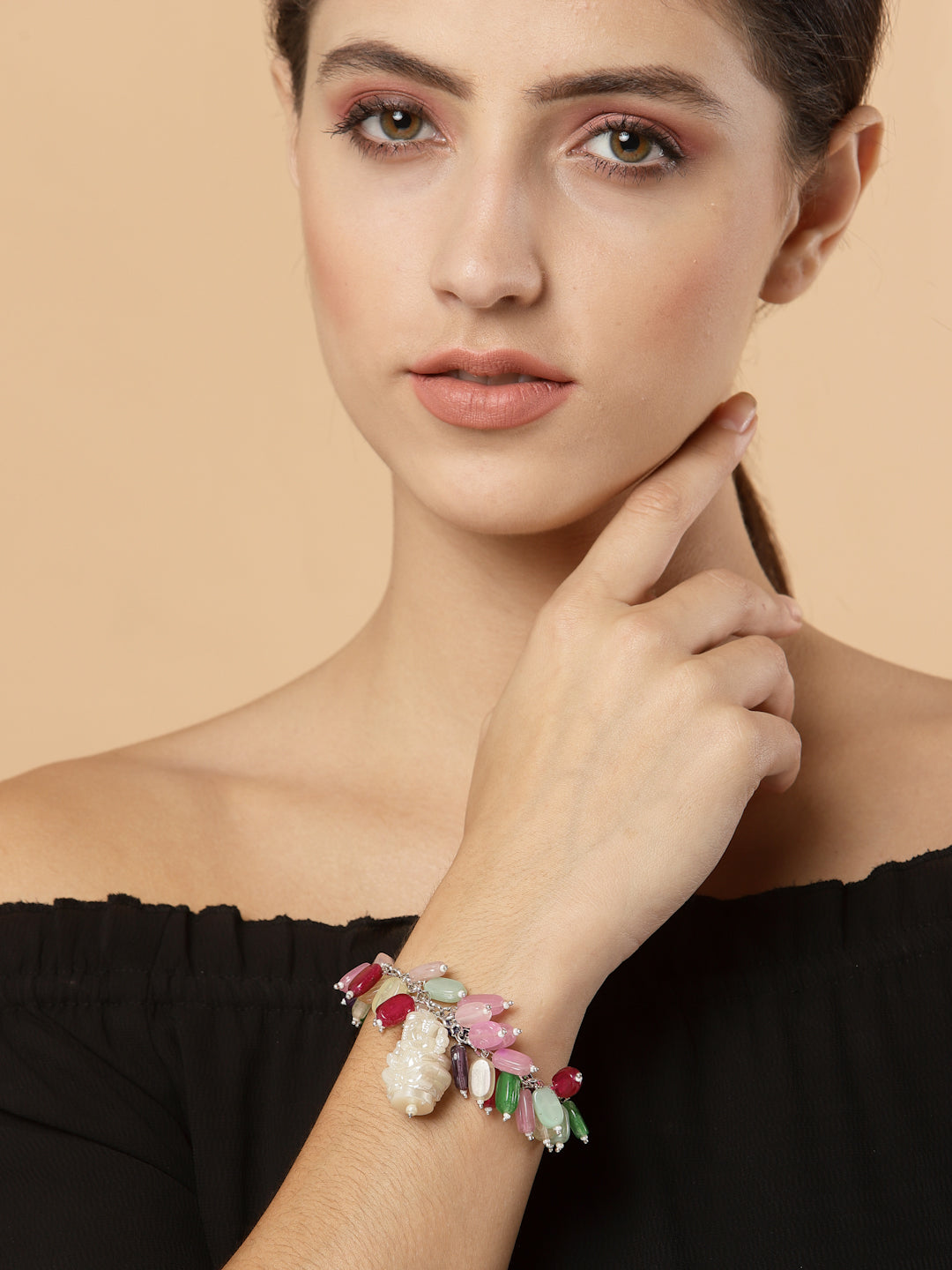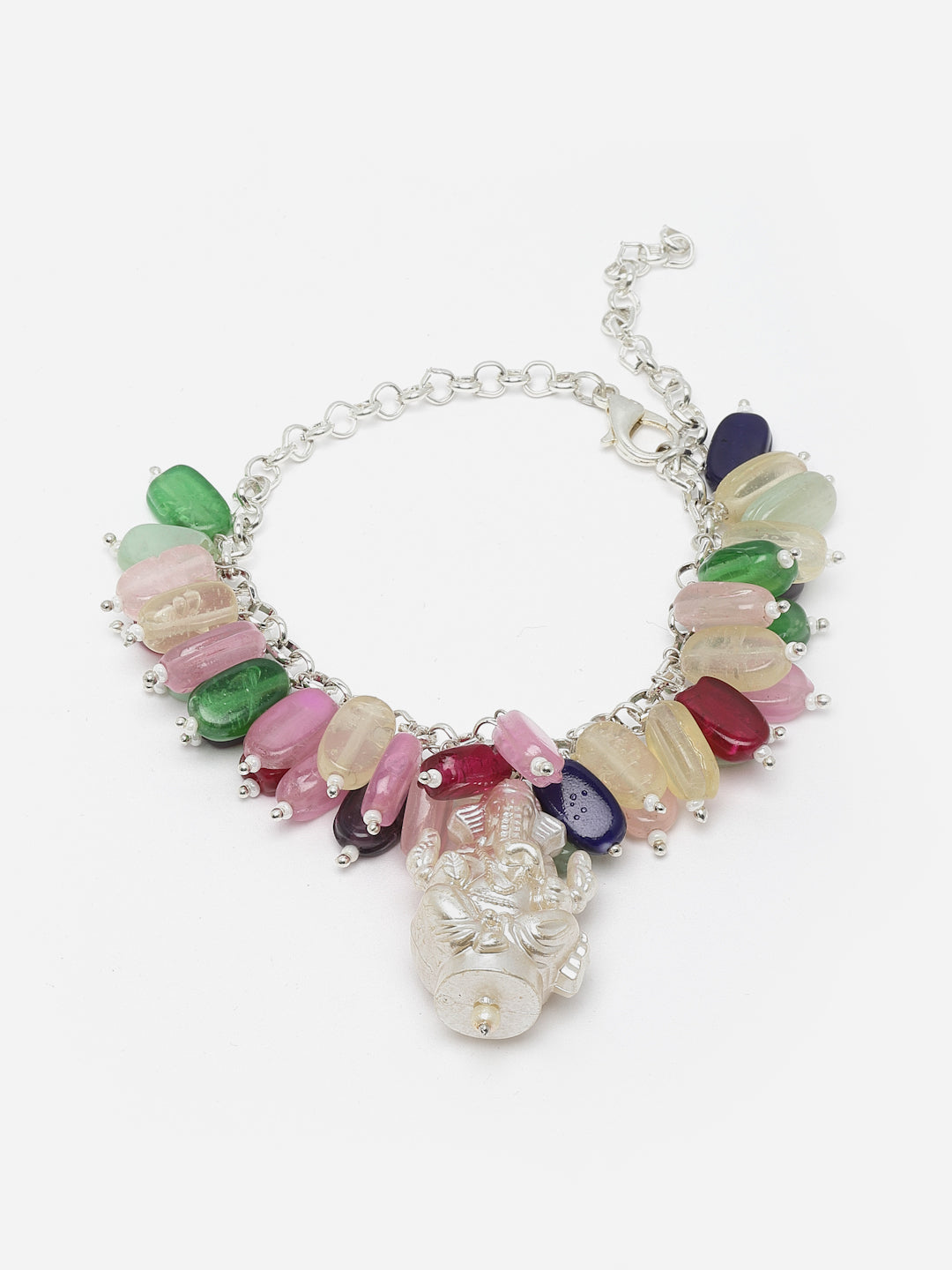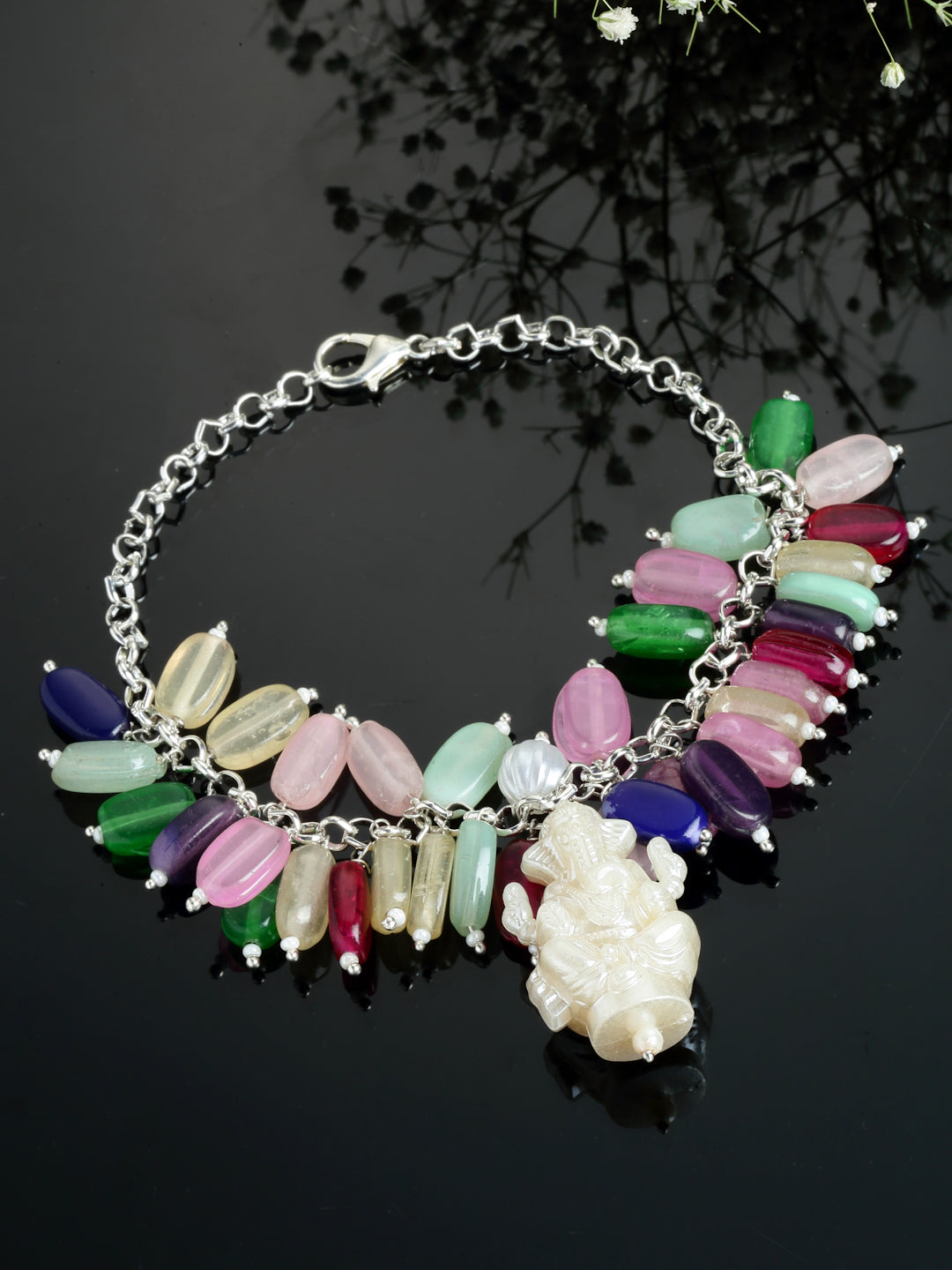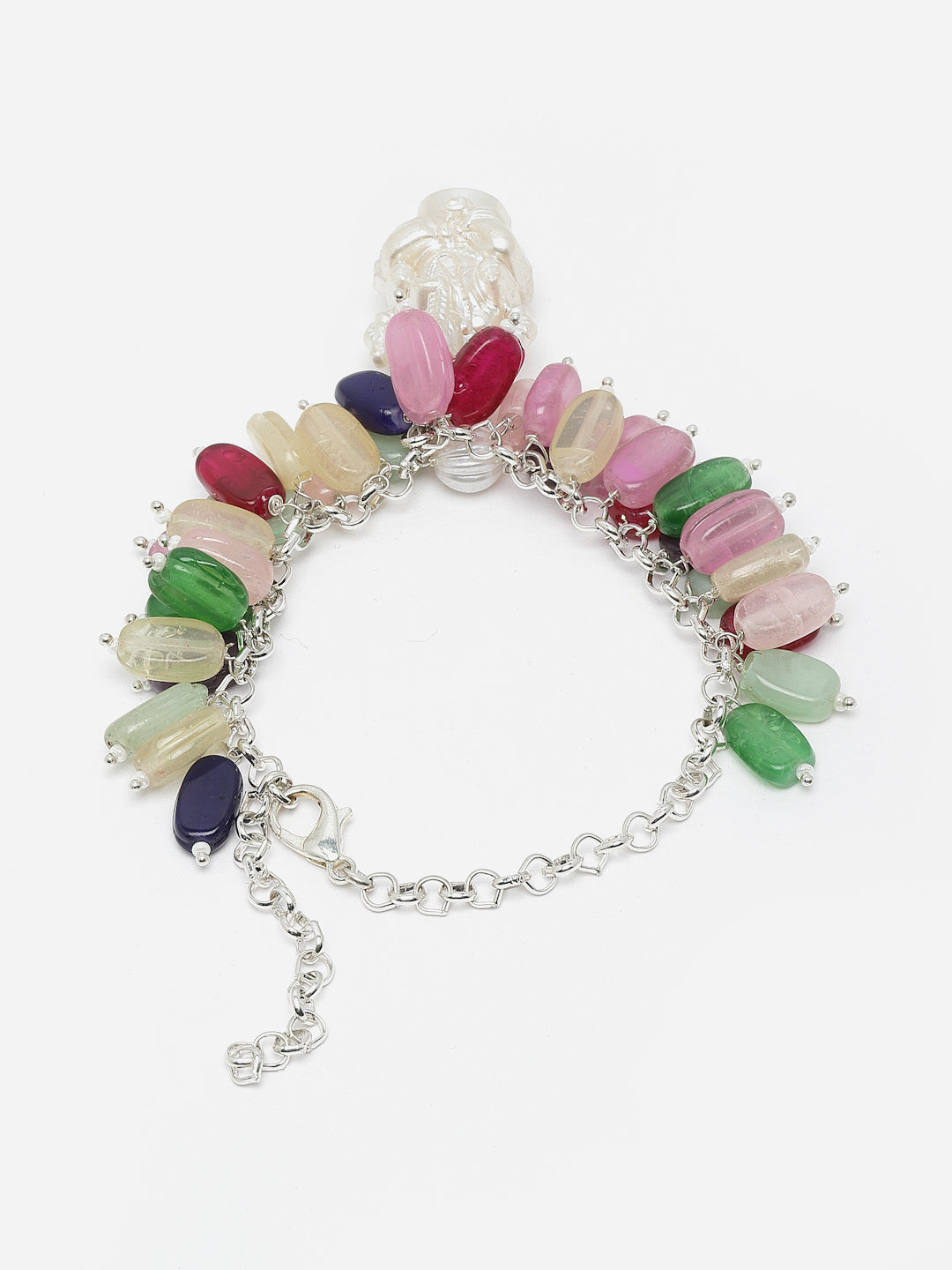 Bright Colors Looped In Silver Chain With Molded Ganpathi To Flaunt The Boho Look Of Yours Style It With Western Or Any Color Of Style To Give Out Best Version Of Urself.; Category Of Jewellery Is Hand Jewellery; Sub Category Is Bracelets; Ideal For Women; Color Is Pink, Green, Red, Silver; Gemstones Used - Pearls, Natural Stones, Faux Ruby; Plating Is Silver-Plated; Base Metal Is Alloy; Other Material Used - Adjustable Chain; Size Is Freesize; Adjustable - Yes; Weight Is 36 Gms; Mesaurements - Length Of Bracelet =24 Cm; Width Of Bracelet = 4.5 Cm; Diameter Of Bracelet =6.03 Cm; Circumference Of Bracelet = 18.95 Cm; Adjustable - Yes; Content 1 Bracelet
