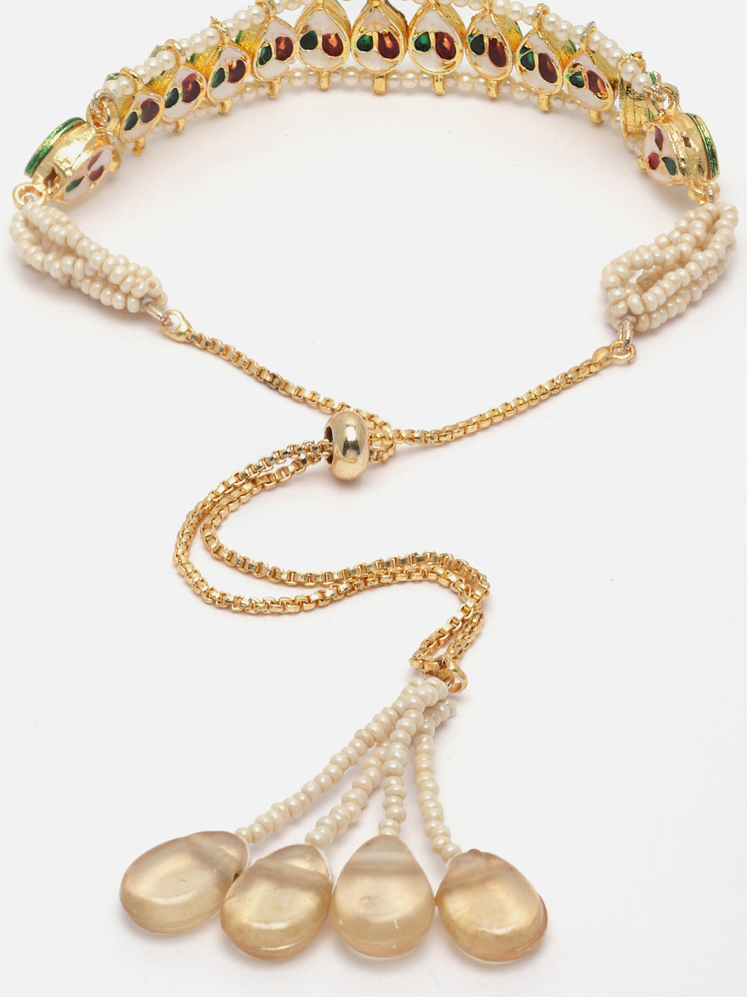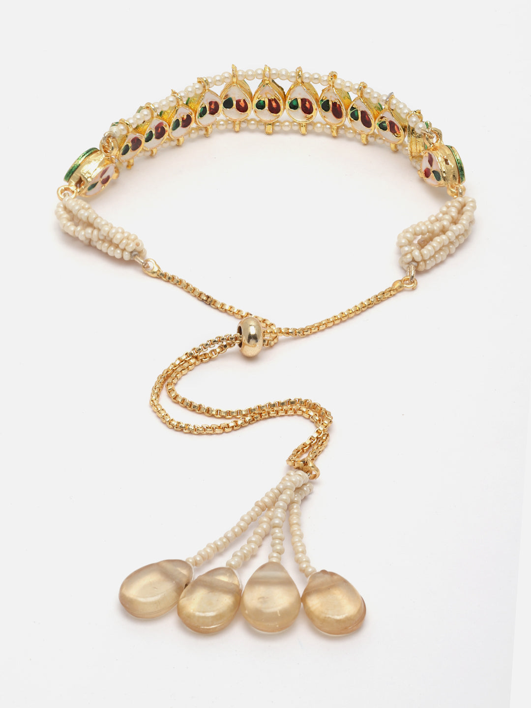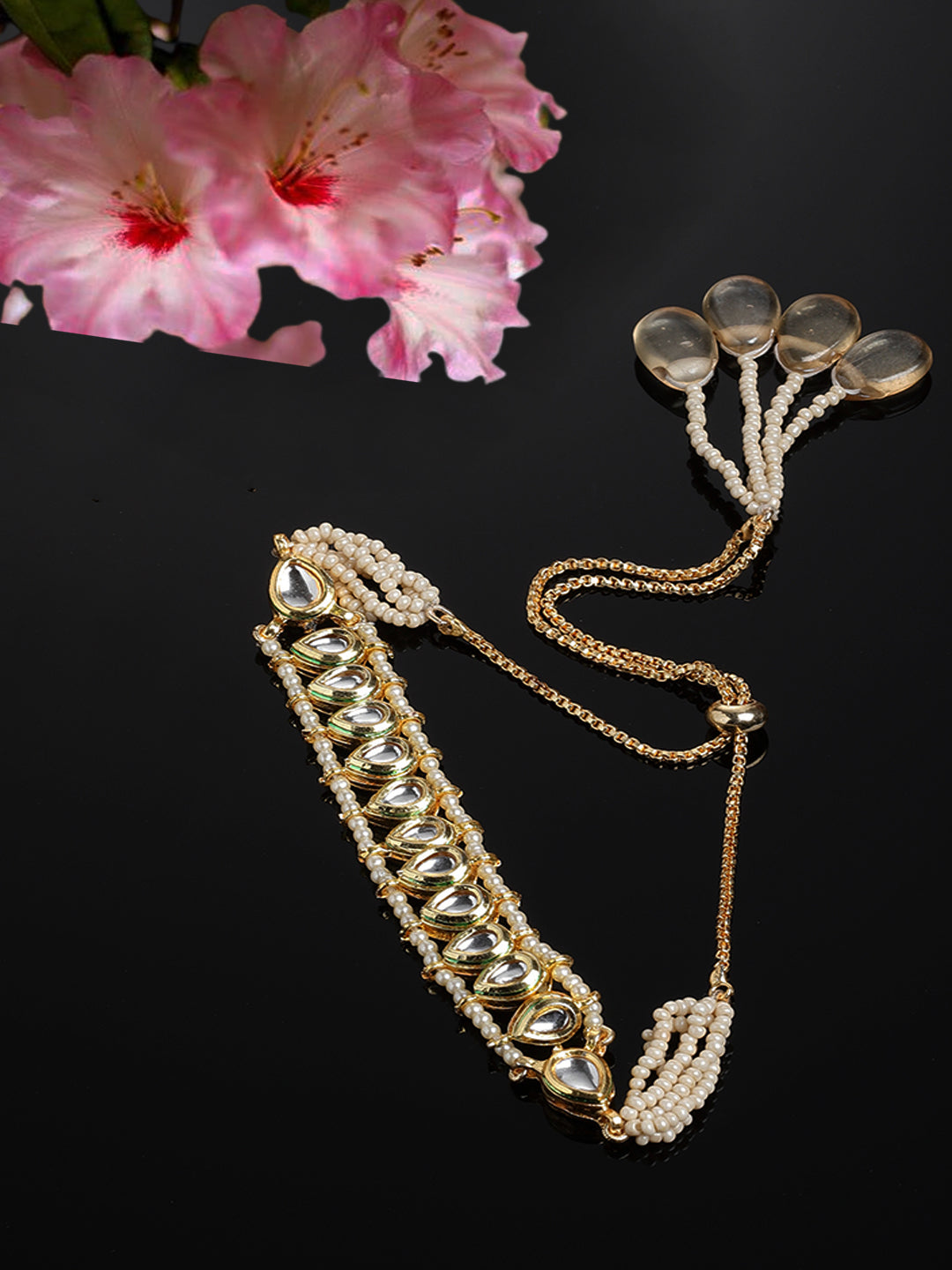 Kundan Bracelet; Category Of Jewellery Is Hand Jewellery; Sub Category Is Bracelets; Ideal For Women; Color Is Gold, White, Yellow, Green; Gemstones Used - Kundan, Pearls, Natural Stones; Plating Is Gold-Plated; Base Metal Is Alloy; Other Material Used - Adjustable Chain; Size Is Freesize; Adjustable - Yes; Weight Is 26 Gms; Mesaurements - Width Of Bracelet = 2 Cm; Diameter Of Bracelet =6.03 Cm; Circumference Of Bracelet = 18.95 Cm; Adjustable - Yes; Content 1 Bracelet