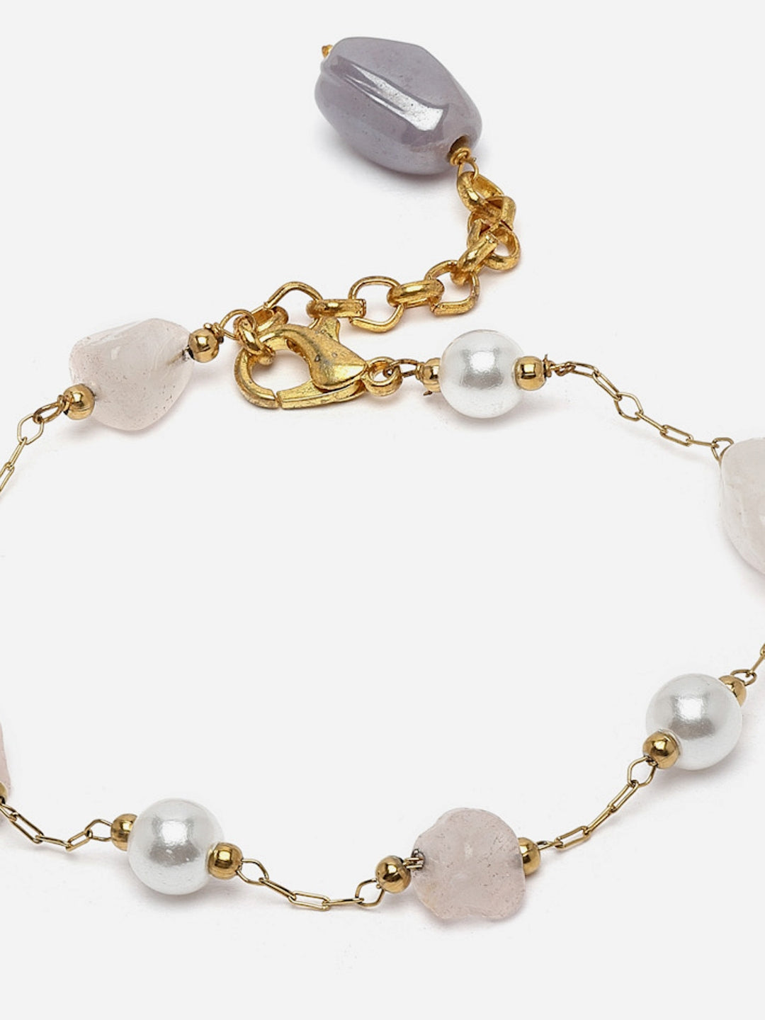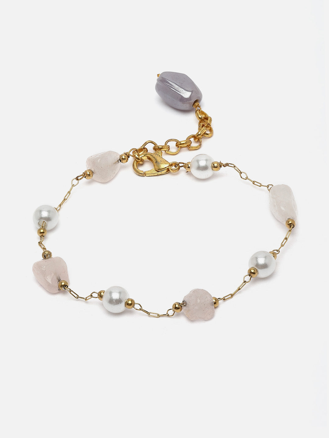 Pearl And Rose Quartz Real Stone Bracelet; Category Of Jewellery Is Hand Jewellery; Sub Category Is Bracelets; Ideal For Women; Color Is Pink, Grey, Gold, White, Cream; Gemstones Used - Pearls, Natural Stones ; Plating Is Gold-Plated; Base Metal Is Alloy; Other Material Used - Adjustable Chain; Size Is Freesize; Adjustable - Yes ; Weight Is 9 Gms; Mesaurements - Length Of Bracelet =23 Cm; Width Of Bracelet = 1 Cm; Diameter Of Bracelet =6.03 Cm; Circumference Of Bracelet = 18.95 Cm; Adjustable - Yes ; Content 1 Bracelet
