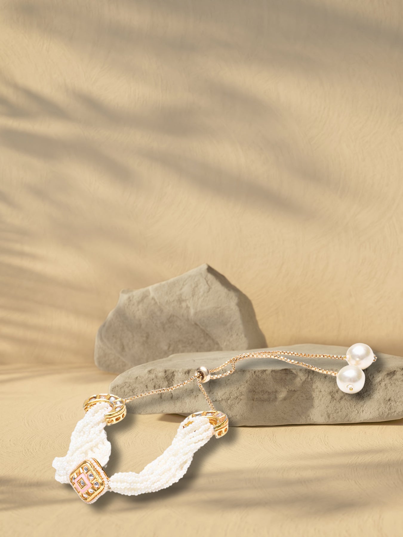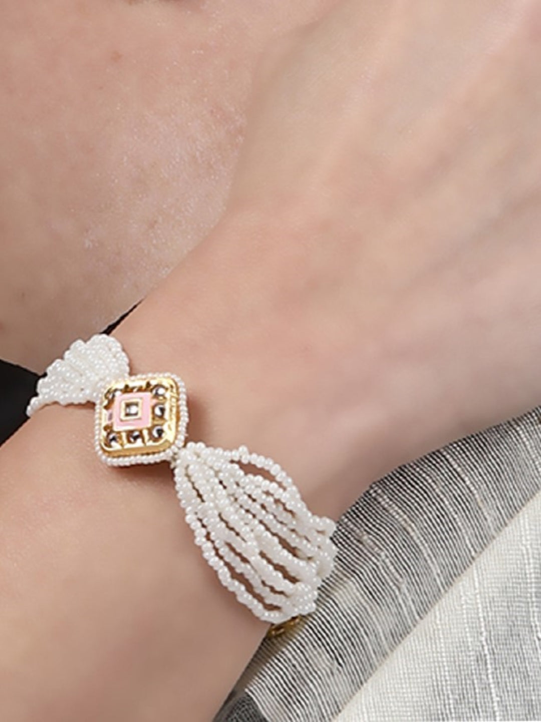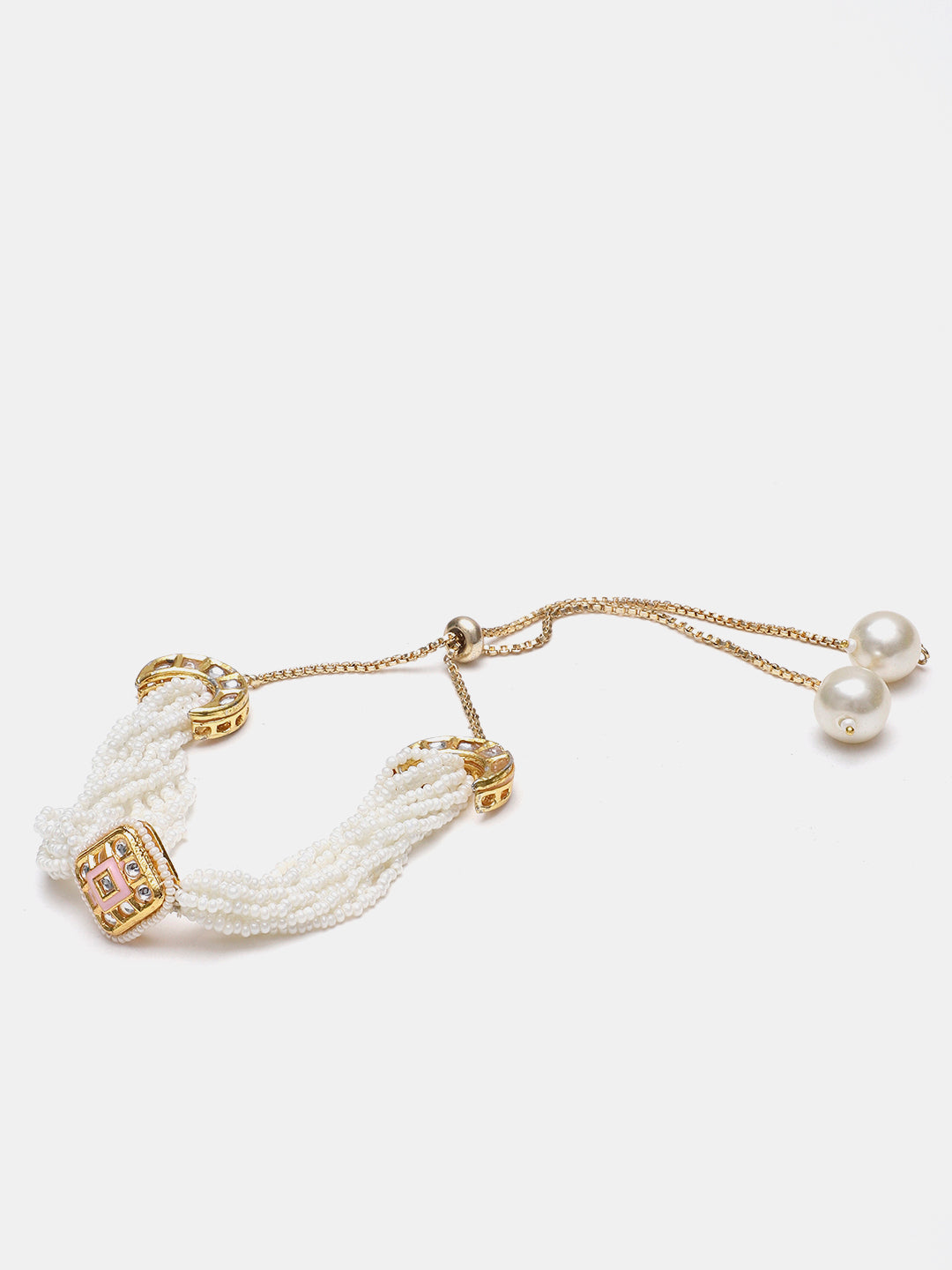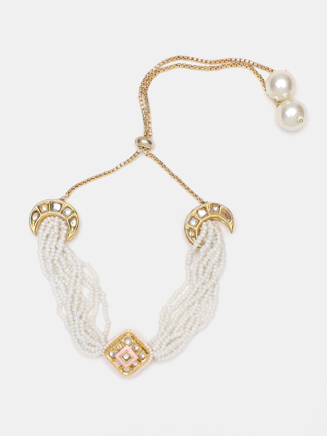 The "Chand Pearl Kundan Bracelet" Is The Perfect Combination Of Ancient And Eternal Kundan With The Milky Glow Of Pearls. This Bracelet With A Crescent (Chand) Symbol, Presented With Fine Details Is A Part Of An Important Complete Set Which Gives A Modest And Graceful Look Towards Any Ensemble. This Product Is The Key To Making Your Special Day A Success. Quick, Gentle Hand Embroidery; Category Of Jewellery Is Hand Jewellery; Sub Category Is Bracelets; Ideal For Women; Color Is Pink, Cream, Gold, White; Gemstones Used - Kundan, Pearls, Natural Stones; Plating Is Gold-Plated; Base Metal Is Alloy; Other Material Used - Adjustable Chain; Size Is Freesize; Adjustable - Yes; Weight Is 25 Gms; Mesaurements - Length Of Bracelet =23 Cm; Width Of Bracelet = 2.7 Cm; Diameter Of Bracelet =6.03 Cm; Circumference Of Bracelet = 18.95 Cm; Adjustable - Yes; Content 1 Bracelet