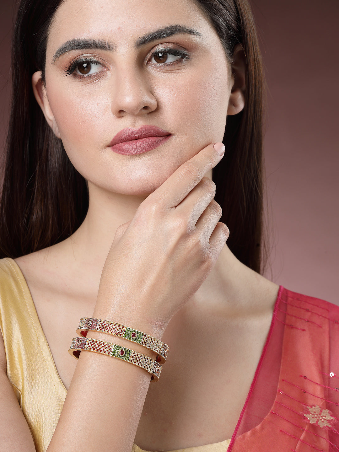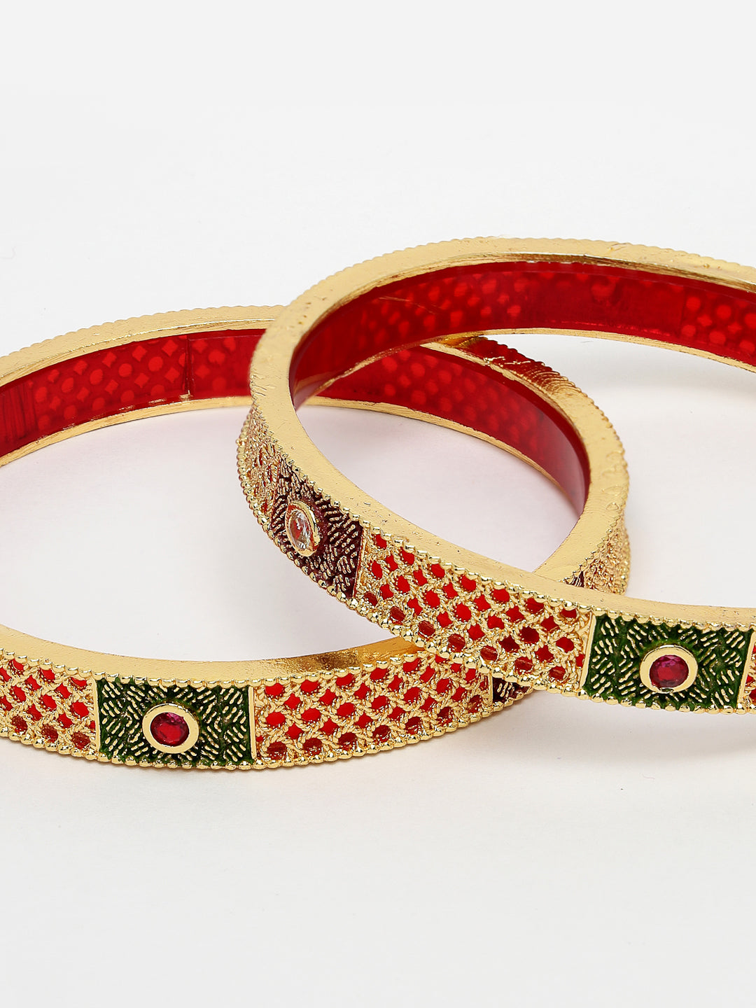 Style Note: Elevate your traditional ensemble with the exquisite NVR Women Set of 2 Gold-Plated Red Kundan Traditional Bangles. Perfect for adding a touch of elegance and sophistication to any festive occasion.