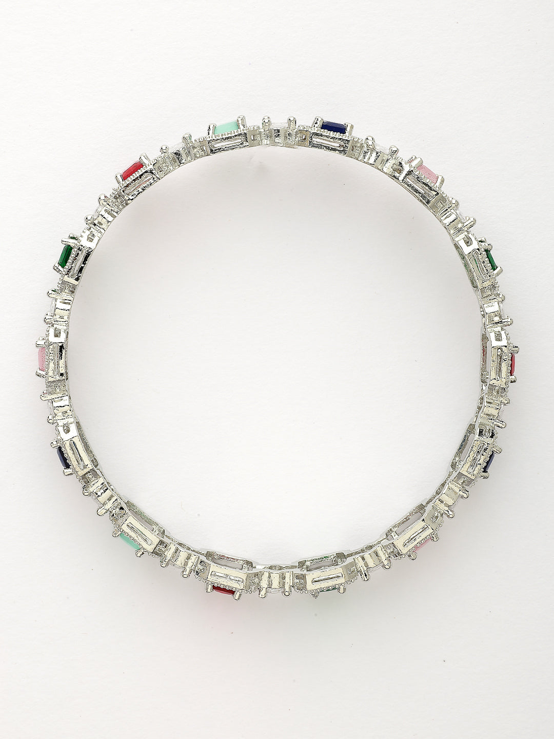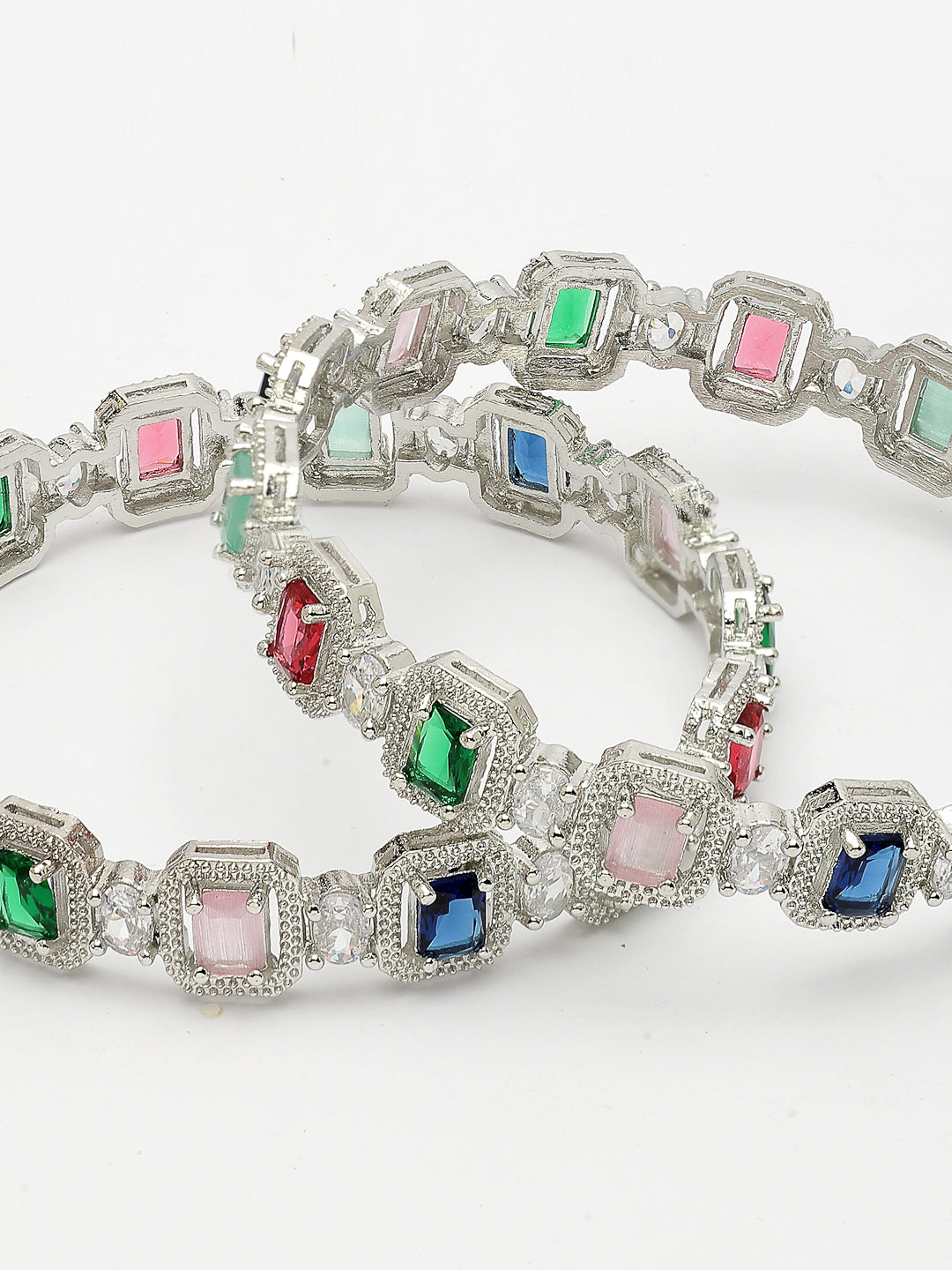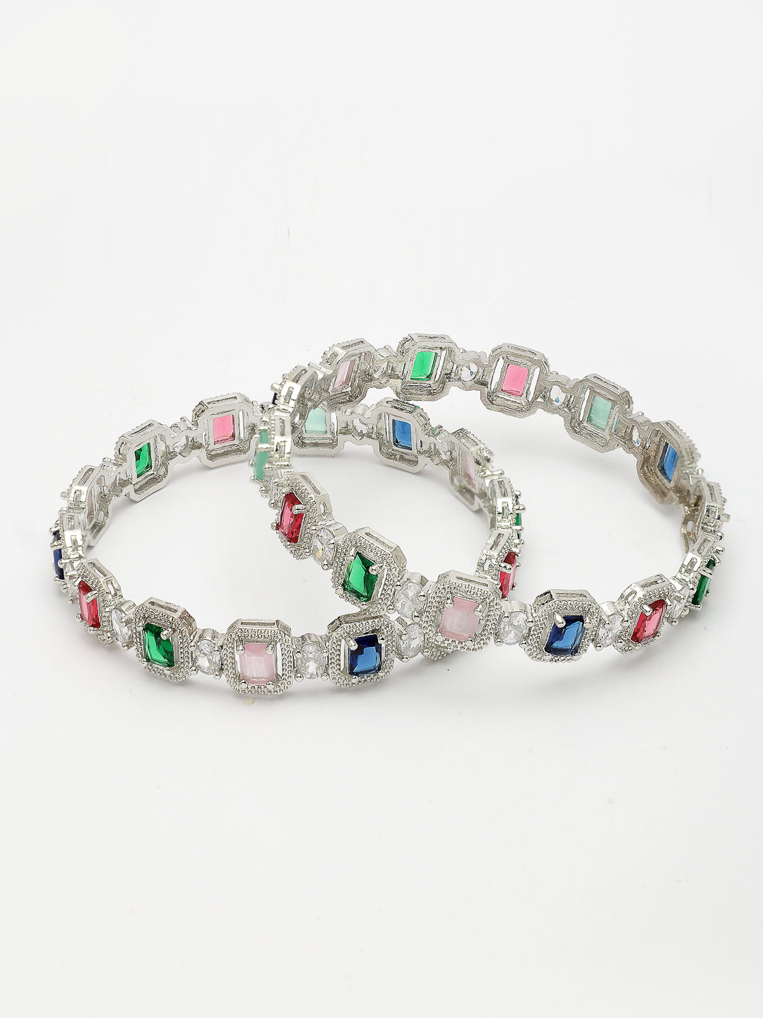 Style Note: The Nvr Women'S Set Of 2 Multicolor Silver-Plated American Diamond-Studded Bangles Offers A Vibrant Splash Of Elegance To Your Jewelry Collection. Each Bangle Features A Sleek Silver-Plated Finish, Adorned With Dazzling American Diamonds In A Spectrum Of Colors. The Multicolor Stones Add A Playful Yet Sophisticated Touch, Making These Bangles Perfect For Brightening Up Both Everyday Wear And Special Occasions. Lightweight And Comfortable, They Are Ideal For Layering Or Wearing Alone To Add A Unique Flair To Any Outfit. This Set Combines Contemporary Style With A Touch Of Luxury, Making It A Chic And Versatile Addition To Your Accessory Collection.