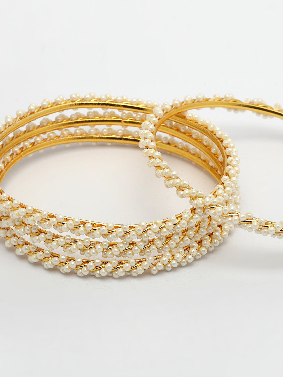 Style Note: Enhance Your Traditional Look With The Nvr Set Of 4 Gold-Plated Pearls Handcrafted Traditional Bangles For Women. These Bangles Feature An Intricate Design, Beautifully Adorned With Pearls That Add A Touch Of Elegance And Sophistication. The Gold-Plated Finish Adds A Warm, Timeless Glow, Making Them Perfect For Weddings, Festivals, Or Cultural Celebrations. Handcrafted With Attention To Detail, These Bangles Are Lightweight Yet Durable, Ensuring Comfort Throughout The Day. Their Classic Appeal Pairs Effortlessly With Sarees, Lehengas, Or Any Traditional Attire, Elevating Your Ensemble With A Graceful, Luxurious Touch.